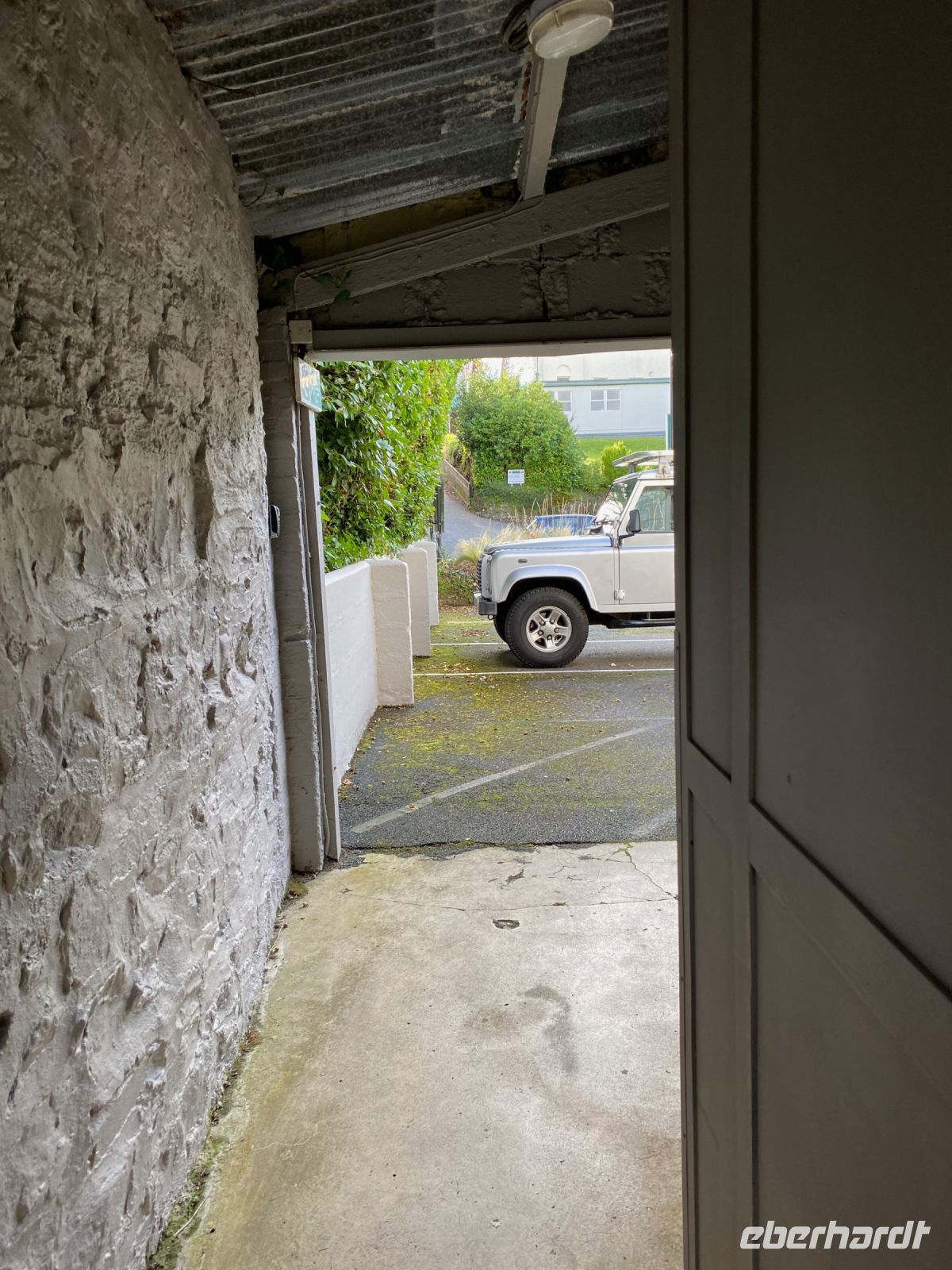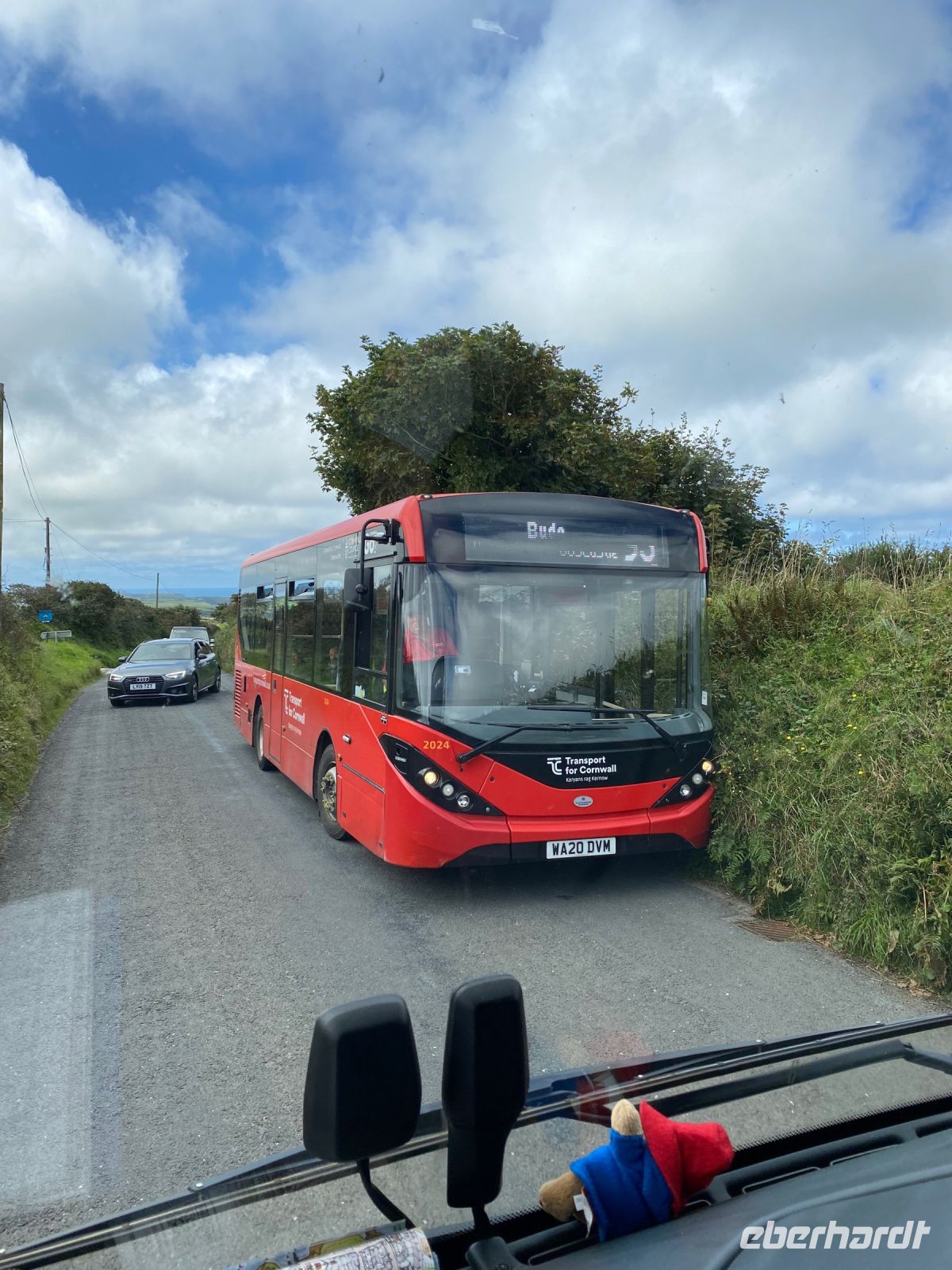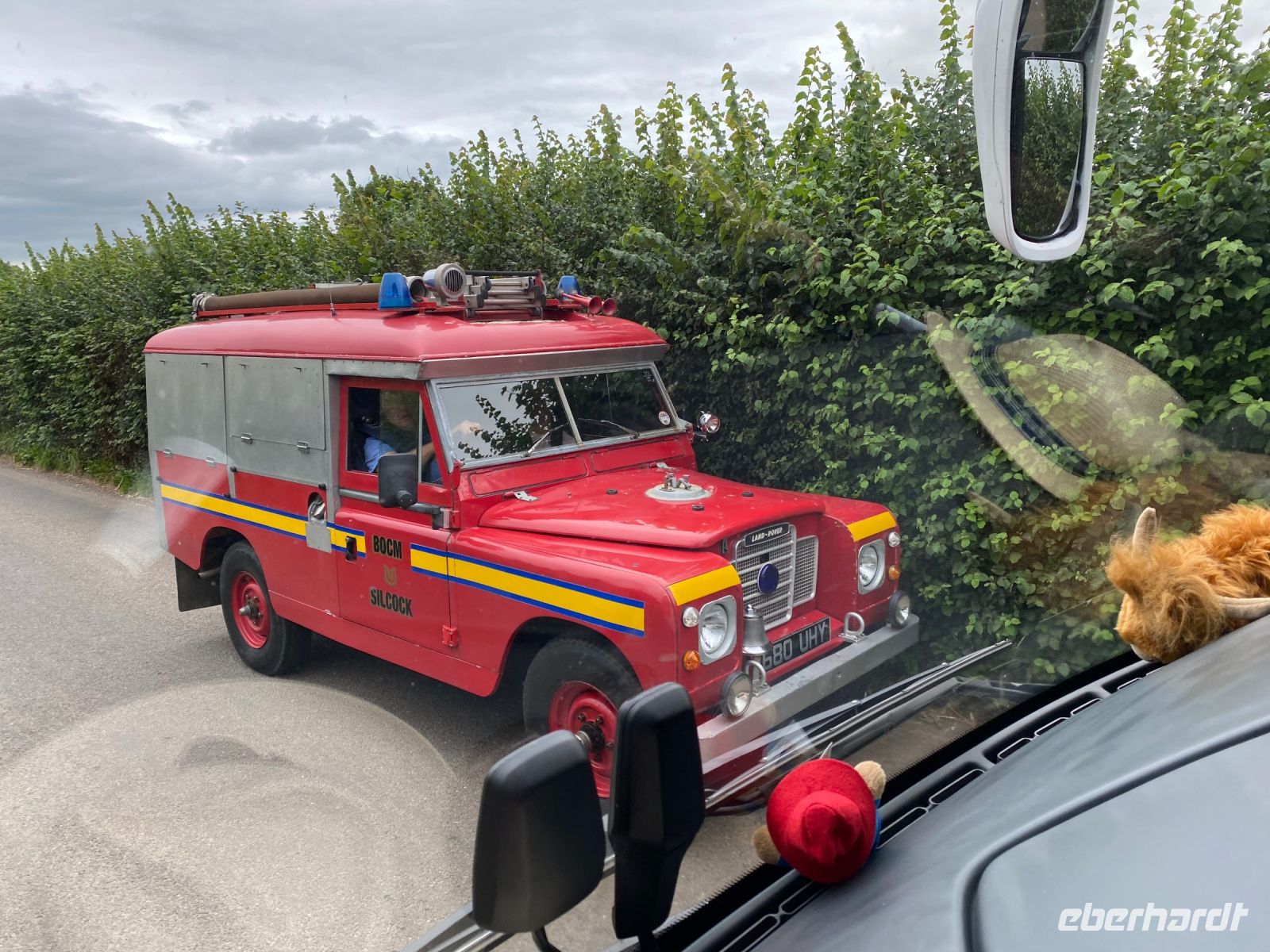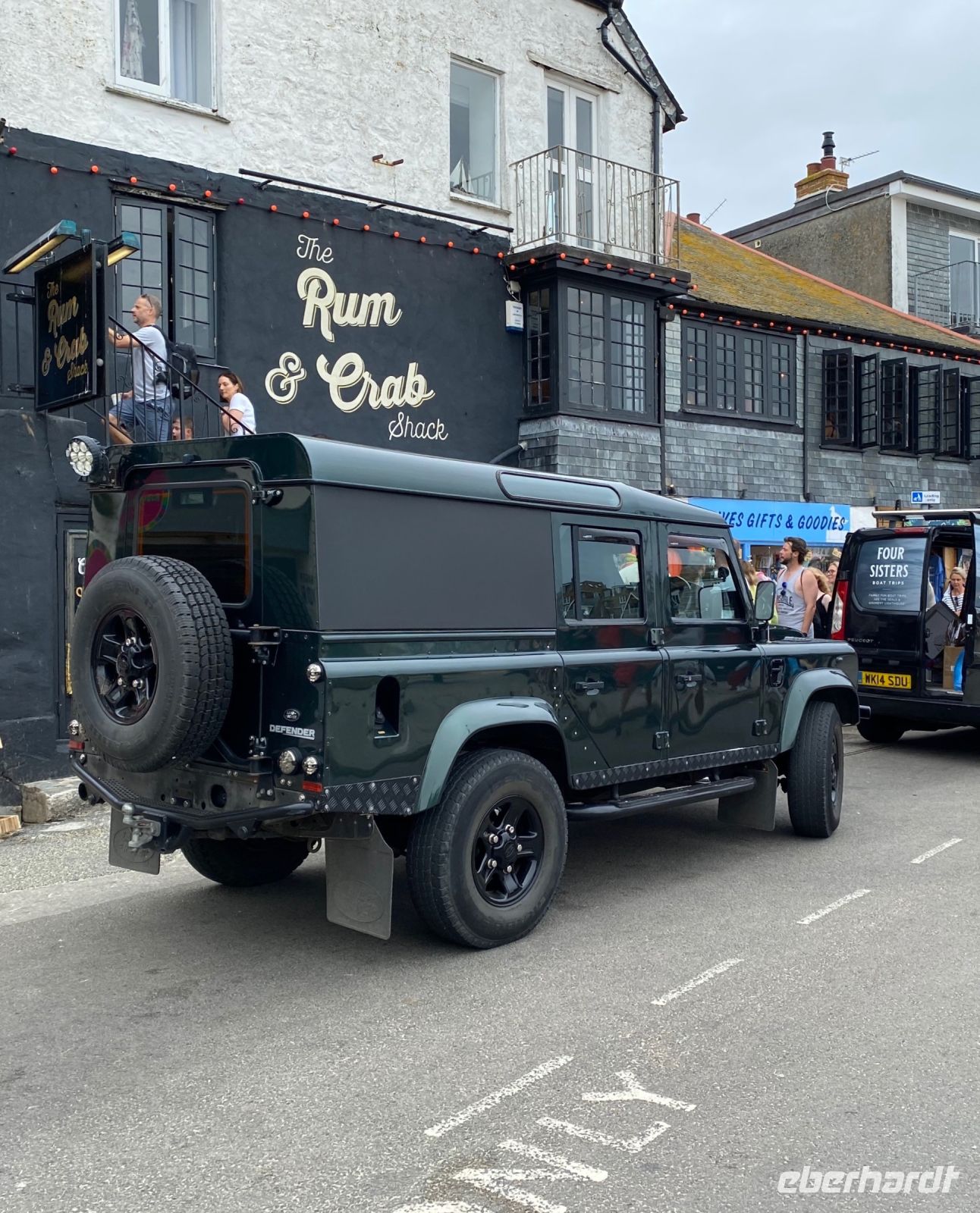 Schließlich ist es doch geschafft. Ohne den kleinsten Kratzer am Bus setzt unser Mark die Fahrt fort! Nun wissen wir jedenfalls, woher der Name Eng-Land stammen könnte. Es geht weiter nach Tintagel: Hier gibt es einen gut erreichbaren großen Parkplatz. Nach kurzem Fußweg kann unsere Gruppe direkt in stilvolle Land Rover Defender umsteigen, die uns an einer Karawane von Touristen vorbei nahe an den Eingang der Burgruine fahren.