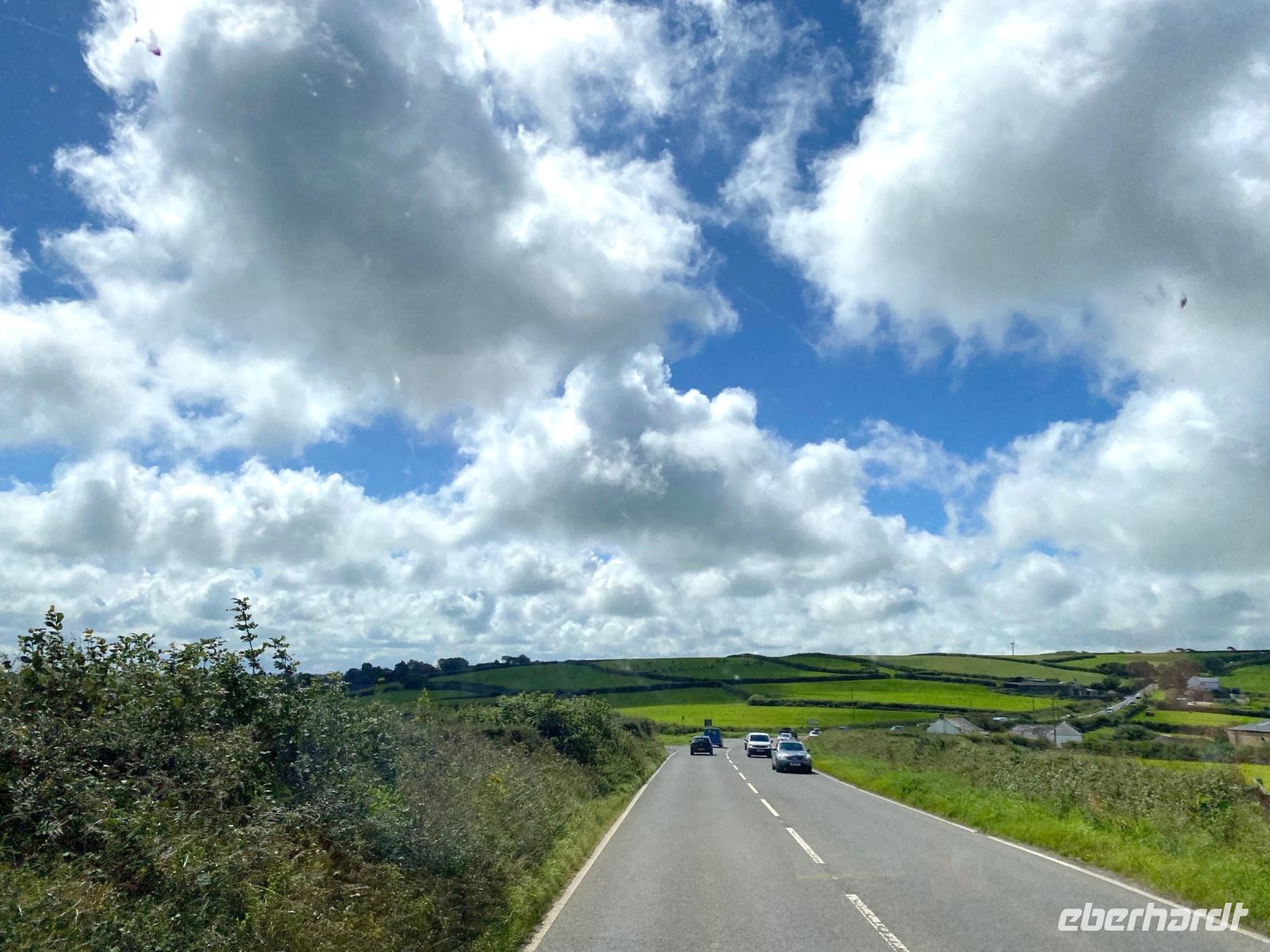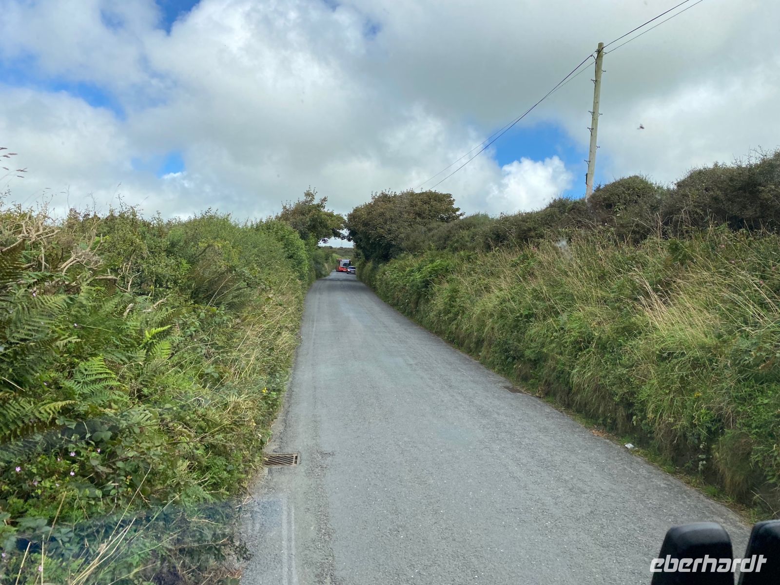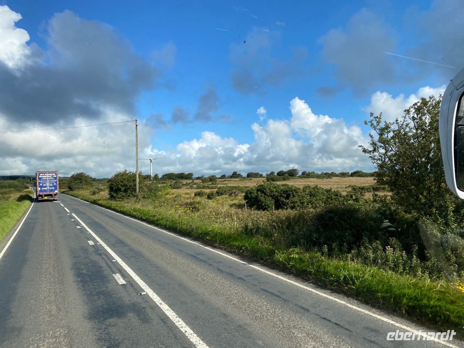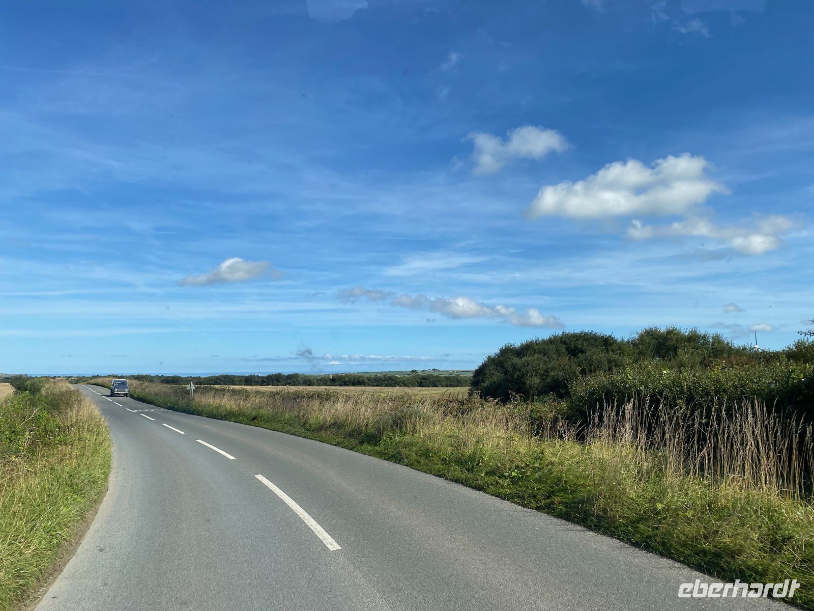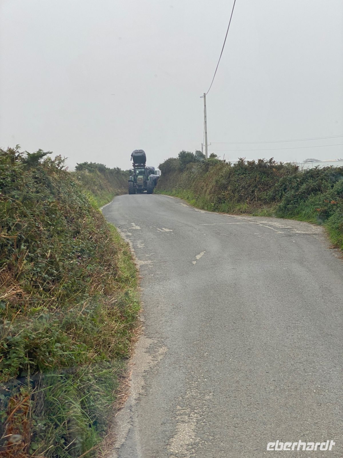 Auf der Rückfahrt begegnen wir an der engsten Straßenstelle einem gewaltigen Traktor mit Anhänger, vollbeladen mit Grasballen. Was nun? Im Prinzip ist es wohl so, dass die Fahrer immer besser werden, je größer ihr Fahrzeug ist. In Minutenschnelle rangiert der Traktorist sein Gefährt weit über hundert Meter zurück, bergauf um Kurven und dann rechtwinklig in eine Feldeinfahrt hinein, very impressive! Ein kurzer Gedanke an den Kleinwagen von Boscastle, der keine 15 Meter rückwärts geradeaus schaffte, verfliegt rasch wieder. Bald schon sind wir wieder auf einer großen Straße, die in England A-road genannt wird.