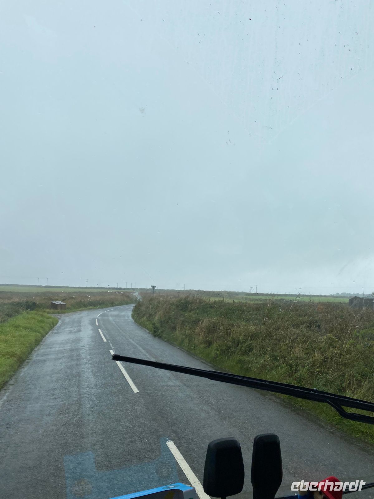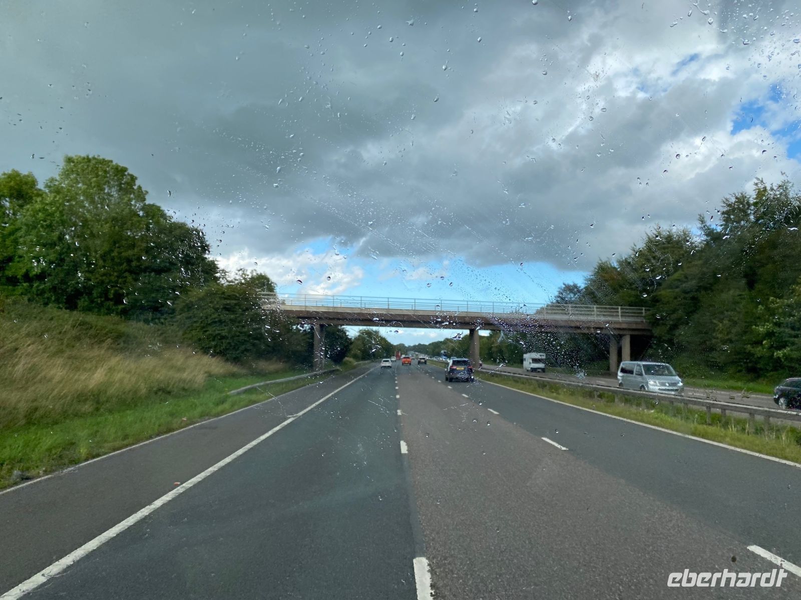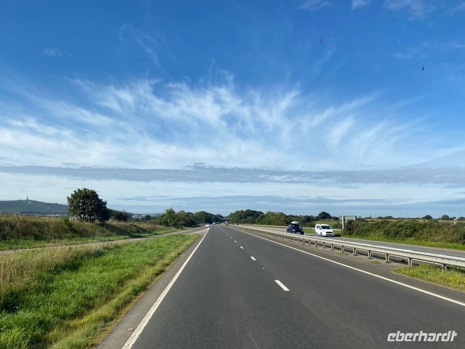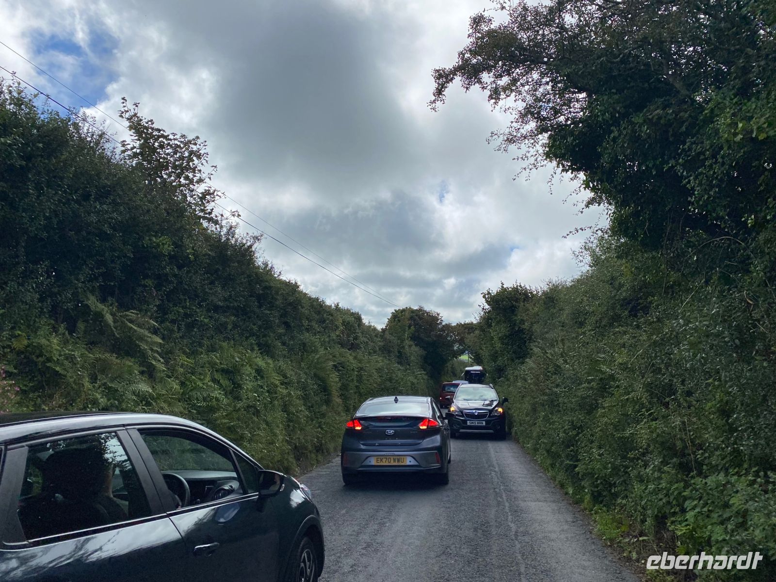Auf der Rückfahrt begegnen wir an der engsten Straßenstelle einem gewaltigen Traktor mit Anhänger, vollbeladen mit Grasballen. Was nun? Im Prinzip ist es wohl so, dass die Fahrer immer besser werden, je größer ihr Fahrzeug ist. In Minutenschnelle rangiert der Traktorist sein Gefährt weit über hundert Meter zurück, bergauf um Kurven und dann rechtwinklig in eine Feldeinfahrt hinein, very impressive! Ein kurzer Gedanke an den Kleinwagen von Boscastle, der keine 15 Meter rückwärts geradeaus schaffte, verfliegt rasch wieder. Bald schon sind wir wieder auf einer großen Straße, die in England A-road genannt wird.