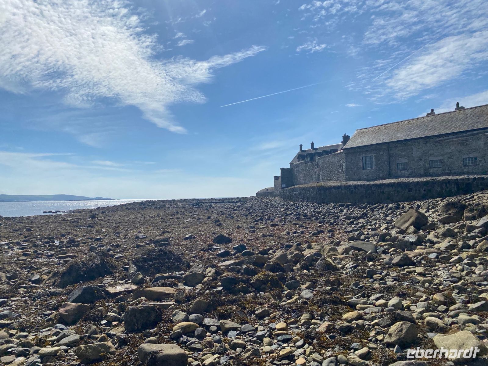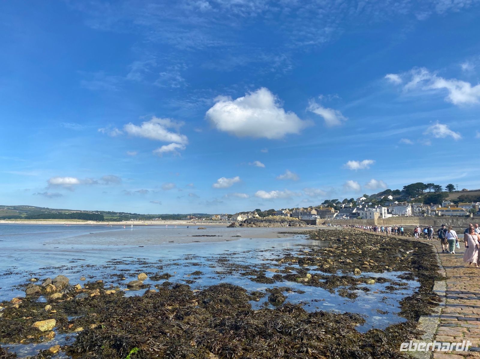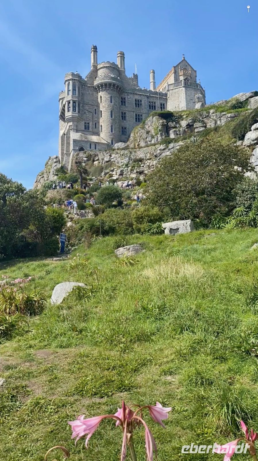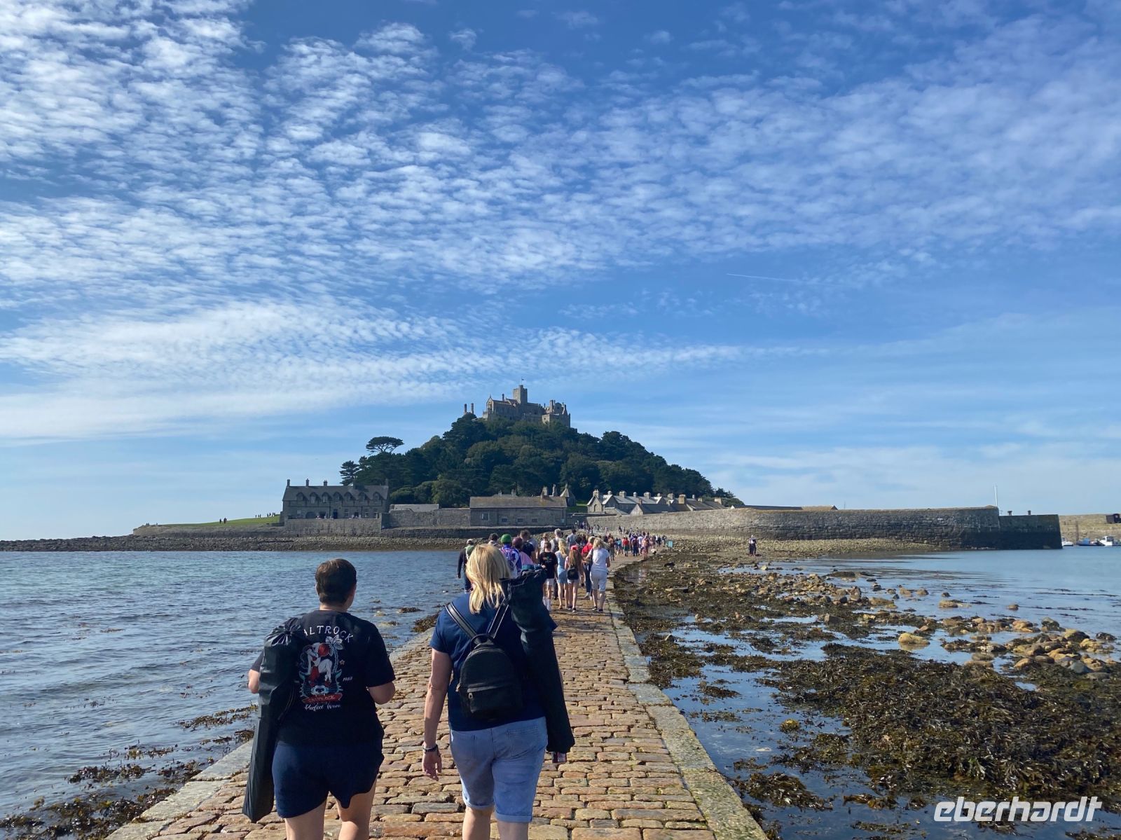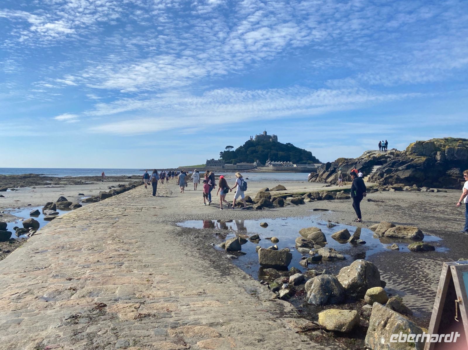 Von hier geht es ein Stück zu Fuß über das Meer, zur Insel St. Michael‘s Mount. Kein Problem für uns, es herrscht wieder Ebbe – und wunderbares Wetter natürlich. Auf der Insel gibt es eine verwinkelte Burg, die Reste eines alten Klosters und einen wundervollen Garten zu besichtigen. Außerdem können wir hier hervorragenden Kuchen essen. Zufrieden geht es zurück ans Festland, die Ebbe ist weiter auf unserer Seite.