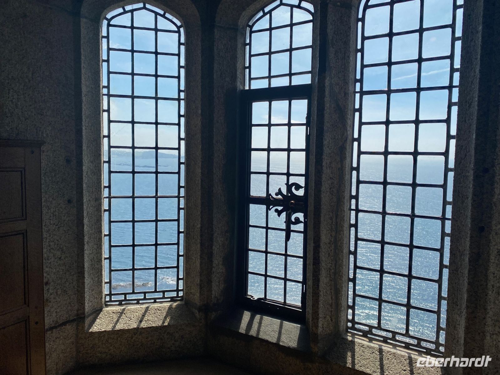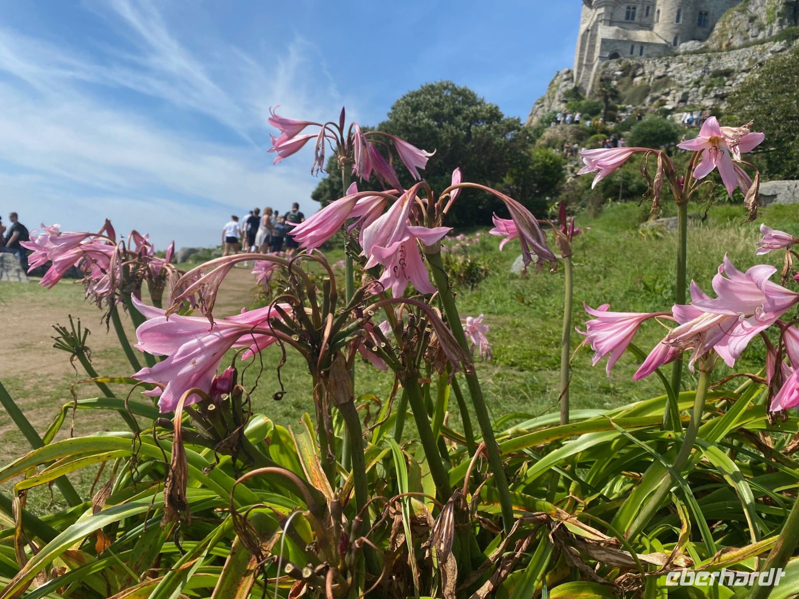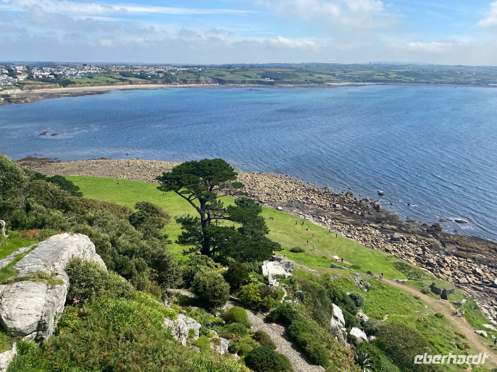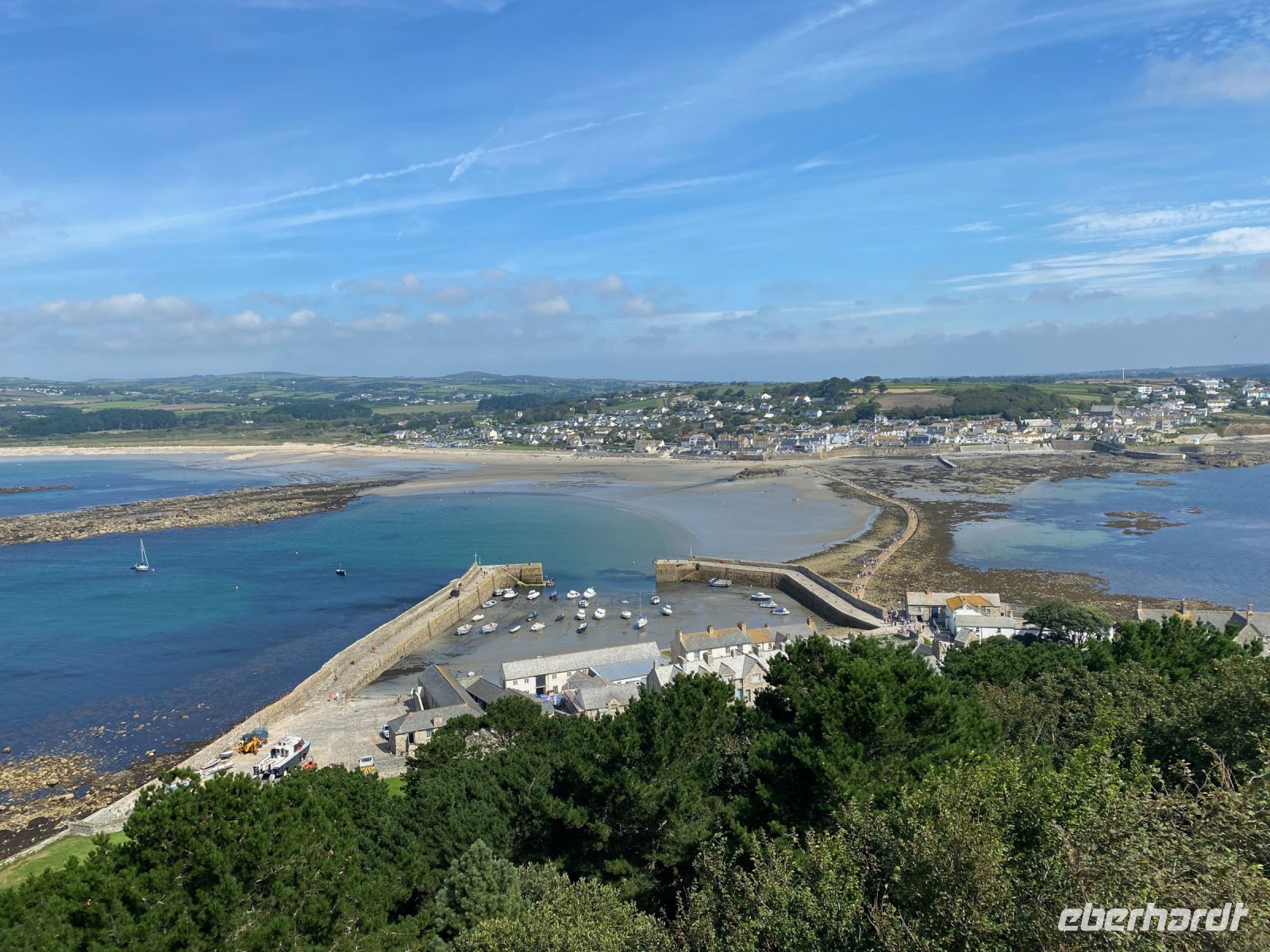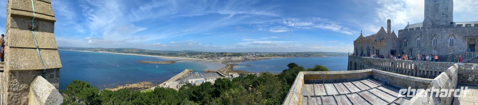 Von hier geht es ein Stück zu Fuß über das Meer, zur Insel St. Michael‘s Mount. Kein Problem für uns, es herrscht wieder Ebbe – und wunderbares Wetter natürlich. Auf der Insel gibt es eine verwinkelte Burg, die Reste eines alten Klosters und einen wundervollen Garten zu besichtigen. Außerdem können wir hier hervorragenden Kuchen essen. Zufrieden geht es zurück ans Festland, die Ebbe ist weiter auf unserer Seite.