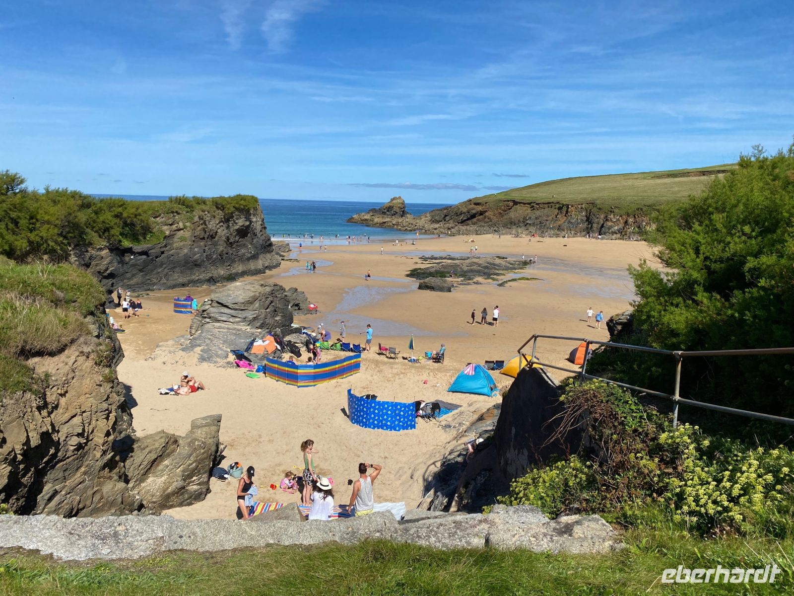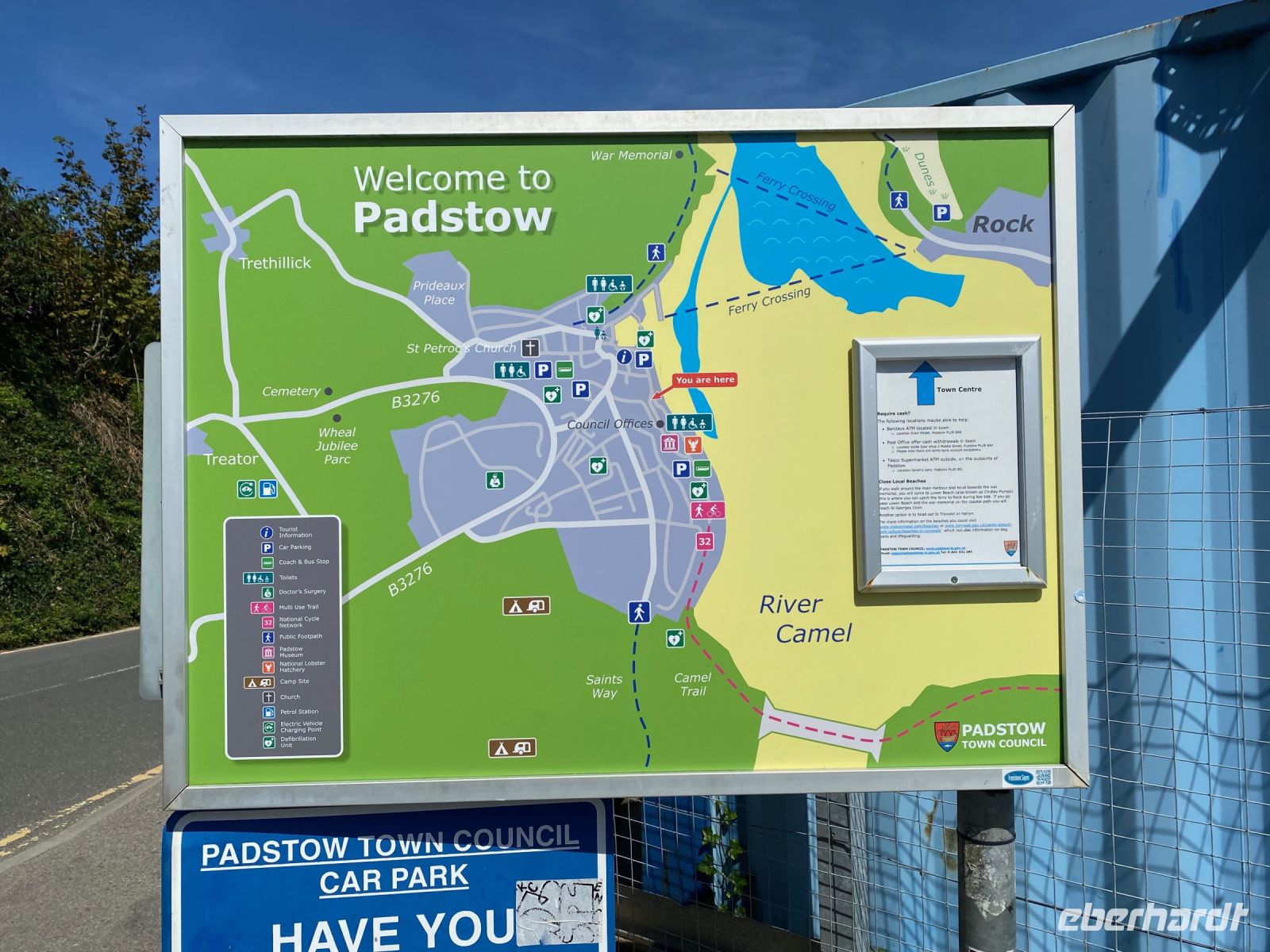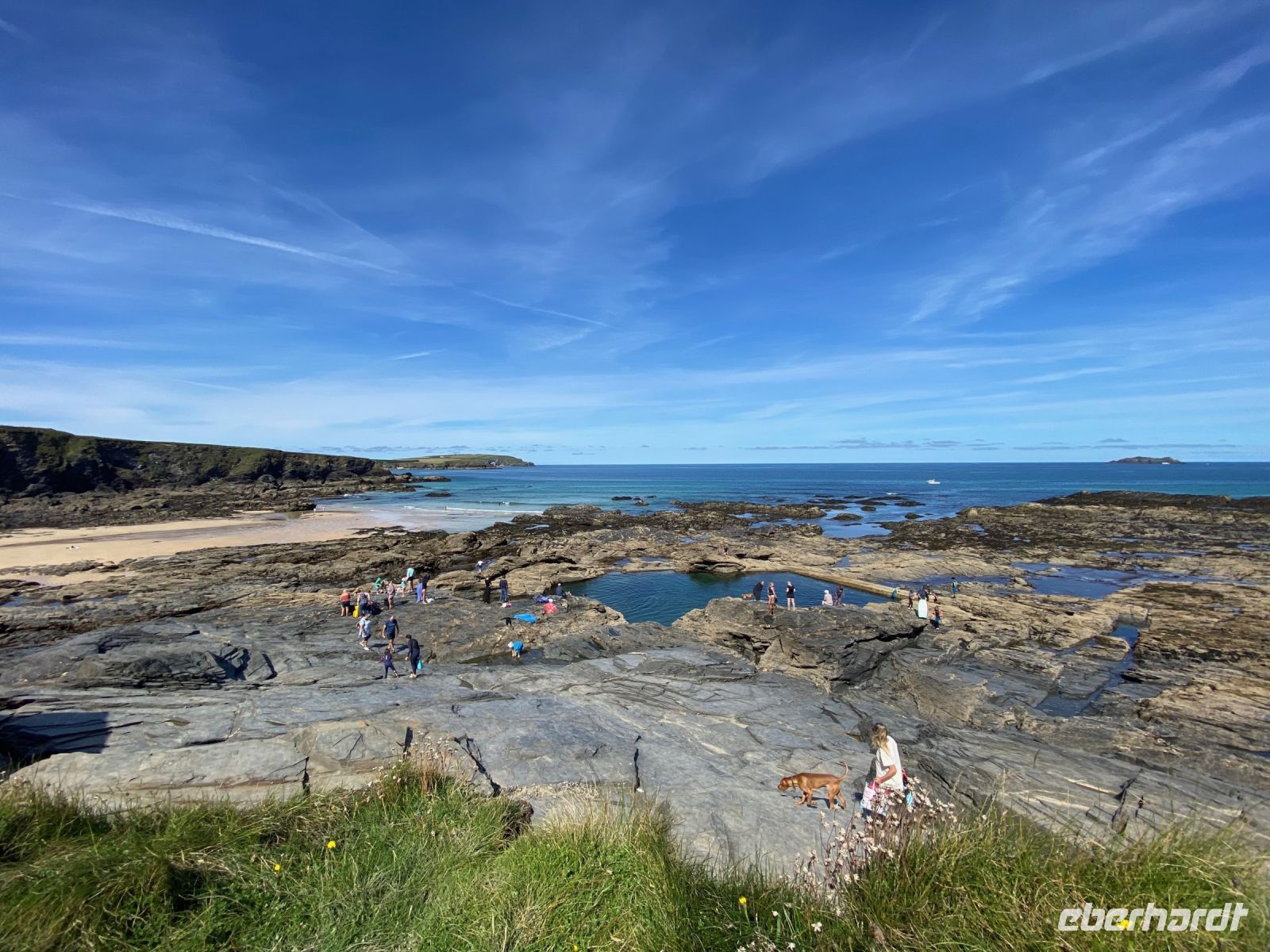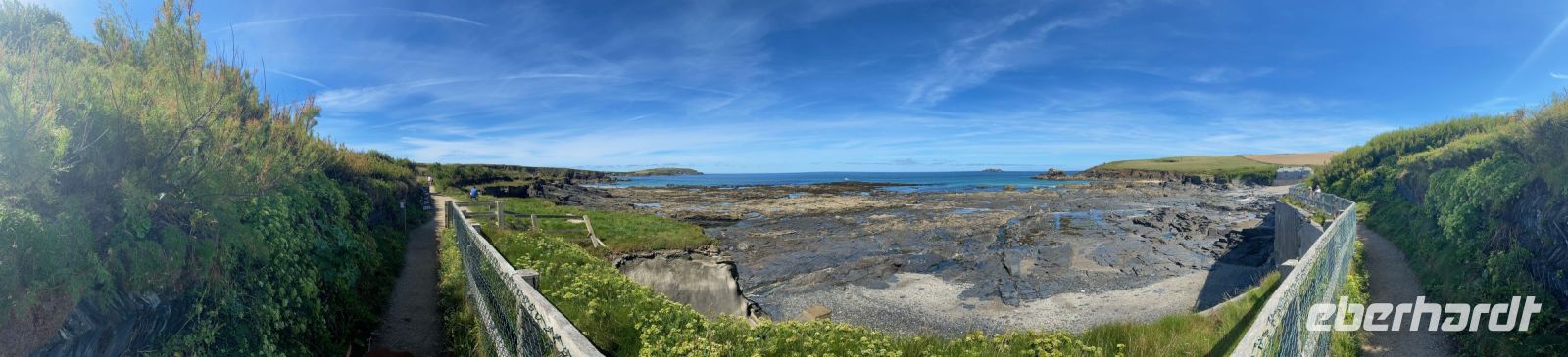 Heute geht es wieder ans Meer. In Trevone Bay wartet ein wunderschöner Strand auf uns. Dieser Ort ist ein kleiner Geheimtipp und nur durch eine kurze Wanderung zu erreichen. Unser Fahrer Mark hat zwei freie Tage, Mike sein freundlicher Vertreter für heute, bringt uns bis zur örtlichen Bushaltestelle. Dort treffen ihn nach etwa zwei Stunden wieder und nun geht es weiter nach Padstow, einem kleinen Fischerort. Wie immer erwartet uns wundervolles Wetter – und Ebbe. Kein schlechter Deal muss man sagen!