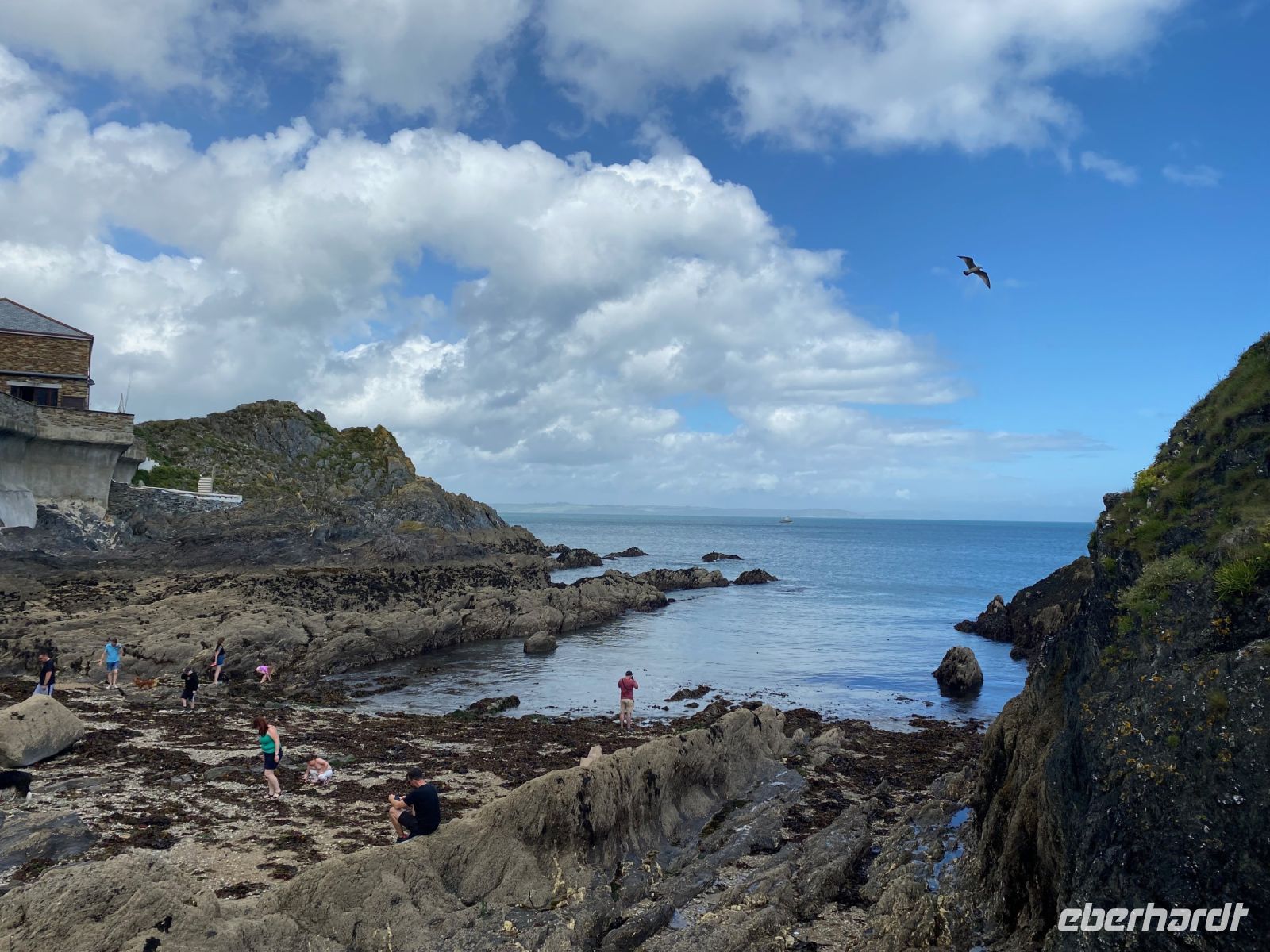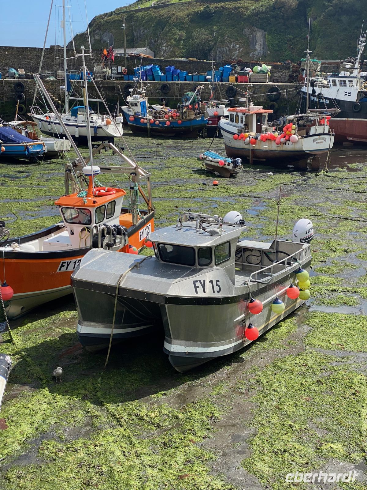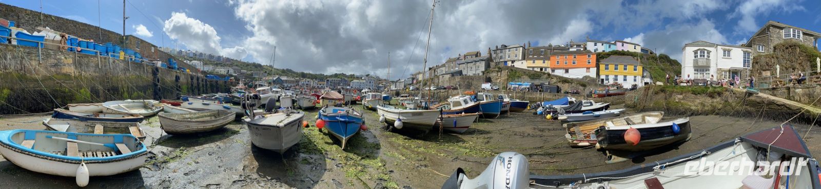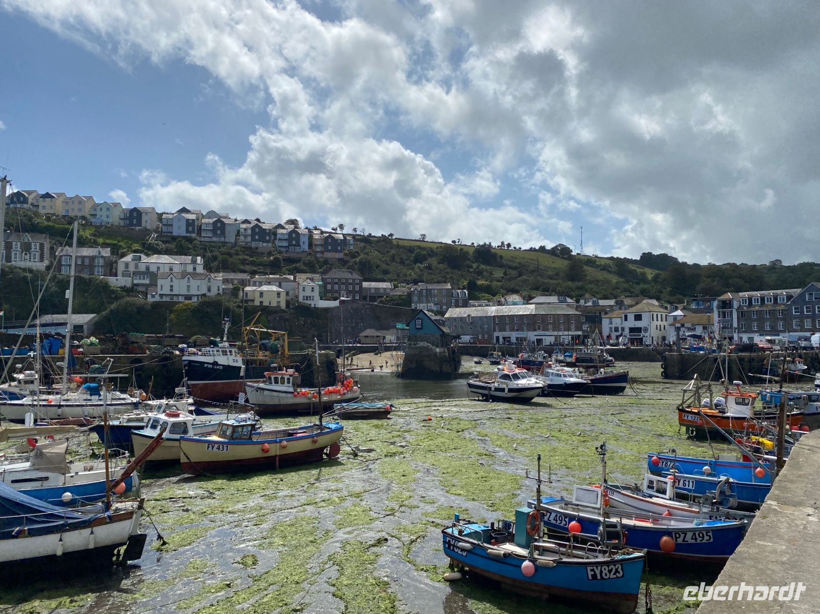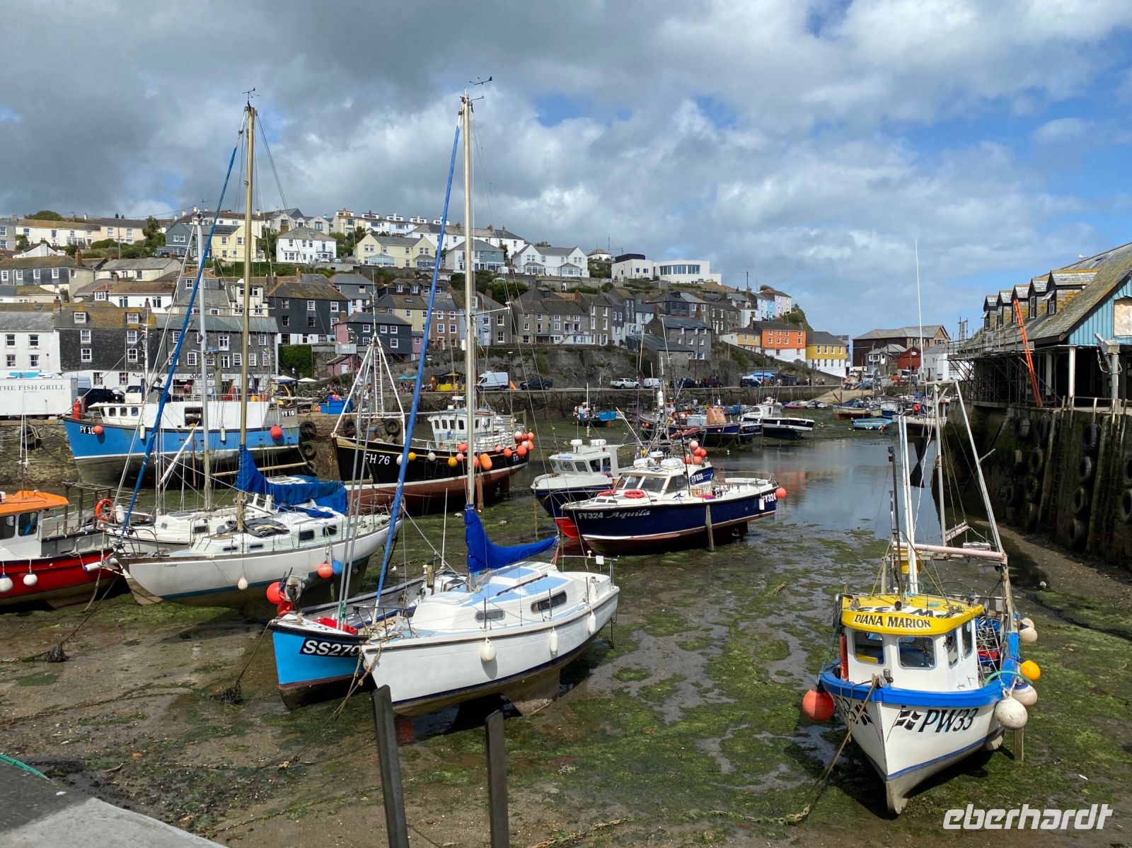 Ganz nahe an den Gärten liegt der Ort Mevagissey, unsere nächste Station. Ein ganz besonders kleiner Hafen erfreut uns hier mit Sonnenschein – und Ebbe. Vielleicht, weil wir mit Ebber-hardt TRAVEL reisen?