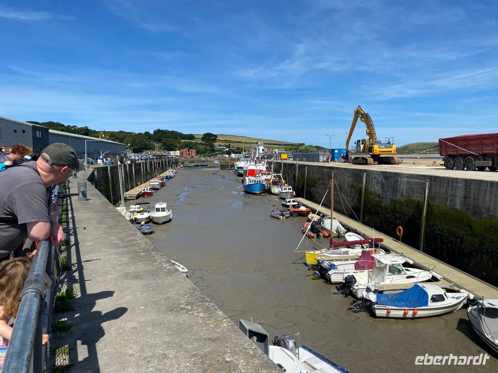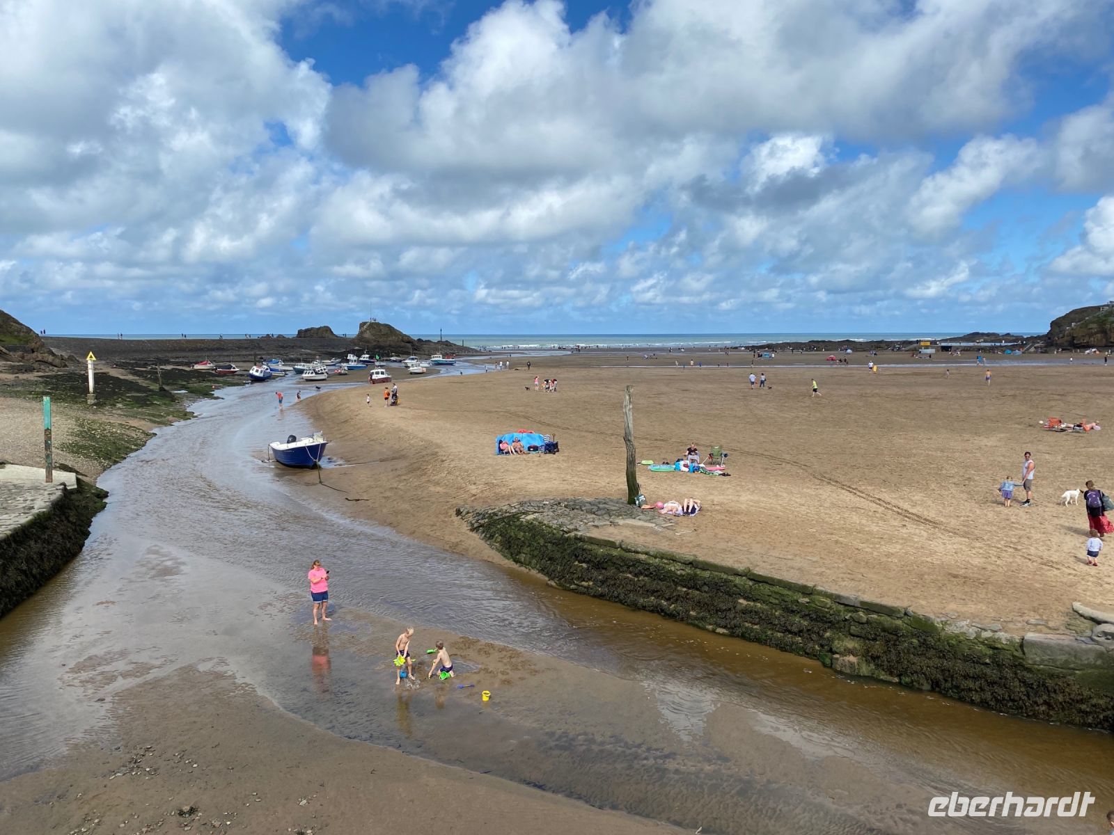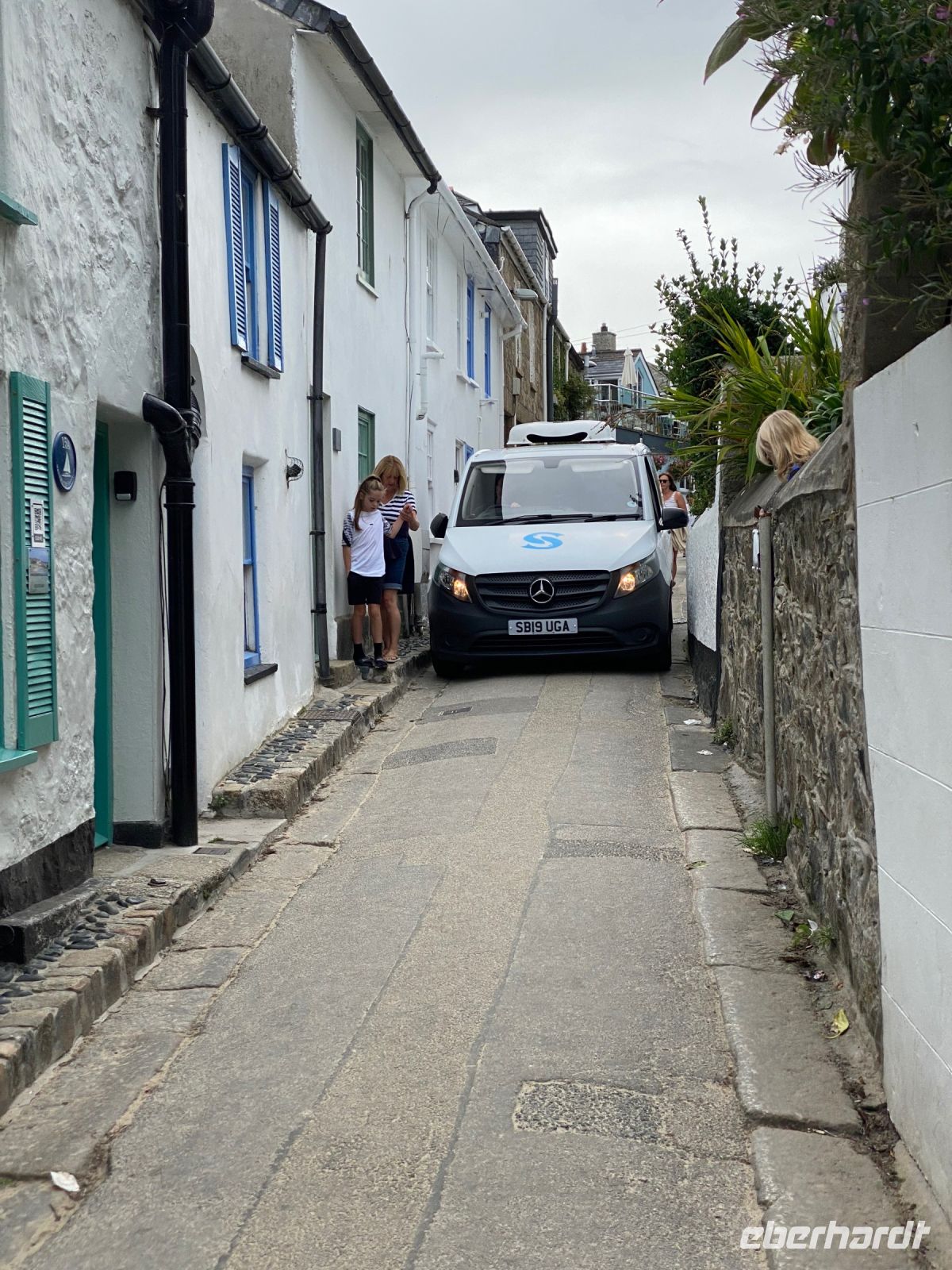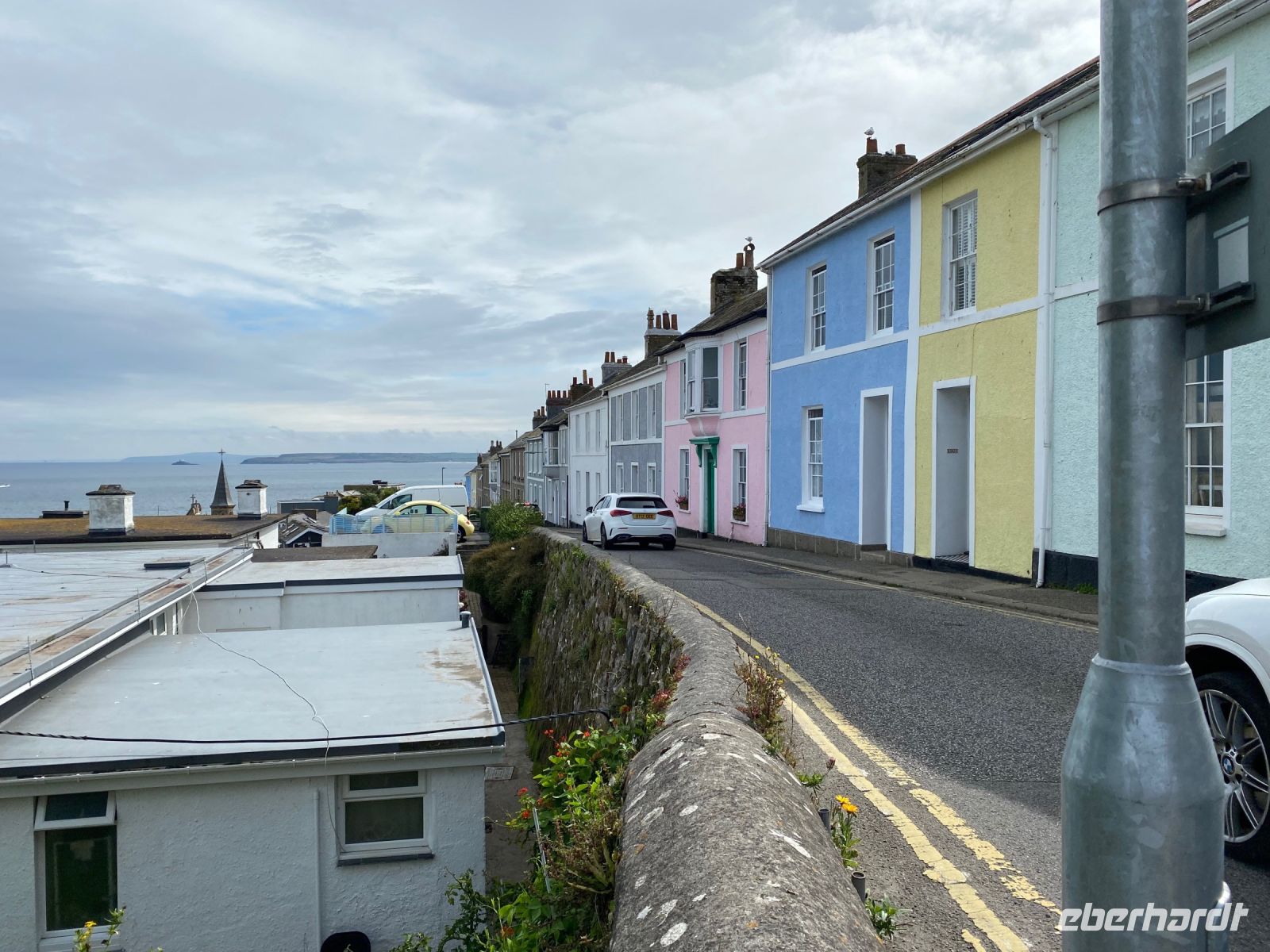 Ganz nahe an den Gärten liegt der Ort Mevagissey, unsere nächste Station. Ein ganz besonders kleiner Hafen erfreut uns hier mit Sonnenschein – und Ebbe. Vielleicht, weil wir mit Ebber-hardt TRAVEL reisen?