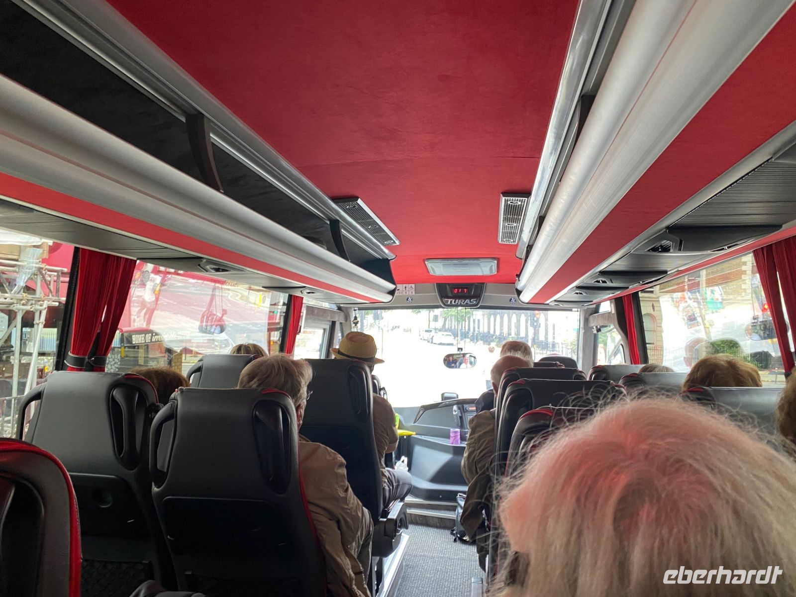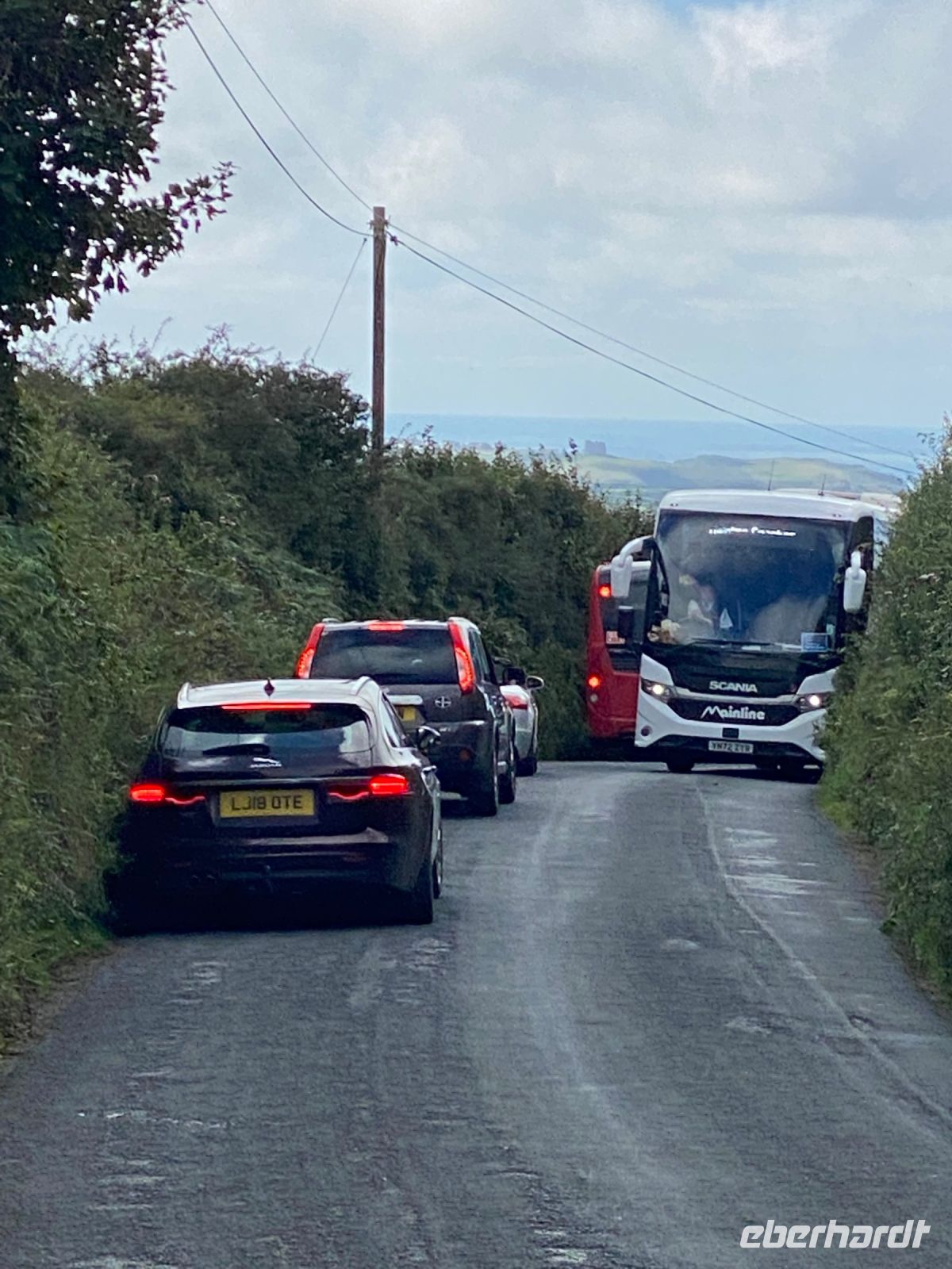 Auf der Rückfahrt schafft es schließlich der Fahrer eines winzigen Kleinwagens den Moment des Ausweichens an der richtigen Stelle zu verpassen, so wird die zweite Begegnung mit einem Linienbus nun zur Nervenprobe. Es kostet fast eine halbe Stunde Zeit, den Stau wieder aufzulösen. Unser Bus und der Linienbus rangieren nun schon im Bereich von Zehntelmillimetern während der Verfasser dieses Berichts auf offener Straße gemeinsam mit hilfsbereiten Menschen den Verkehr zum Rückwärtsfahren und Ausweichen überredet. Nur das kleine blaue Auto, mit dem aller Ärger begann, steht noch länger im Weg herum, sein Fahrer kann nicht rückwärts bergauf fahren!