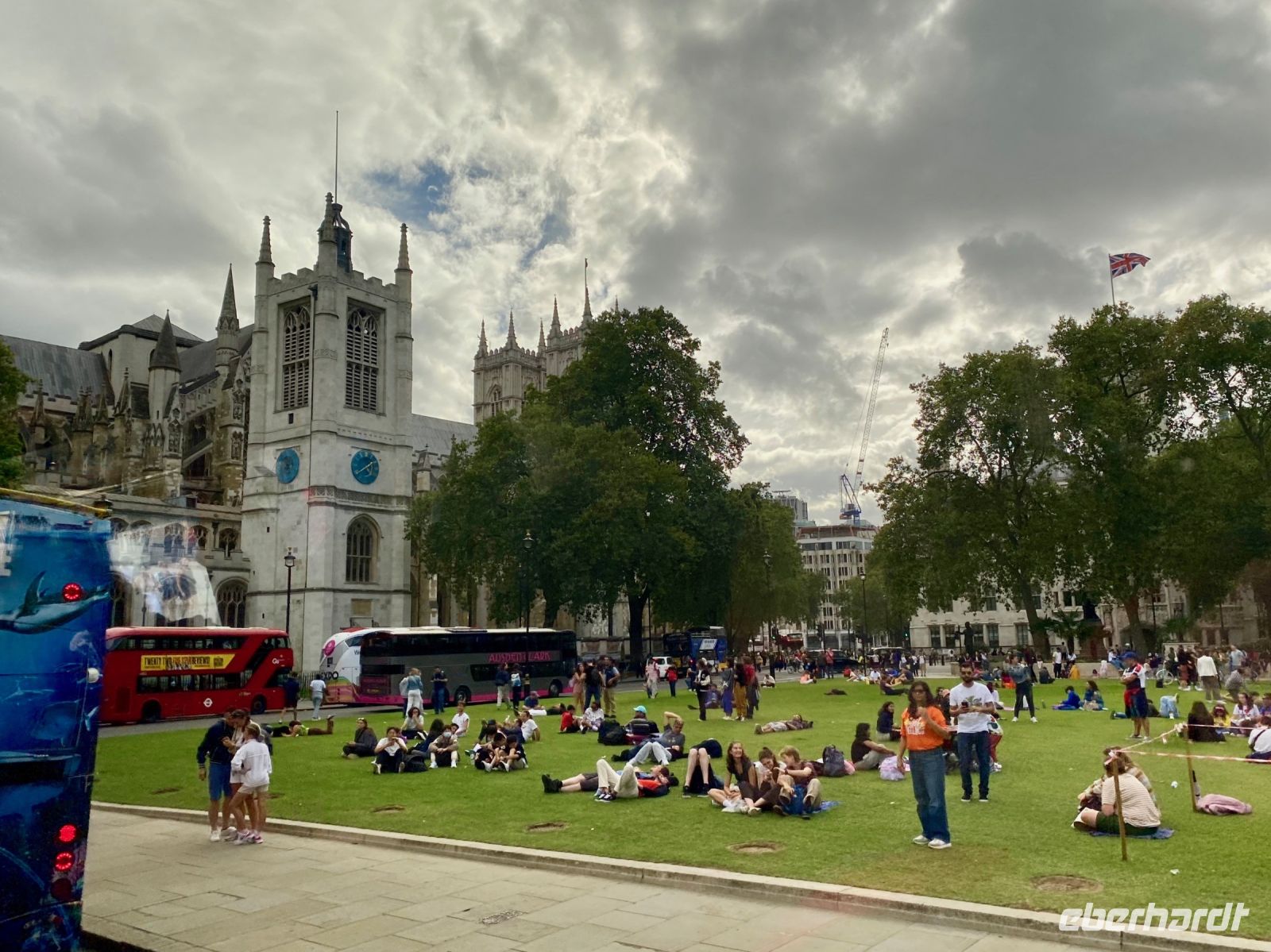 Wir haben alle ausreichend Zeitreserven für Unvorhergesehenes, das erfreulicherweise gar nicht eintritt. Selbst am berüchtigten BER klappt alles bestens und in Frankfurt steigen schon 14 der 16 Gruppenmitglieder gemeinsam in den Flieger nach London. Nur mit leichter Verspätung erreichen wir London Heathrow und laufen noch ein bisschen im Zickzack zur automatischen Passkontrolle. Nummer 15 ist von München direkt geflogen und stößt planmäßig zu uns, ihre Tochter ist schon seit Berlin dabei!