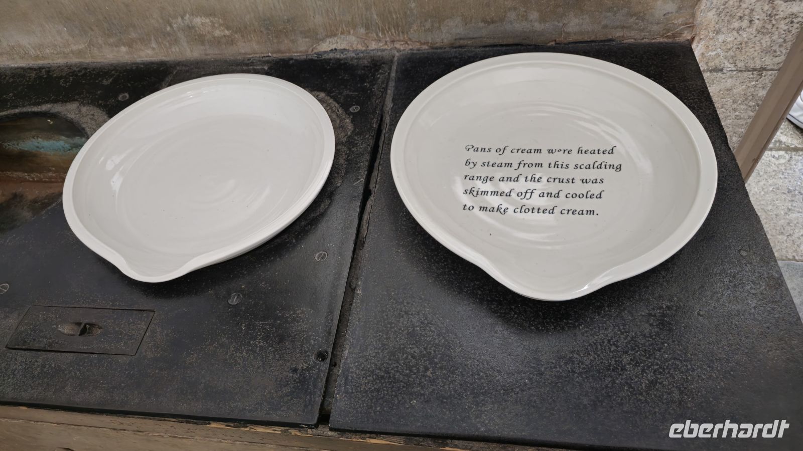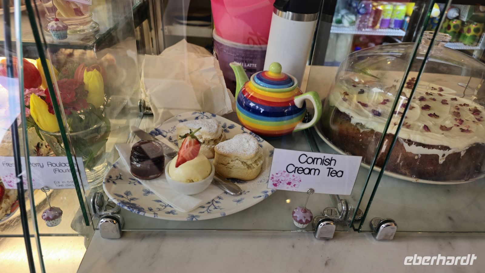 Heute hat Ian, unser Busfahrer, seinen freien Tag. Am Bus begrüßt uns daher Josh. Mit ihm fahren wir zuerst nach Trevone. Als wir St. Austell verlassen sehen wir nicht nur ein gigantisches Straßenbauprojekt sondern auch die riesigen Abraumberge. Überbleibsel des Kaolinabbaus. Heute tragen Sie den Namen: die kornischen Alpen. Ja und die weißen Spitzen erinnern tatsächlich ein wenig an die Alpen. Je näher wird der Küste kommen umso enger werden die Straßen. Zu allem Unglück taucht auch noch ein Schild "Straße gesperrt" auf. Ein entgegenkommender Lkw-Fahrer, den wir anhalten und fragen, bestätigt uns aber, dass wir trotzdem unser Ziel Trevone Bay erreichen können und so fährt Josch weiter. In einer 90° Kurve allerdings passiert es dann: wir kommen mit dem großen Bus nicht um die Kurve und so kratzt er empfindlich an der Mauer entlang. Der schöne nagelneue Bus. Es hilft alles nichts, Josh fährt uns zum Parkplatz an der Bucht, wir erholen uns erst einmal von dem Schreck und dann genießen wir die Zeit hier am Atlantik. Die Sonne verwöhnt uns und einige von uns sind nicht nur mit den Füßen im Wasser. Josh versucht in der Zwischenzeit, einen Ersatzbus zu bekommen. Das gelingt auch und zur vereinbarten Zeit treffen wir uns wieder und werden nach Padstow gebracht. Am Hafen steigen wir aus und spazieren gemeinsam in den Ort. Rick Stein, der Fisch- Papst, hat hier sein Refugium und auf der gegenüberliegenden Seite wohnt Gordon Ramsay. Also beste Voraussetzungen für eine perfekte Mittagspause. Wer mochte konnte um den Hafen herum spazieren, der geschützt in einer Bucht lag. Ein kleiner Aufstieg und dann konnte man den Blick über den Atlantik schweifen lassen. Am Parkplatz dann große Freude: Josh hatte es mit der Unterstützung von drei Einweisern geschafft, die Engstellen zu passieren mit unserem Bus und jetzt wartete unser Bus wieder auf uns und konnte uns zum nächsten Ziel bringen. Einziger Wermutstropfen war, dass er heute noch in die Werkstatt musste und wir daher unser nächstes Ziel zeitlich etwas verknappen mussten. Und dieses Ziel war nichts anderes als Prideaux Place. Noch dazu war ein Cream Tea für uns vorbereitet. Den Besuch hier und auch den Cream Tea mussten wir nun also in der Hälfte der geplanten Zeit schaffen. Wir teilten unsere Gruppe auf: Hildi führte die Gruppe in deutscher Sprache durch das Haus und Henrietta führte die Gruppe durch das Haus, die mit einer englischen Führung gut zurecht kamen. Henrietta selbst gehört zur Familie Prideaux- Brune und erzählte stolz von ihren Vorfahren und dem gegenwärtigen Leben hier. Die Räume die wir anschauen konnten, werden auch heute noch von der Familie genutzt, so treffen sie sich im großen Speisesaal immer noch zu den Weihnachtsfeierlichkeiten und dem gemeinsamen Essen. Im Café waren bereits die Tische für uns gedeckt und so ließen wir uns die Scones mit Clotted Cream und Jam und den Tee schmecken. Dann hieß es schon wieder: Aufbruch und ein sichtlich geknickter Josh fuhr uns zurück zu unserem Hotel.