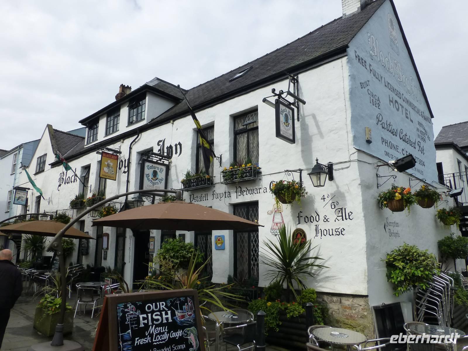 Mit der Ffestinog Railway, der ältesten in Betrieb befindlichen Schmalspurbahn der Welt, fahren wir von Porthmadog nach Bleanau. Ursprünglich gebaut um den Schiefer aus den Gruben zum Hafen nach Porthmadog zu transportieren, nutzen heute ausschließlich Touristen diese Bahn. Gemächlich zuckeln wir bergan, genießen den Blick in die herrliche Natur. Nach etwas mehr als einer Stunde Bahnfahrt wartet unser Chauffeur Phil am Bahnhof. Weiter geht die Fahrt nach Bleaneau zur Llechwed Slate Cavern. Schieferbergbau bestimmte hier einmal das ganze Leben, vor allem im 19. und beginnenden 20. Jh. Heute wird immer noch Schiefer abgebaut, allerdings auf kleinem Nivau mit ca. 200 Arbeitskräften. Früher waren es tausende die hier ihr tägliches Brot verdienten. Von der Blütezeit zeugen heute vor allem die Schieferhalden rund um den Ort. Auf ein Kilo gebrauchsfertigen Dachschiefer entfielen 9 Kilo Abfall. Wie fahren in die Deep Mine ein und machen unter Tage einen Rundgang durch mehrere Kavernen, riesige Hohlräume. Dabei erfahren wir unter welch schweren Bedingungen die Arbeiter im 19 Jh. den Schiefer abgebaut haben. Dann wird es Zeit aufzubrechen, bis Fishgaurd, unserem nächsten Übernachtungsort, sind es gut drei Stunden Fahrt. Übernachten werden wir heute bei Christina im Cartreff B&B Hotel.