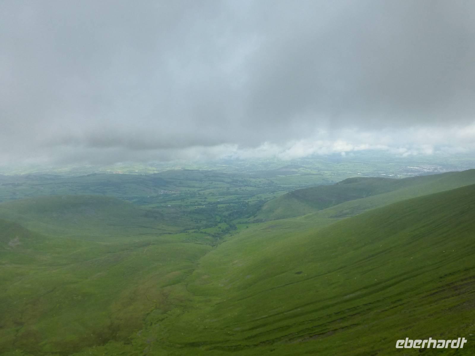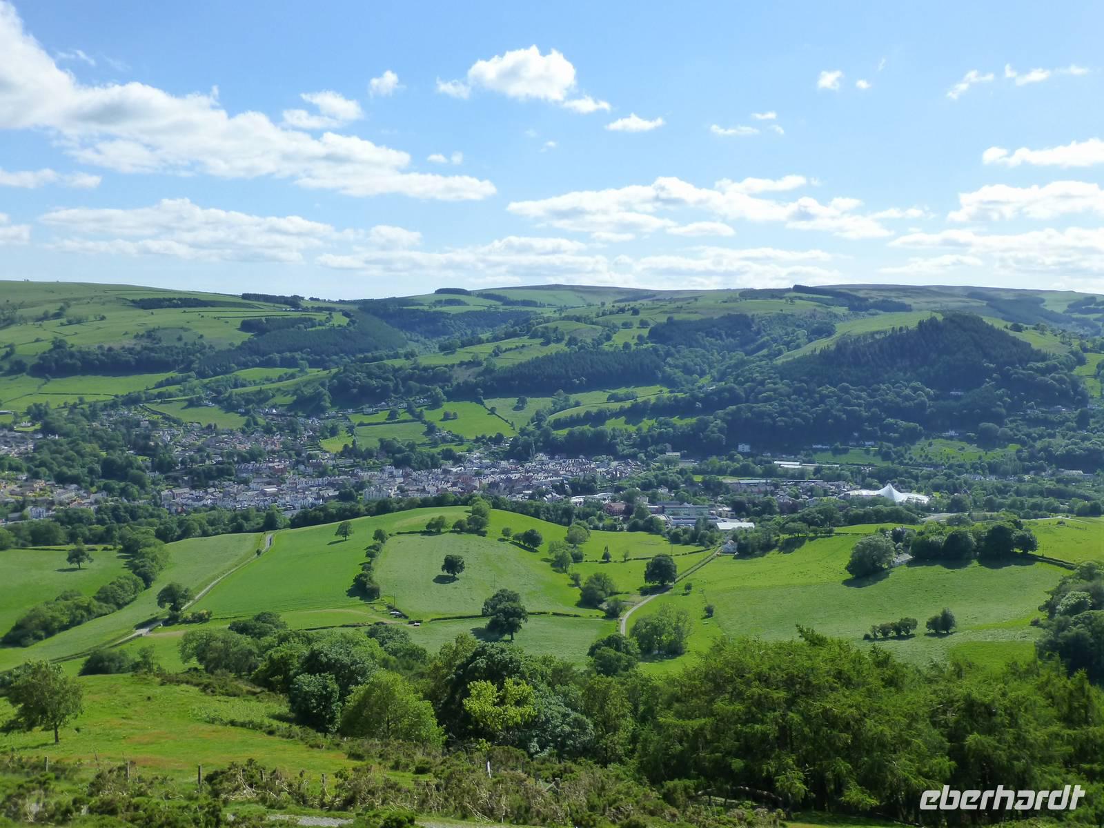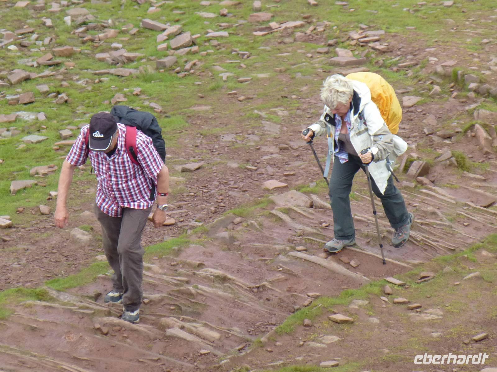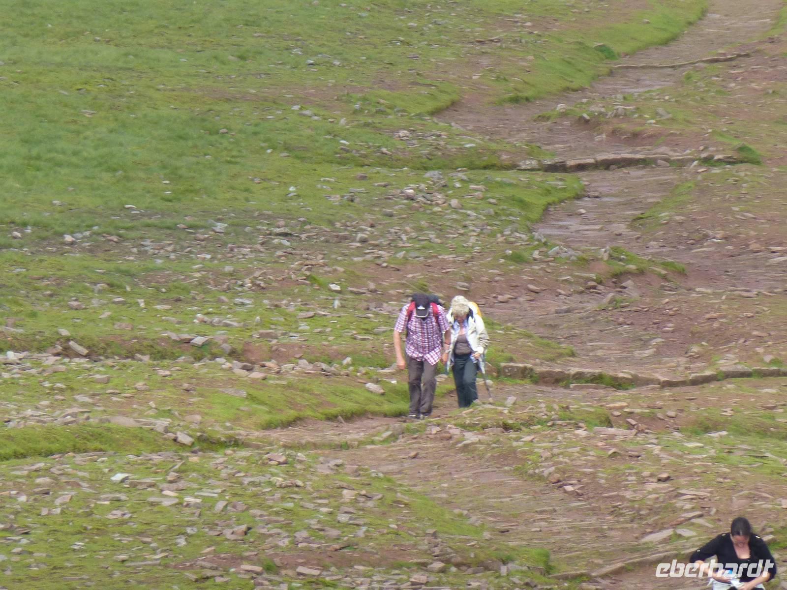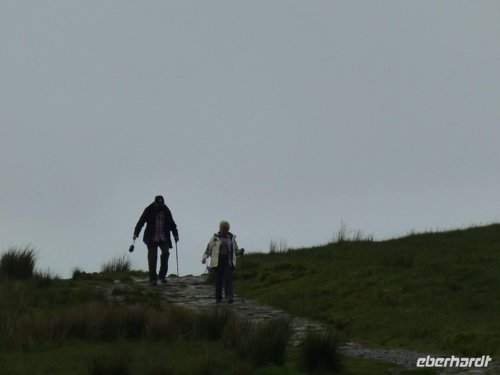Heute, an unserem letzten gemeinsamen Wandertag, zeigt sich der Himmel bewölkt. Auf dem Programm steht der Pan-y-Fan, mit 886 m der höchste Berg in Südwales. Und dieser versteckt sich auch etwas in den Wolken. Etwas Achtung haben wir alle vor dieser Wanderung, geht es doch 450 Höhenmeter hinauf und auch wieder hinunter. Wir wagen es trotz der Wolken, wir können nur gewinnen. Als wir losgehen überrascht uns als erstes ein Regenschauer. Der gut ausgebaute Weg startet bei Storey Arms, einer früheren Postkutschenstation. Nach einem ersten Anstieg wir die Strecke etwas flacher um dann steil hinauf auf den 870 m hohen Corn Du (sprich Corn Di) zu führen. Hat man diesen Gipfel erreicht ist der Rest ein Kinderspiel, wenige Höhenmeter sind es noch und das Ziel ist erreicht. Als Lohn für die Mühe, so kann man es ruhig nennen, reißt die Wolkendecke auf und wir können das komplette Panorama vom Berg aus genießen. Nach einer Fotopause auf dem Gipfel beginnen wir mit dem Abstieg. Nach gut drei Stunden sind wir wieder am Bus angekommen. Anschließend besuchen wir die Penderyn Distillery. Wir erfahren, das die Besonderheit hier ist, das nur einmal destilliert wird und der Whisky zuerst in Burbon Fässern und später in Sherry, Madeira Fässern gelagert wird. Zum Schluss der Führung können die verschiedenen Produkte, dazu gehören auch Gin, Vodka und ein Cream - Likör, verkostet werden. Am Nachmittag bleibt noch etwas Zeit zur freien Verfügung. Das Abendessen war auch heute wieder hervorragend.