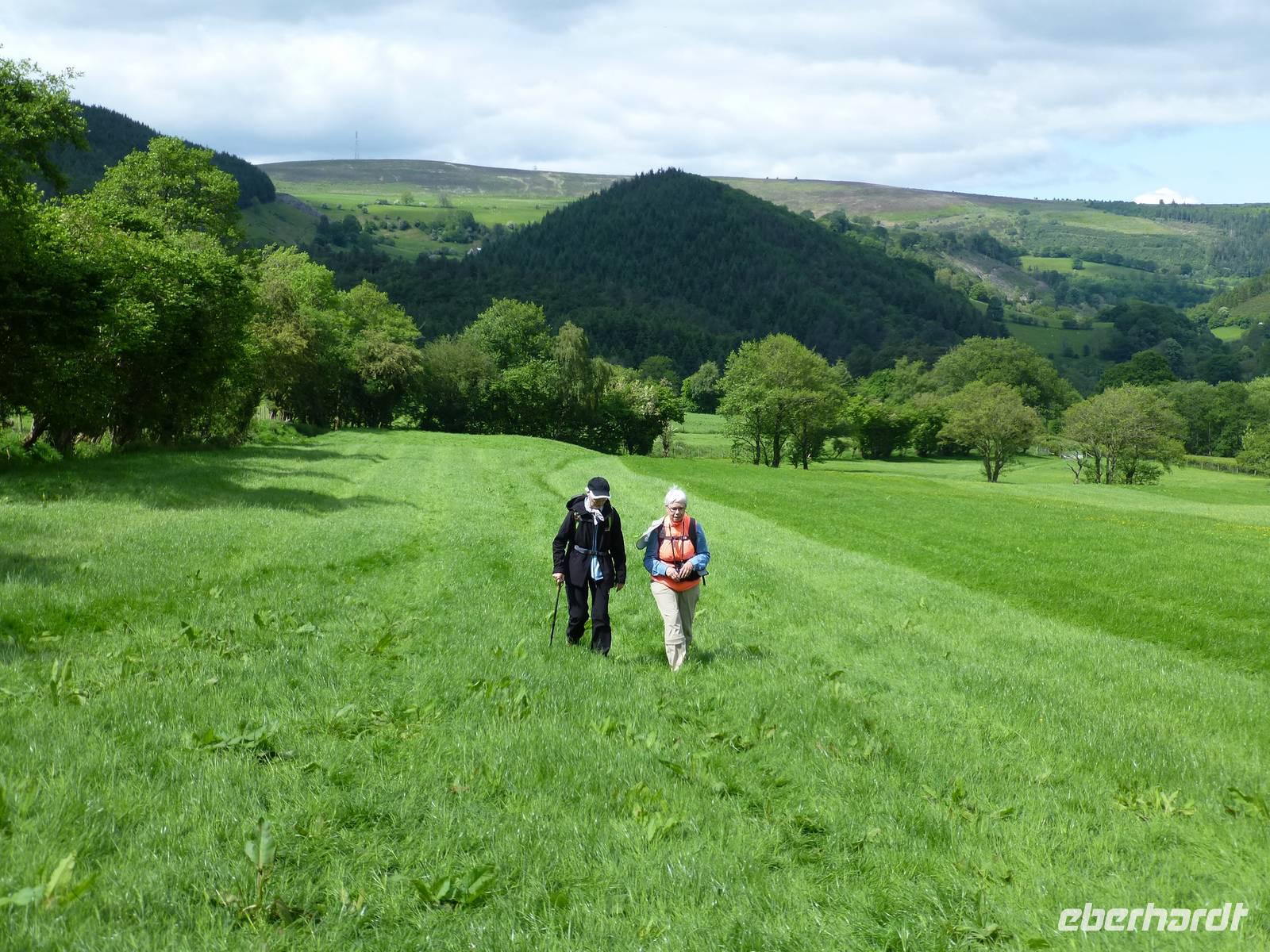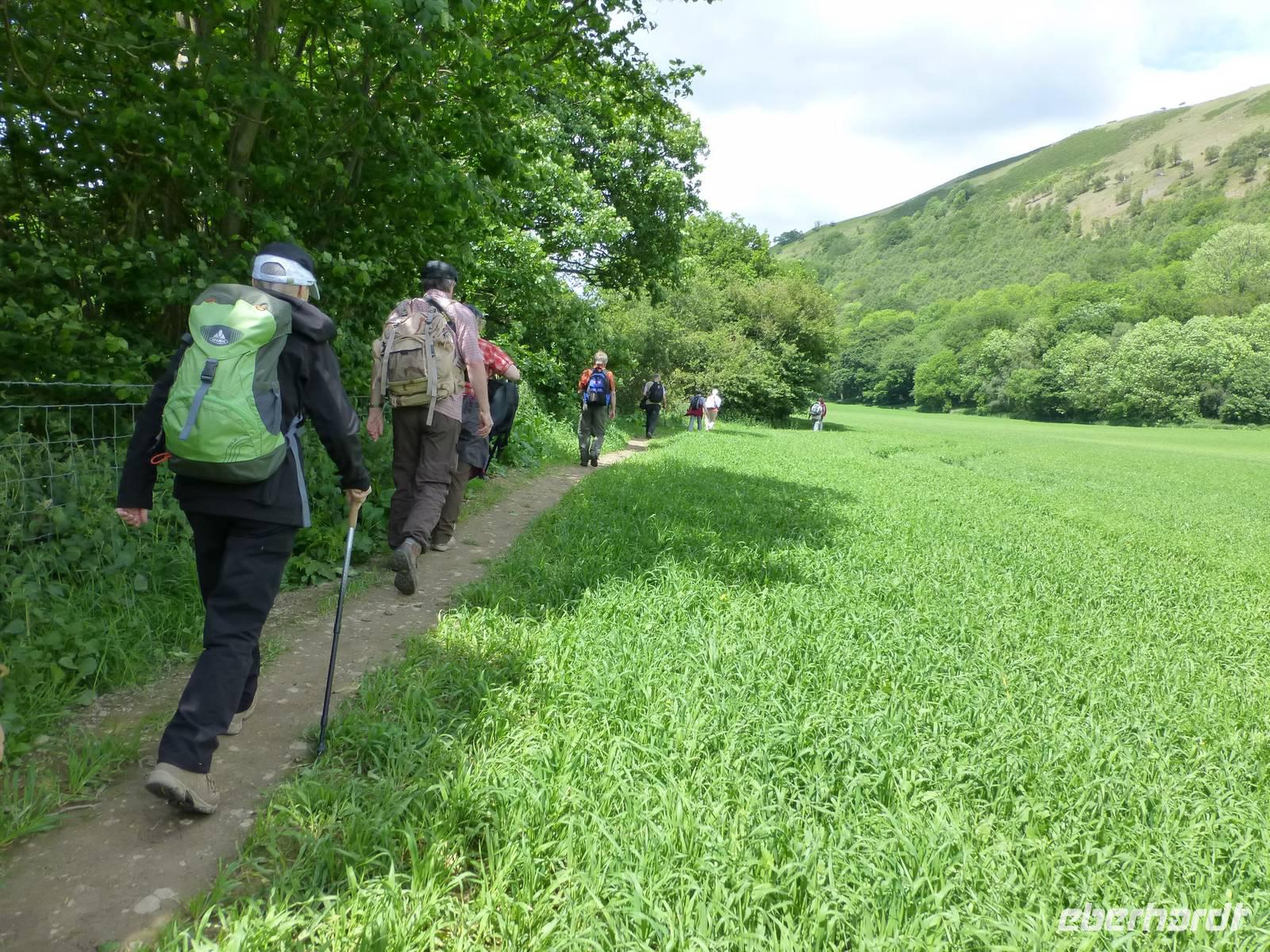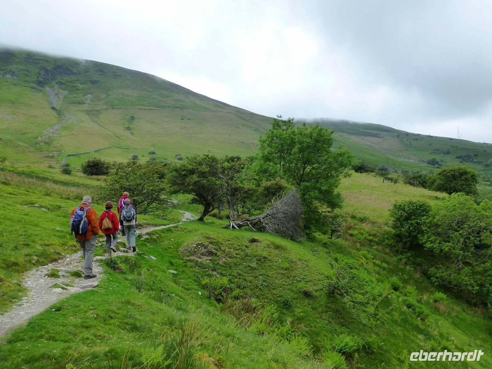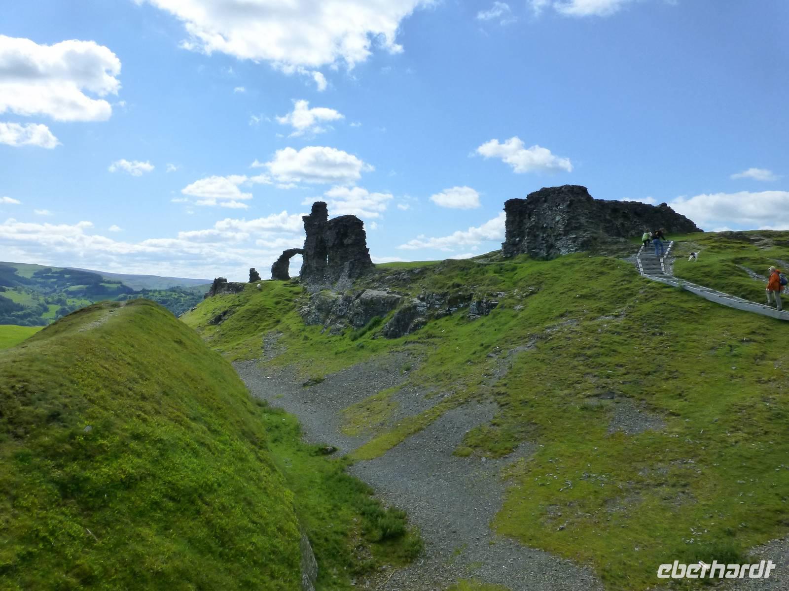Unser Wanderausgangspunkt befindet sich heute im Valle Crucis, an einer alten Abteiruine. Es handelt sich dabei um die letzte in Wales errichtet Zisterzienser Abtei. Nach Auflösung der Klöster in der ersten Hälfte des 16. Jh. ist dann auch diese Abtei verfallen bzw. wurde teilweise als Steinbruch durch die umliegende Bevölkerung genutzt. Wir wandern zuerst durch ein Waldstück, später durch Hecken und über eine Weide bevor wir ein Teilstück den Offas Dyke Path erreichen. König Offa hatte im 8. Jh. hier einen Grenzwall gegen die immer wieder vordringenden walisischen Nachbarn errichtet, heute ist dieser Wall, kaum mehr sichtbar, ein Wanderweg. Zum Schluss geht es noch einmal hoch hinaus, auf den Hausberg von Llangollen, Dinas Bran, Krähenhügel. Die auf dem Berg befindlichen Reste einer alten Burganlage lassen wir hinter uns und steigen wieder hinab ins Dee-Tal nach Llangollen. Dort erwartet uns unser Chauffeur Phil, welcher uns sicher nach Caernarfon zurück bringt.