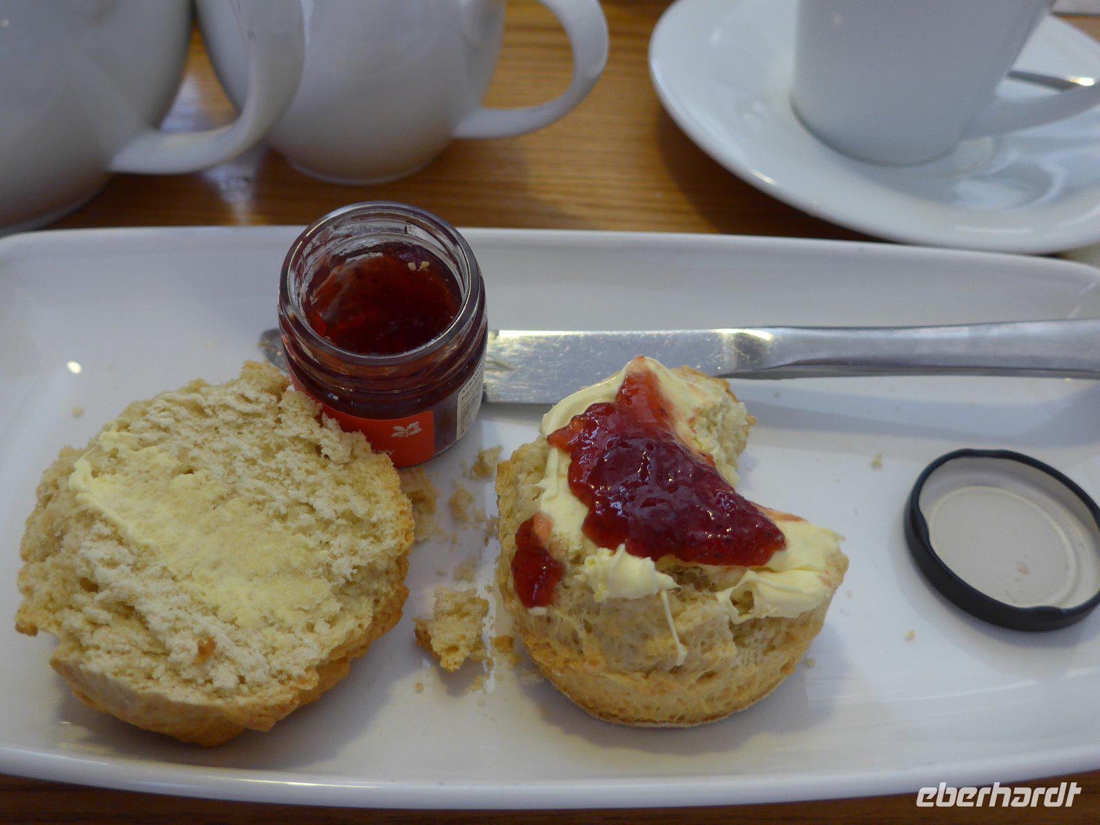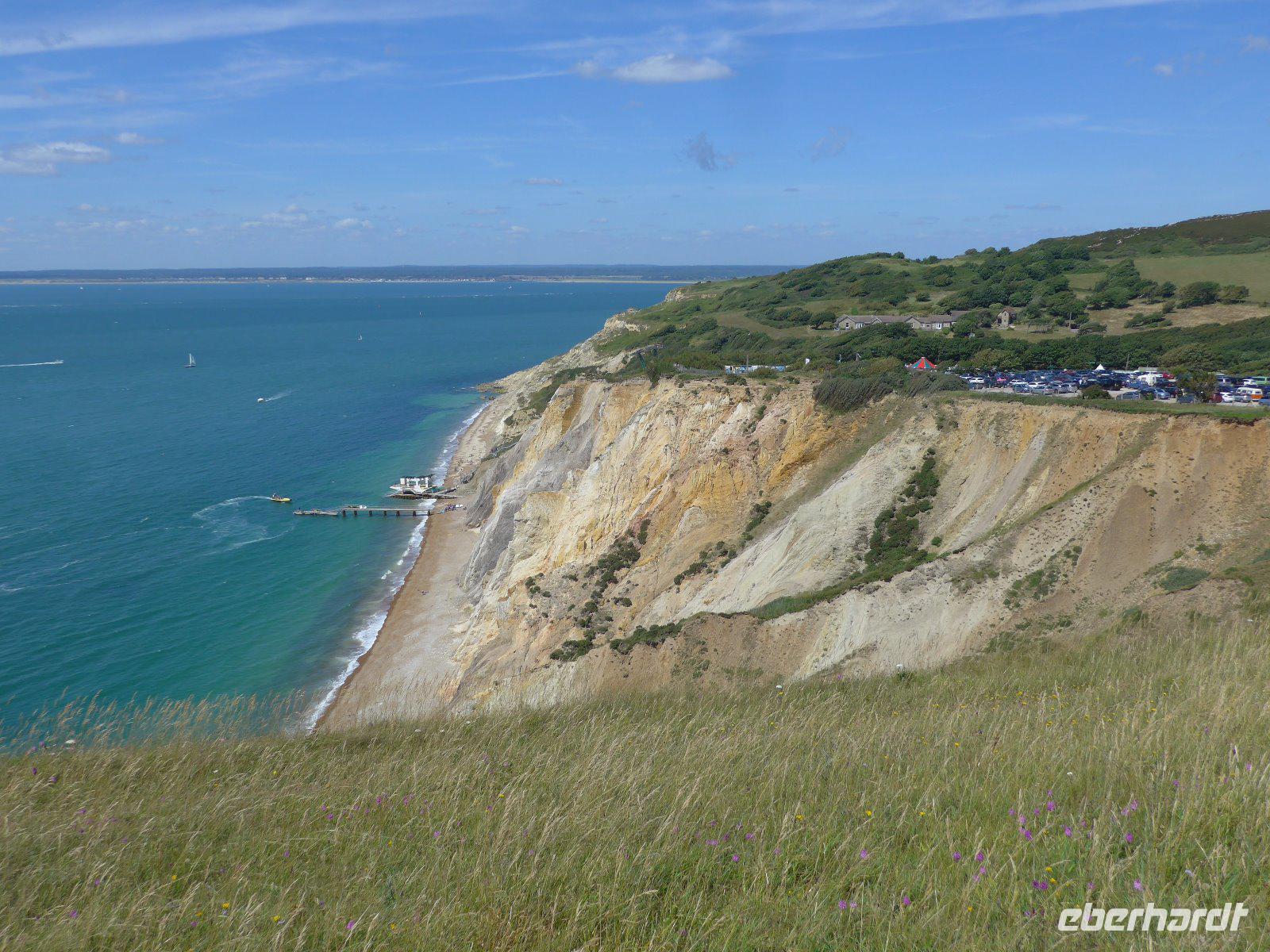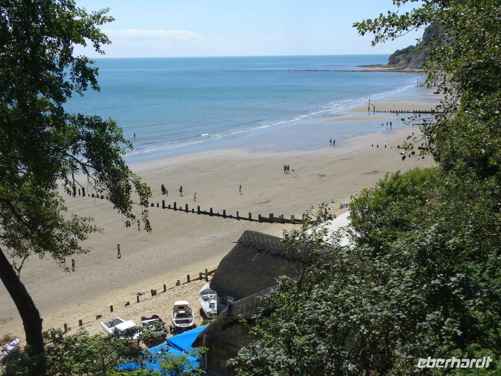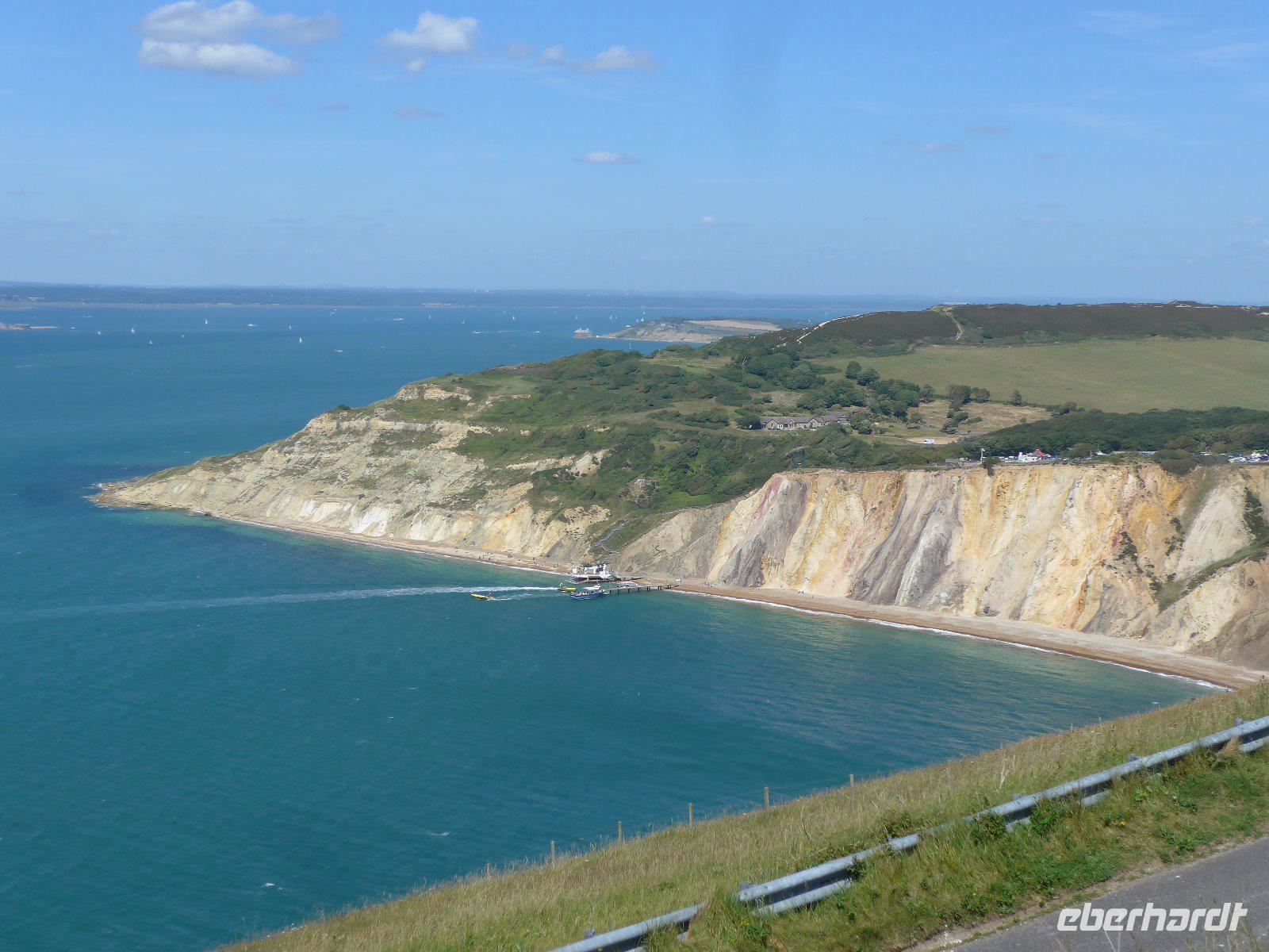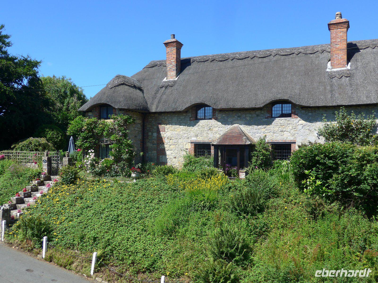 Vorbei an Osborne House ging es in Richtung Godshill, was so viel heißt wie „Gottes Hügel". In einer Zeit, als Friedrich Engels 1845 die Lage der arbeitenden Klasse in England anmahnte, erwarb Königin Viktoria zusammen mit ihrem Gemahl Osborne House. Ihnen standen zwar Windsor Castle, Buckingham Palace u. der Royal Pavillon zur Verfügung, aber in ihrer „Wohnungsnot" suchten sie dennoch ein Privathaus. Als sie Osborne House erworben hatten, verglich Prinz Albert den Blick auf den Solent mit der Bucht von Neapel. Kein Wunder, dass hier schließlich eine italienische Villa mit Campanile Loggia u. Terrassengarten entstand. Innen mit viel Prunk und Plüsch aus jener Zeit. Kein Wunder, dass es die Liebesresidenz Viktorias war und dass sie in dieser nach 63 Regentschaftsjahren auch verstarb. Nun auf der Fahrt quer über die Insel erreichten wir schließlich Godshill. Der Inbegriff eines englischen Dorfes. Es verfügt über einige der ältesten Architekturen der Insel. Auf unserem Spaziergang besuchten wir die reizvolle mittelalterliche Kirche und konnten eine Vielzahl von charmant strohgedeckten Cottages bewundern. Herrliche Fotomotive waren im Kasten. Erst als wir die Rundfahrt fortsetzten bemerkten wir, dass dieser Ort ein regelmäßiger Treffpunkt für Besucher und Einheimische gleichermaßen war. Nun aber weiter - bald erreichten wir den Küstenort Shanklin. Schon John Keats übernachtet 1819 in Shanklin, wo er sein Buch Lamia fertigstellte und das Drama Otho the Great begann. Im Juli 1868 wohnte Henry Wadsworth Longfellow während seiner letzten Europareise hier. Ein beliebter Badeort. Seine Strohdachhäuser mit den geschnitzten Giebelrändern sind typisch viktorianisch und man findet diese nicht nur hier sondern auch andernorts auf der Insel. Erdrutsche haben hier zur charakteristischen Küstenform geführt. Manche behaupten, es sei das „englische Madeira" nur intimer u. romantischer. Nun galt es den Ort zu entdecken. Spaziergang mit Blick auf den herrlichen Strand u. einen Blick in die Schlucht Sahklin Clip und dann ging es über Straßen gesäumt von herrlichen Häusern zurück nach Old Village wo man sehr gut Mittag machen kann. Mit vielen Eindrücken ging es entlang der Küste zum Höhepunkt auf Isle of Whigt den „Needles". Aber eine Umleitung machte dieses Vorhaben zu Nichte. Es blieb nur der Weg über das Landesinnere. Alum Bay - im 19. Jahrhundert wurde man aus einem Busch von Lady Cameron einer Dame aus bestem Hause überfallen und man musste für ein Foto nach ihren Wünschen still stehen. Persönlichkeiten wie Charles Darwin oder Kronprinz Friedrich von Preußen waren Opfer eines solchen Überfalls. Also Achtung - vielleicht sind Lady Camerons Erben noch heute auf Suche nach Motiven? Uns gelangen herrliche Bilder vom Naturdenkmal The Needles. Vorher mussten aber Höhenmeter gemacht werden. Höchster Punkt war die New Battery. Über herrliche Wege vorbei an Kühen und enge Pfade erreichten wir wieder den Busparkplatz. Zurück zum Fährhafen. Auf dem Rückweg immer wieder ein herrlicher Blick auf die Alum Bay. Auf der Fähre in der ersten Reihe - der Kühler des Buses küsste fast die Bordwand der Fähre und nach 1 Stunde bei dichtem Seeverkehr (die Kreuzfahrtschiffe liefen gerade von Southampton aus) erreichten wir den Fährhafen von Southampton und schließlich unser Hotel. Nach dem guten Abendessen hieß es schon wieder Koffer packen, denn unser nächstes Quartier ist morgen in der Nähe von Exeter.