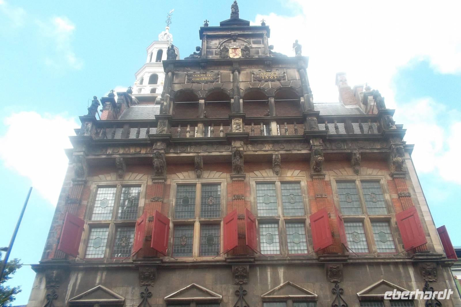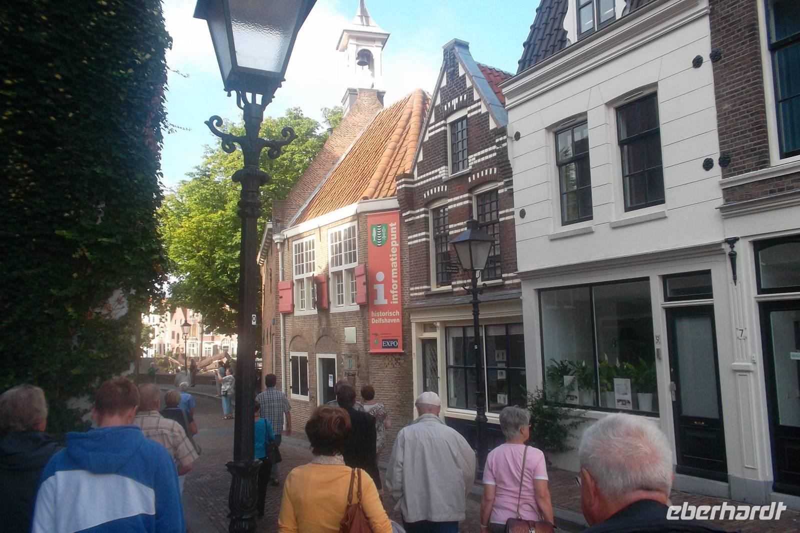 Nach Gelegenheit zum Kauf der Porzellanerzeugnisse wandten wir uns der Stadt Delft zu. Die von Grachten durchzogene Altstadt verbreitet ein besonderes Flair. Noch im historischen Befreiungskampf der Niederlande um Unabhängigkeit von Spanien war sie als Regierungssitz 1584 Schauplatz der Ermordung ihres Statthalters, hat ebenfalls viel zu bieten: Der „Prinsenhof" hier war der Sitz von „Wilhelm dem Schweiger", der als Herzog von Nassau-Oranien Anteil am Aufbau der von der Kolonialmacht Spanien befreiten Niederlande, hatte und hier den Tod fand. Nahe liegen hier die „Oude Kerk" und hübsche Grachtenhäuser wie das alte Provinzialverwaltungsgebäude von Delft. Unweit auch der hübsche historische Stadtkern, den Rathaus mit alter Waage und die „Nieuwekerk dominieren, in der neben Wilhelm I. auch andere gekrönte niederländische Häupter bestattet sind.