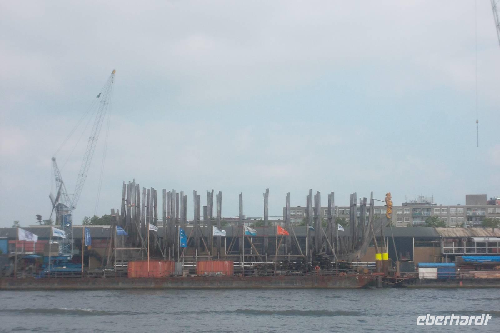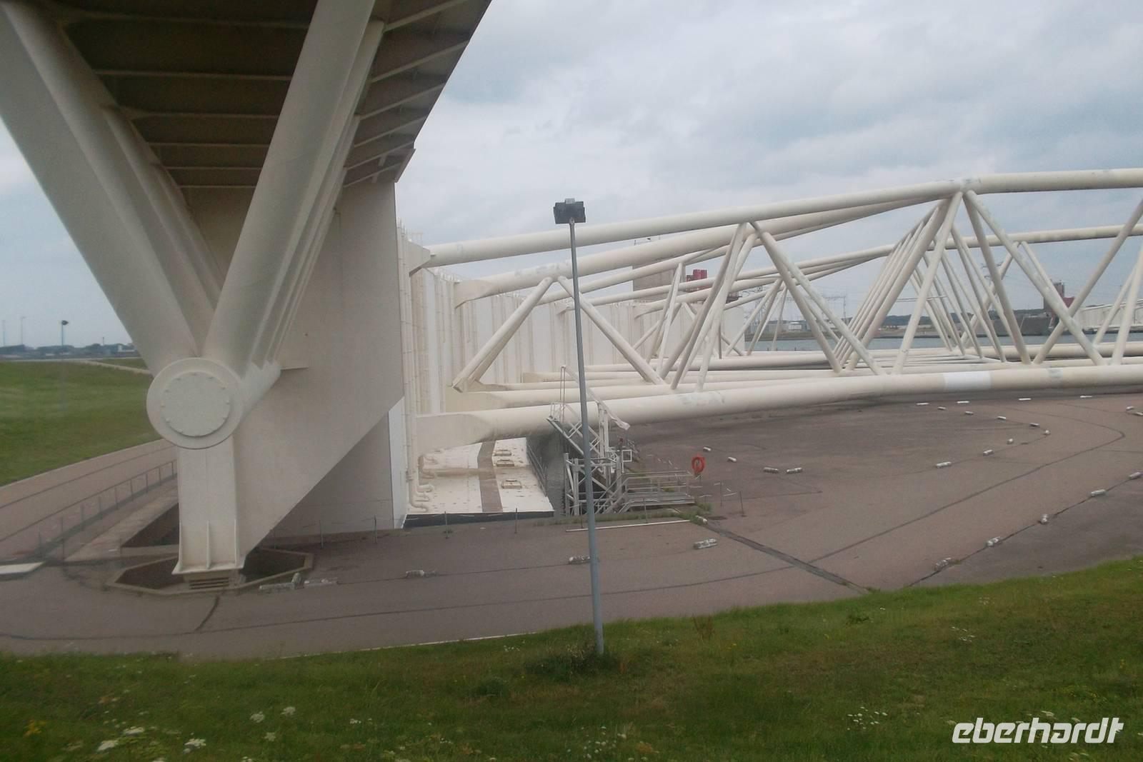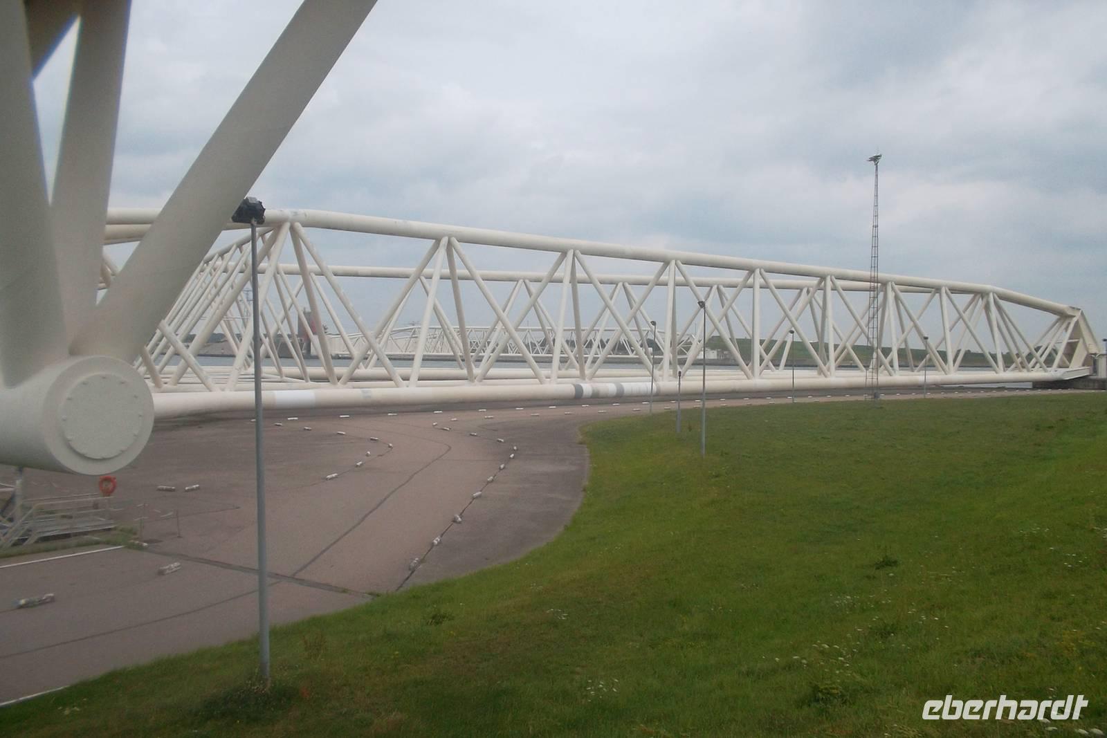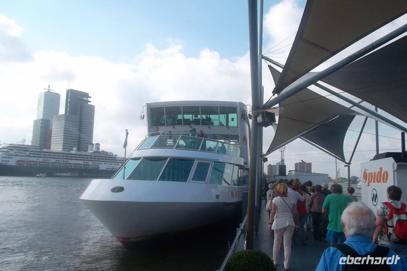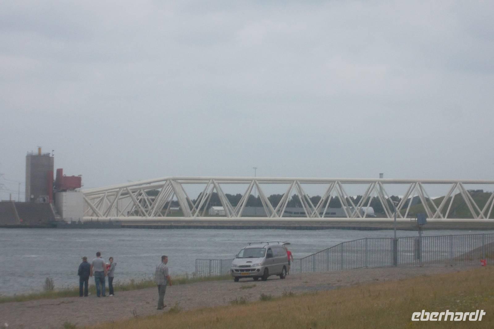 Der größte Hafen Europas liegt nahe Rotterdam! Ein Kennenlernen der zweitgrößten Stadt der Niederlande stand heute zuerst auf dem Programm. Obwohl Straßensperrungen wegen eines Autorennens die Stadtrundfahrt komplizierten, führte unser Stadtführer Karel mit Insiderwissen und Liebe durch alle Winkel des neuen und des alten Rotterdam, die nicht jeder kennt. Die erstaunliche Großzügigkeit in den Straßenführungen und Park-Anlagen, neue, teils gewagte Architektur neben Resten einstiger maritimer Größe kennzeichnen die Hafenstadt. Bei einem kleinen Rundgang entdeckten wir auch den alten „Delfter Hafen", bevor wir auf die Hafenrundfahrt mit der Firma „Spido" gingen. Die Fluss-Perspektive von der Maas aus zeigte uns noch einmal ein ganz anderes Rotterdam. Hier bekamen wir auch einen Einblick in den Aufbau des größten europäischen Hafens und drittgrößten der Welt . Nach etwas Freizeit gewannen wir weitere Hafeneindrücke vom Bus aus, denn wir fuhren durch große Teile des Europoort. Viele Quadratkilometer Hafen-Gelände beeindrucken auf über 20 km Autobahndurchfahrt. Nach Passieren vom Containerhafen und dem Erdölhafen mit den gewaltigen Depottanks für hunderte Millionen Barrel, waren wir plötzlich am Flut-Schutztor der Maas. Seit 1997 besitzt der Nieuwe Waterweg, der Zugang zu Stadt und Hafen von Rotterdam, mit dem Maeslant-Sturmflutwehr zwei riesige, kreisbogenförmige Tore, drehbar um ein Kugelgelenk gelagert.