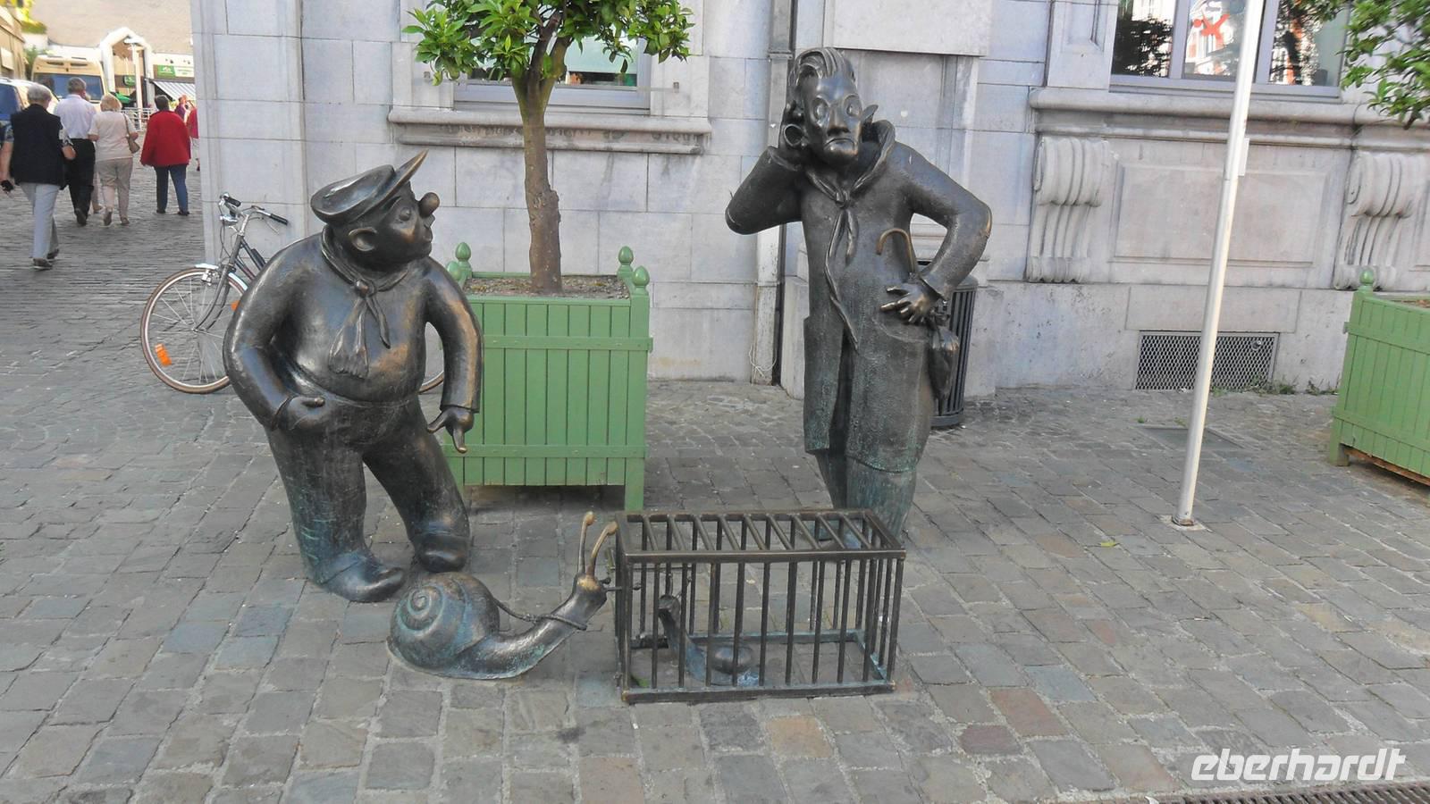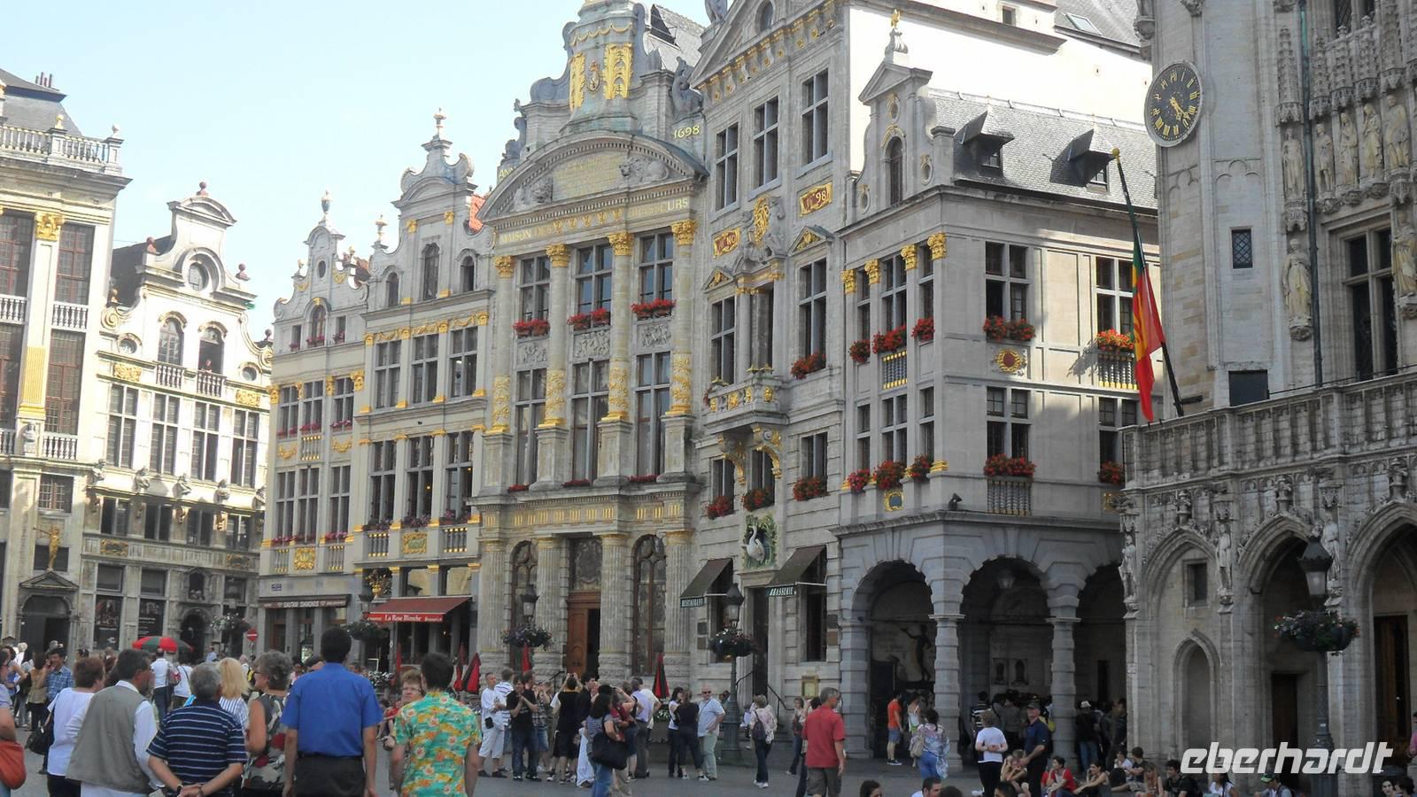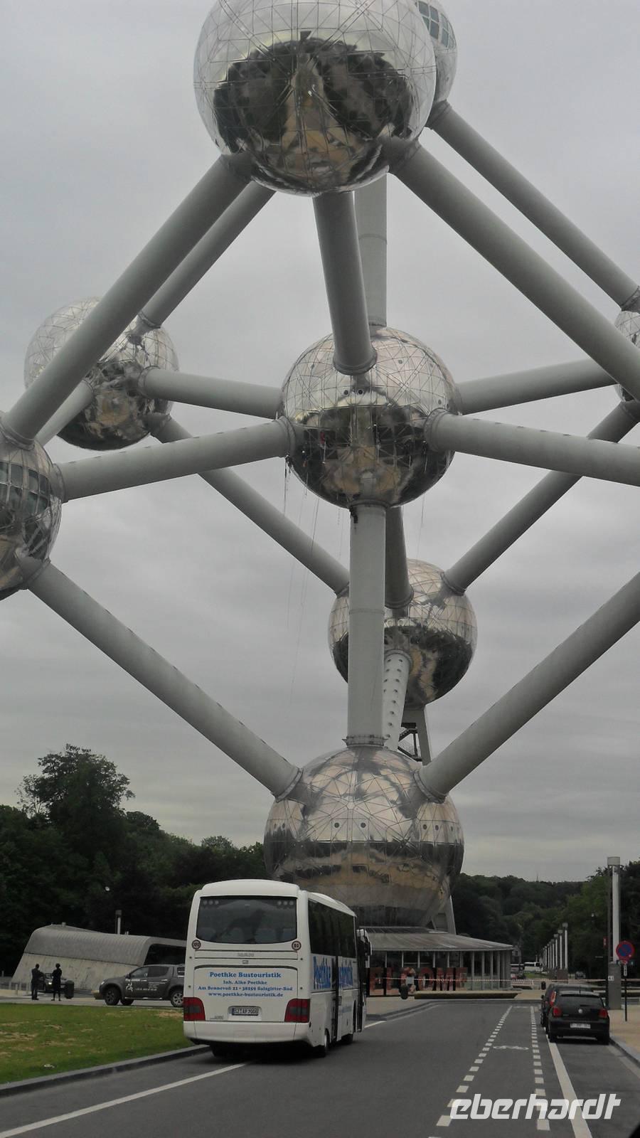 Dann führte uns der Weg nach ein paar niederländischen Kilometern tatsächlich ins Nachbarland Belgien und in dessen Hauptstadt Brüssel. Zunächst erreichten wir das am Rand gelegene Atomium, wo wir Zeit für einen ausgedehnten Fotostopp mit Bordservice und Toilettenpause hatten. Das weltbekannte Brüsseler Wahrzeichen, 2006 restauriert, gibt es seit der Weltausstellung von 1958. Das 102 m hohe Gebäude aus neun riesigen, durch dicke Rohre miteinander verbundenen Kugeln stellt die 165-milliardenfache Vergrößerung eines Eisenkristalls dar. Vom Atomium ging es zur „großen Runde" mit dem Bus durch die Hauptstadt. Vorbei am Justizpalast und durch die Regierungsstraße erreichten wir das Stadtschloss von Brüssel, das „Arbeitsschloß" des belgischen Königs. Während der Bus hier stehenblieb, besuchten wir zu Fuß den Regierungsplatz mit Krönungskirche und einem Denkmal von Gottfried von Bouillon und danach den Kunstberg. Der wurde im Laufe der Geschichte: angelegt, nachdem beim großen Artilleriebeschuß Brüssels Ende des 17. Jahrhunderts gewaltige Mengen Bauschutt anfielen und die Häuser des zerschossenen Marktplatzes neu aufgebaut werden mußten. Nach Aufschüttung und Neubebauung wurde der „Kunstberg „ mit seinen Bibliotheken und Museen zu einem der nationalen Kulturzentren Belgiens. Über den Jubiläumspar und das EU-Viertel arbeiteten wir uns zurück und erkundeten beim anschließenden Rundgang zu Fuß die Brüsseler Altstadt, denn für Busse sind die Gassen hier zu eng. Wir besuchten zunächst das Brüsseler Wahrzeichen „Manneken Pis". Die Figur eines kleinen Jungen, der seit Jahrhunderten gelassen vor sich hinpullert, ist nur einen guten halben Meter groß und spendet etwa 70 l Wasser pro Stunde. Viele Legenden ranken sich um ihn, er hat hunderte Kostüme, die an manchen Tagen seine Blöße bedecken und er ist die einzige Brunnenfigur der Welt, der ein Orden verliehen wurde. Einer der Gäste fragte mich, was denn an der Geschichte sei, dass es ein weibliches Gegenstück zum „Manneken" gebe. Das ist tatsächlich so und ich versprach, die Gruppe hinzuführen. Zuerst aber gelangten wir auf den „Großen Markt". Für viele ist er einer der schönsten Marktplätze Europas, den alte Zunfthäuser und ehemalige „königlichen" Bauten in gotischem, Renaissance- und Barockstil säumen. Der „Grand Place" von Brüssel liegt tagsüber stets in großer Geschäftigkeit zumeist in der Sonne und wird - ohne dass der Trubel nachließe - angeleuchtet in der Nacht.