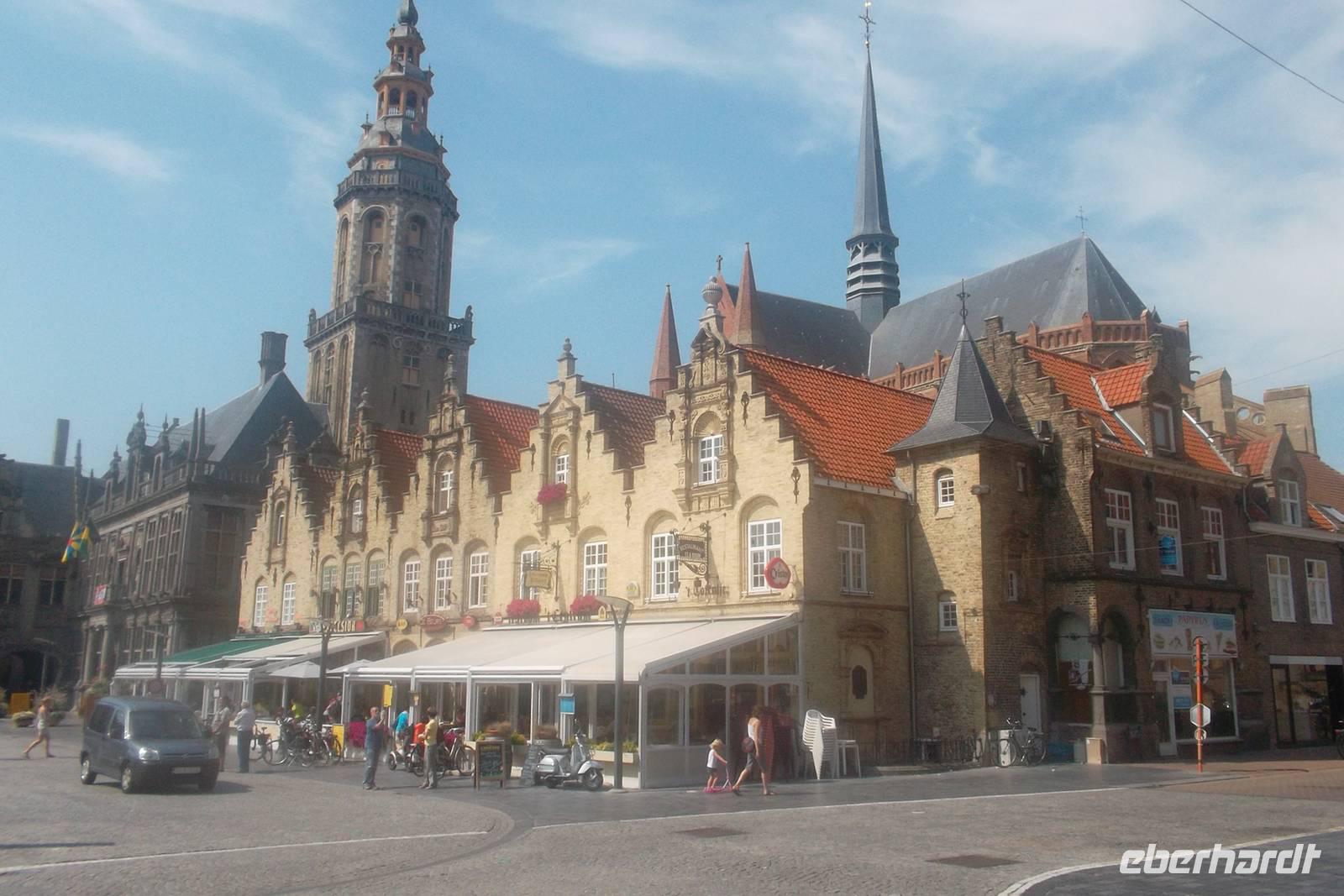 Eigentlich war der Vogelpark Het Zwin direkt an der belgisch-niederländischen Grenze als Ausflug vorgesehen, aber wir sehr kurzfristig erfahren, dass er wegen Umbaues gerade geschlossen worden war. Daher mußte schnell ein Ersatz gefunden werden - wir fuhren deshalb in den nahen Ort Blankenberge und erlebten im dortigen „Sealife Center" zwar keine Vögel, aber dafür allerlei Meerestiere, die in der „geheimnisvollen Unterwasserwelt" - so die Werbung des Center - präsentiert werden. Nach einiger Zeit bei den Meeresbewohnern fuhren wir mit dem Bus in die hübsche flämische Stadt Veurne. Einst eine ziemlich große spanische Festung im sogenannten „achtzigjährigen Krieg" hat das Städtchen noch einige schöne historische Gebäude zu bieten. Der gut erhaltene große, rechteckige Markt wartet mit reizvoller Historie auf. Das alte Rathaus - „Stadhuis" - und daran anschließend der Justizpalast mit dahinterliegendem Belfried, der mit einigen anderen zum UNESCO-Welterbe gehört sowie die alte Fleischhalle stammen alle aus dem frühen 17. Jahrhundert. Auf der anderen Marktseite gibt es noch einen spätgotischen Wohnturm: Heute als der „Spanische Pavillon" bekannt, wurde das im 15. Jahrhundert erbaute Gebäude ursprünglich als Rathaus genutzt. Nach etwas Freizeit hier im idyllischen Veurne kehrten wir recht früh ins Hotel in Oostende zurück, um noch Zeit für einen Strandspaziergang, einen Abstecher in die Innenstadt zu haben oder die Gelegenheit zum Baden zu nutzen.