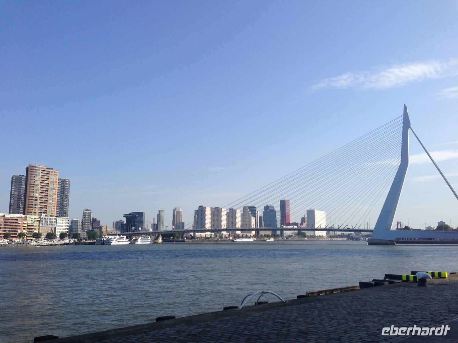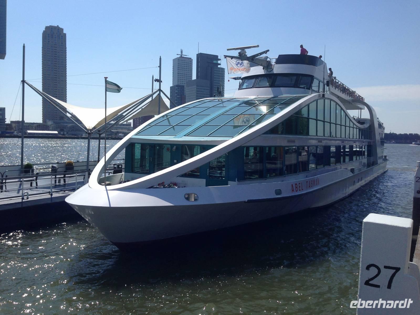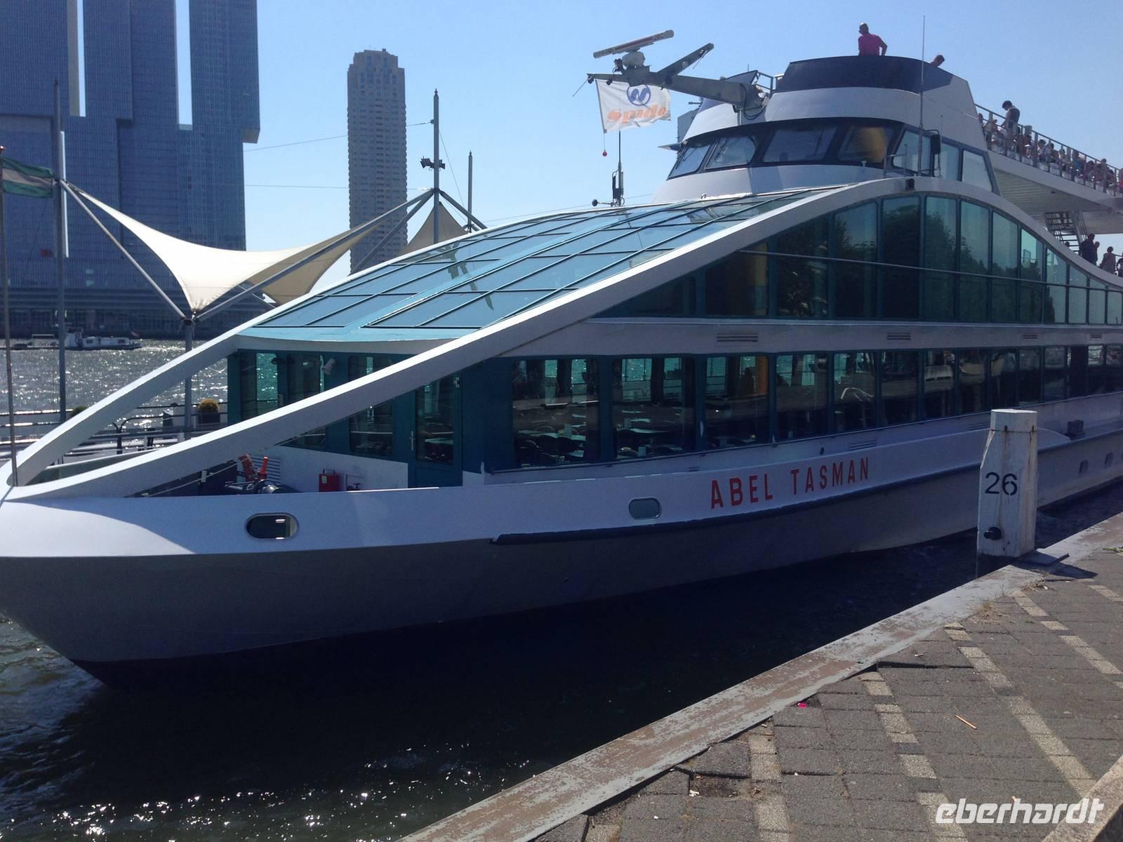 Unsere Tour endet am Hafen, wo wir nach einer Viertelstunde Pause unsere Yacht besteigen und Rotterdam noch vom Wasser aus auf uns wirken lassen.