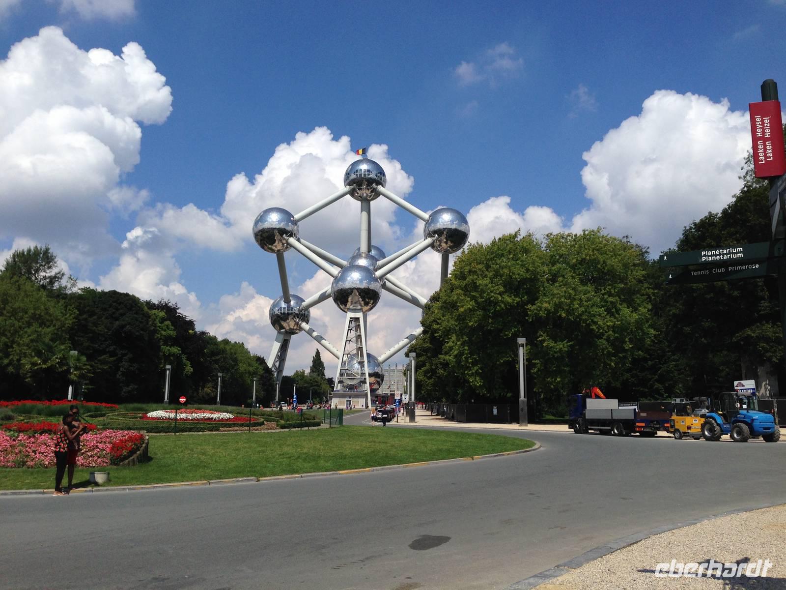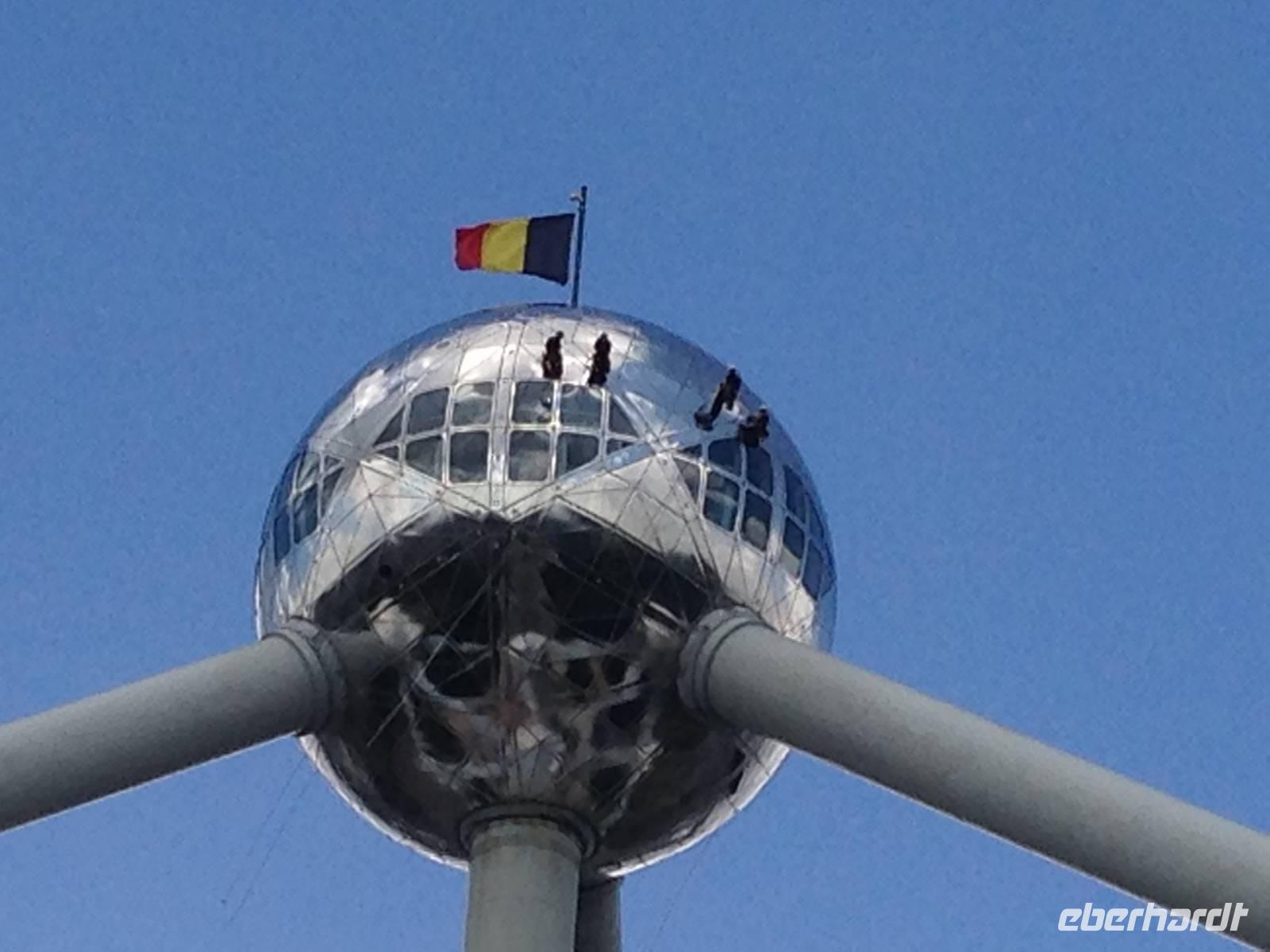 Nach einem Spaziergang quasi durch zwei Länder fahren wir weiter zum Atomium nach Brüssel, besser gesagt, kurz vor Brüssel. Seine Kugeln glitzern in der Sonne. Das war lange nicht so. Noch 2004 wurde darüber nachgedacht, das ganze Konstrukt abzureißen, den die Kugeln hatten ihren ursprünglichen Glanz verloren. Doch die Brüsseler wollten nicht auf ihr Wahrzeichen verzichten. Und so lässt die Stadt heute, für viel Geld, regelmäßig die Außenfassaden putzen. Mit gemischten Gefühlen beobachten wir, wie in schwindelerregender Höhe dieses Werk vollbracht wird.