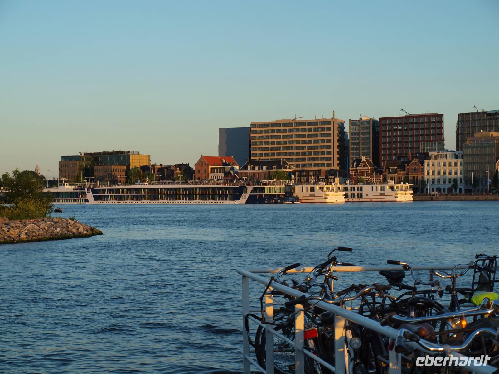 Am Samstag Morgen rollte unser Bus in Dresden los und brachte uns nahezu ohne Schwierigkeiten in ca. 770 Kilometer weit entfernte Amsterdam. Mit etwas Verspätung kamen wir am Liegeplatz der „Sir Winston" an. Die Crew des Schiffes erwartete uns schon und während wir in der Lobby zur Begrüßung Platz nahmen, wurden die Räder und Koffer in Windeseile an Bord gebracht. Karl-Heinz, unser Schiffreiseleiter, wies uns in die Besonderheiten des Schiffes und die nächsten Tage ein. Außer Ihm war Jürgen, unser Radreiseleiter, an Bord. Er sollte uns in den nächsten Tagen durch das Land führen. Nach dem gemeinsamen Abendessen ließen wir den Abend gemütlich ausklingen und freuten uns auf hoffentlich schöne und erlebnisreiche Radtage.
