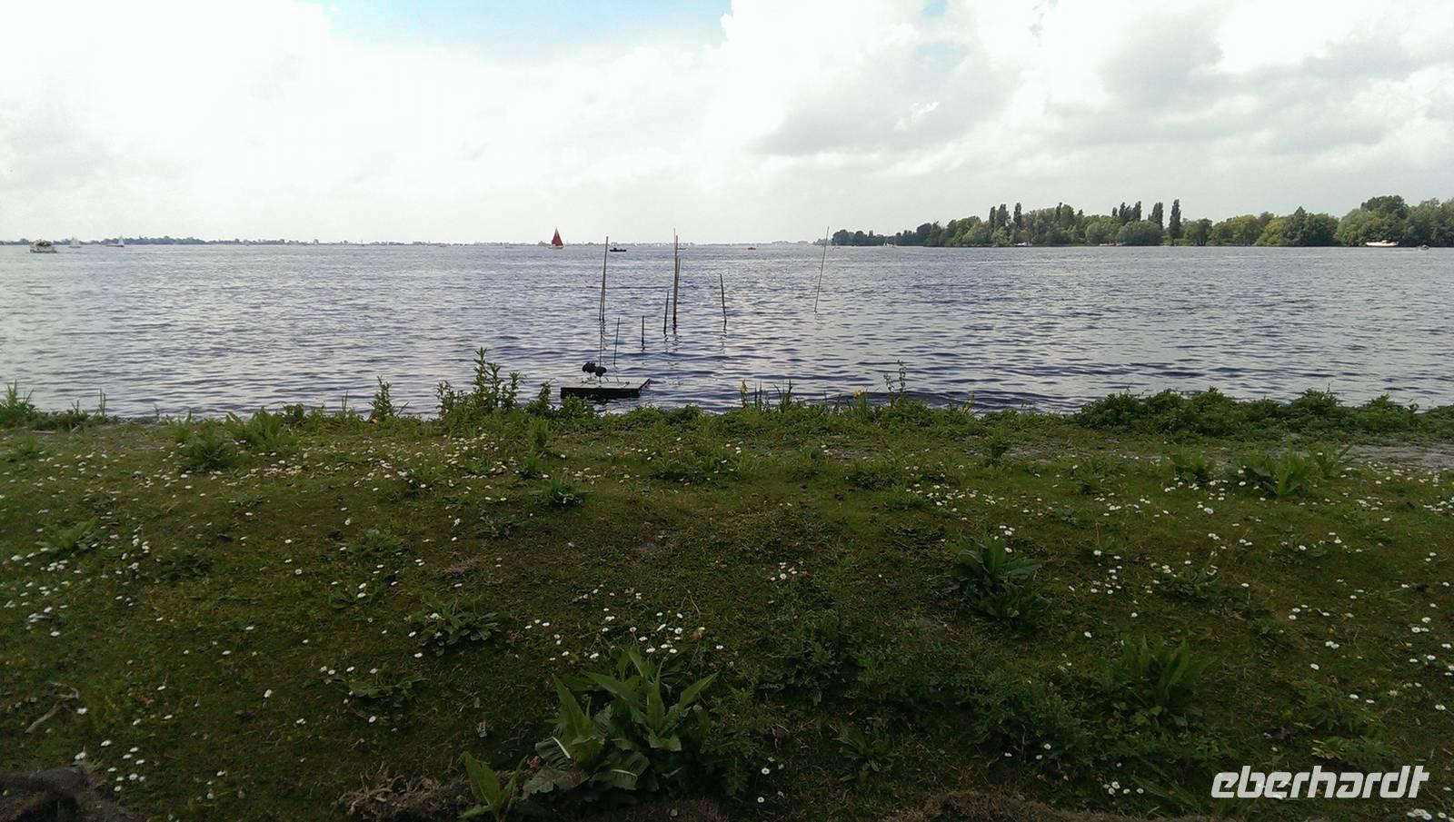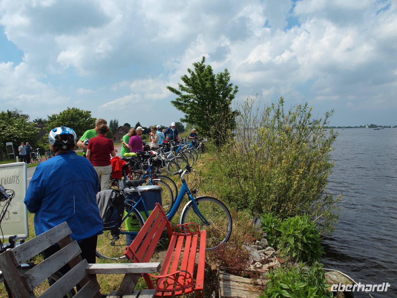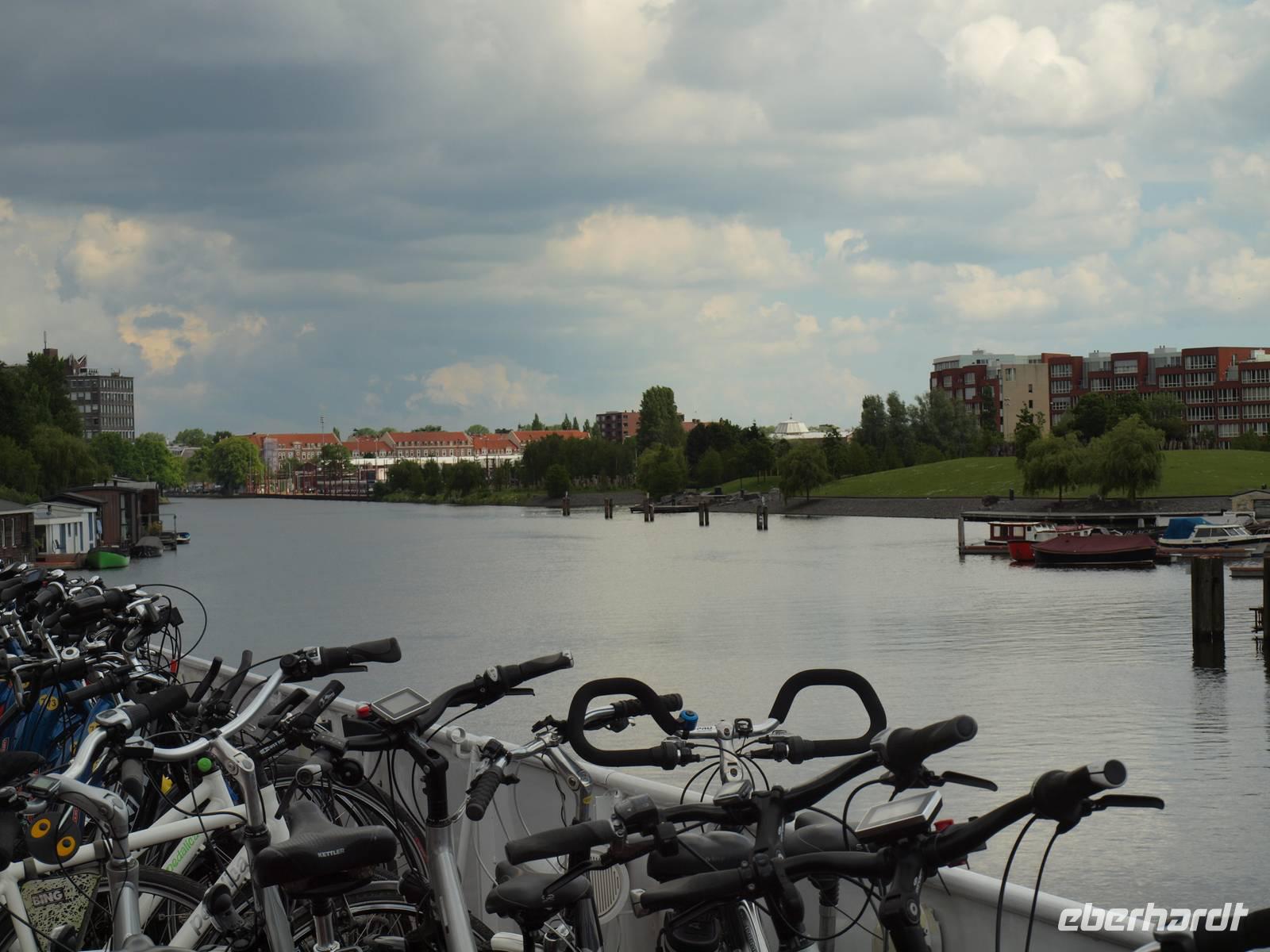 Nach der ersten Nacht auf unserem schwimmenden Hotel und einem gemeinsamen Frühstück legte die „Sir Winston" ab. Auf der Fahrt nach Aalsmeer passierten und unterquerten wir viele Brücken durch Amsterdam und konnten an Deck die Sonne genießen. In der Nähe des Flughafens, Schiphol, lud die Crew die Räder von Bord und wir standen, in bester Form für alle Wetterlagen ausgerüstet, bereit. Die Tour führte erst einmal entlang des Kanals und nach kurzer Zeit hat die Sonne die Führung am Himmel übernommen. In Aalsmeer hielten wir uns nicht lange auf und fuhren, immer den Westeinderplassen zu unserer Rechten, weiter in Richtung Leiden. Bei Oude Wetering überquerten wir den Kanal mit der Fähre und am Braassemermeer legten wir eine Pause in einem kleinen Café ein und konnten Kinder beim Bedienen der Schleuse beobachten. Nach insgesamt ca. 45 Radkilometern erreichten wir unser Tagesziel Leiden, eine der ältesten Städte der Niederlande. Außerdem stand hier das Geburtshaus des wohlbekannten Malers Rembrandt van Rijn. Am Liegeplatz empfing uns schon die Crew und machten die Räder an Land fest, da die Tour morgen von hier aus starten sollte.