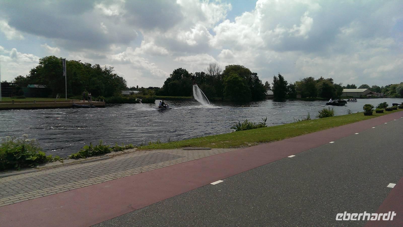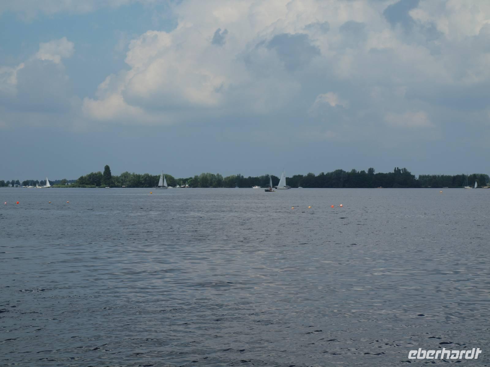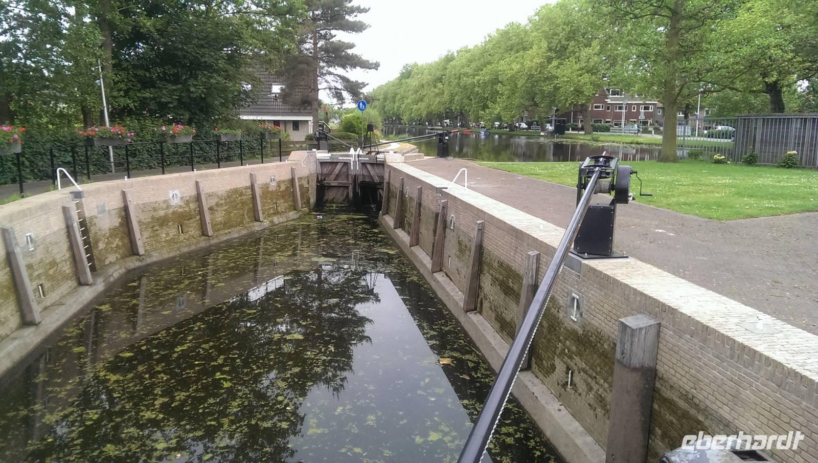 Nach der ersten Nacht auf unserem schwimmenden Hotel und einem gemeinsamen Frühstück legte die „Sir Winston" ab. Auf der Fahrt nach Aalsmeer passierten und unterquerten wir viele Brücken durch Amsterdam und konnten an Deck die Sonne genießen. In der Nähe des Flughafens, Schiphol, lud die Crew die Räder von Bord und wir standen, in bester Form für alle Wetterlagen ausgerüstet, bereit. Die Tour führte erst einmal entlang des Kanals und nach kurzer Zeit hat die Sonne die Führung am Himmel übernommen. In Aalsmeer hielten wir uns nicht lange auf und fuhren, immer den Westeinderplassen zu unserer Rechten, weiter in Richtung Leiden. Bei Oude Wetering überquerten wir den Kanal mit der Fähre und am Braassemermeer legten wir eine Pause in einem kleinen Café ein und konnten Kinder beim Bedienen der Schleuse beobachten. Nach insgesamt ca. 45 Radkilometern erreichten wir unser Tagesziel Leiden, eine der ältesten Städte der Niederlande. Außerdem stand hier das Geburtshaus des wohlbekannten Malers Rembrandt van Rijn. Am Liegeplatz empfing uns schon die Crew und machten die Räder an Land fest, da die Tour morgen von hier aus starten sollte.