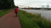 Vom verschlafenen Schoonhoven fuhren wir heute ins pulsierende Utrecht. Leider begrüßte uns der heutige Tag ebenfalls mit Regen und wir mussten so manchem Gegenwind stand halten. Auf dem Weg passierten wir Oudewater, bekannt durch seine noch gut erhaltenen Hexenwaage. Zum Aufwärmen gönnten wir uns einen Kaffee in der Altstadt und stiegen wieder auf unsere treuen Drahtesel. Zahlreiche Felder und Windmühlen, sowie einen traditionellen Käsebauernhof. Bei dem Wetter tat eine kleine Stärkung gut. Nach kurzer Zeit erspähten wir von Weitem schon die "Gelbe Brücke" die uns als Orientierungspunkt am Morgen gegeben wurde und wir wussten, dass wir unser Ziel, Utrecht, erreicht hatten.
