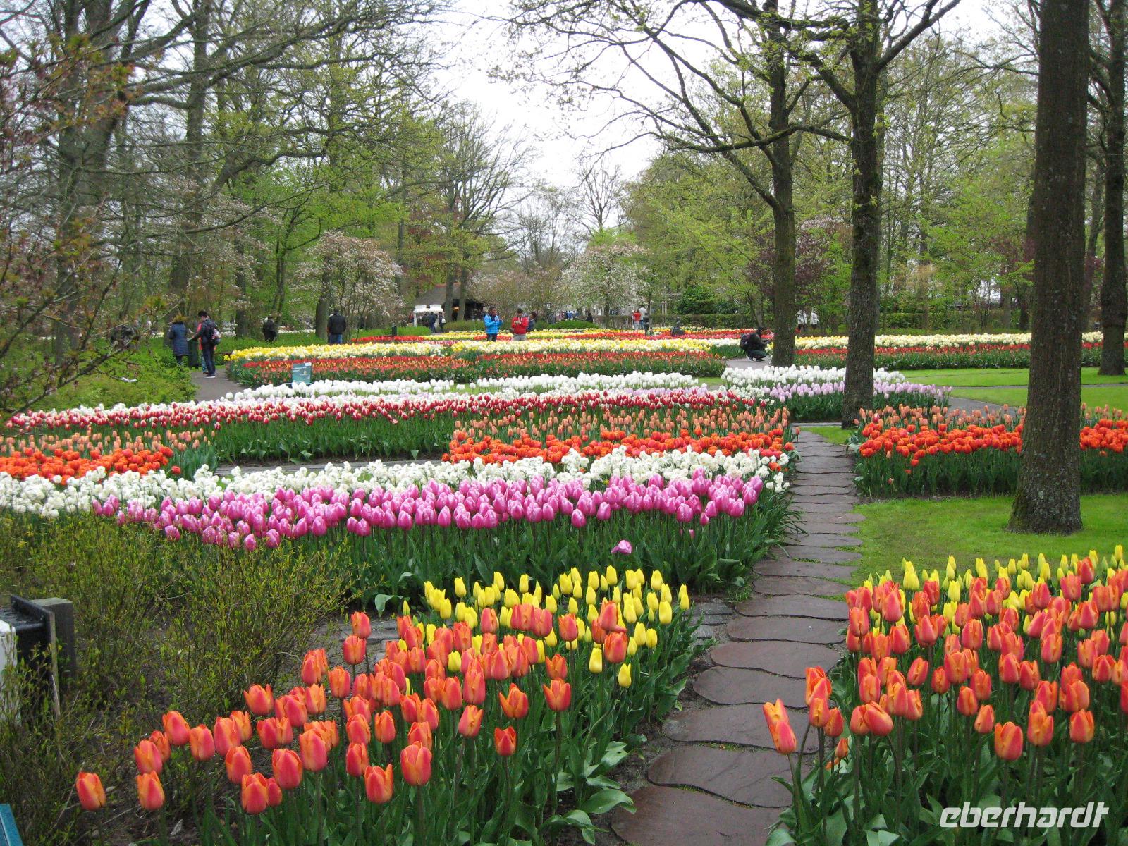 Alle waren wir auf den Keukenhof gespannt, insbesondere weil zwei von uns, Christine und Claus unbedingt zum 2. Mal hin wollten. Die Erwartungen waren also groß und trotz Regen wurden diese mehr als erfüllt. Ein Blütenmeer - bestehend aus hunderten von Arten an Tulpen, Hyazinthen, Narzissen und verschiedenen Gehölzen - verzauberte uns. Wir erfreuten uns an einer tolle Landschaftsgestaltung mit Hügeln, Wasserläufen und der Einbeziehung herrlich alter Bäume. In verschiedenen Ausstellungshallen wurden unterschiedliche Themen gestaltet.
