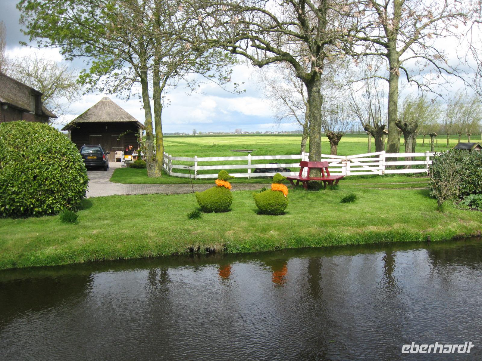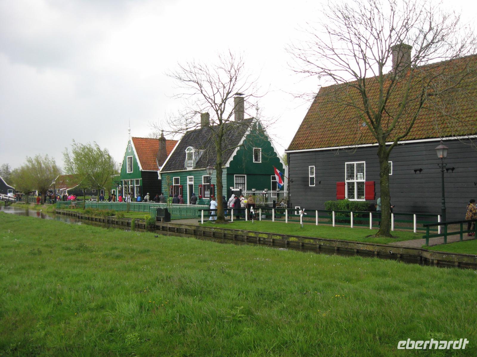 Unser Tag begann gemütlich. Nach einem ausgiebigen Frühstück schipperten wir entlang der Amsterdamer Grachten, vorbei am Olympiastadion unter 14 Brücken hindurch, von denen einige extra für unser Schiff hochgezogen wurden. Interessant waren insbesondere die vielen Baustile der Amsterdamer Viertel und natürlich die Floating Homes. Wir nutzten auch die dreistündige Fahrt, um uns in der Gruppe besser kennen zu lernen und unser Reiseleiter Tilo hatte die Idee, dass wir heute vom Temperament her unseren Brasilianischen Freunden Paroli bieten werden. So beendete jeder seine persönliche Vorstellung mit der Frage, aus welchem Bundesland er kommt bzw. welches sein liebstes Bundesland ist. So kam es dazu, dass wir unsere Heimat Sachsen 14 Mal lautstark hochleben ließen. Die Brasilianer waren schwer beeindruckt und fragten nach, ob wir alle 14 Gäste heute Geburtstag hätten. Also steht es 1:1.Endlich ging es auf die erste Radetappe. Als erstes konnten wir erleben, wie KLM Landeanflug auf den Amsterdamer Flughafen organisiert: aller 5 Minuten ein Jet, natürlich auch andere Airlines. Je weiter wir hinaus fuhren, vorbei am Wetseinderplassen und Brassemermeer, beeindruckte uns die Landschaft, die natürliche und die vom Menschen geschaffene, ja die unter dem Meersspiegel liegenden Weideflächen. Neben typischen Windmühlen sahen wir viele Tiere: Eine Entenfamilie mit 7 Jungen, logischer Weise nicht im Gänsemarsch, Reiher auf dem Beutezug und minikleine Kühe - die allerdings keine waren. Es waren Schafe mit schwarz-weiß geflecktem Fell, eine tolle Züchtung.
