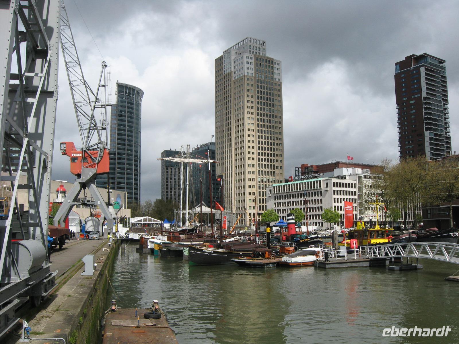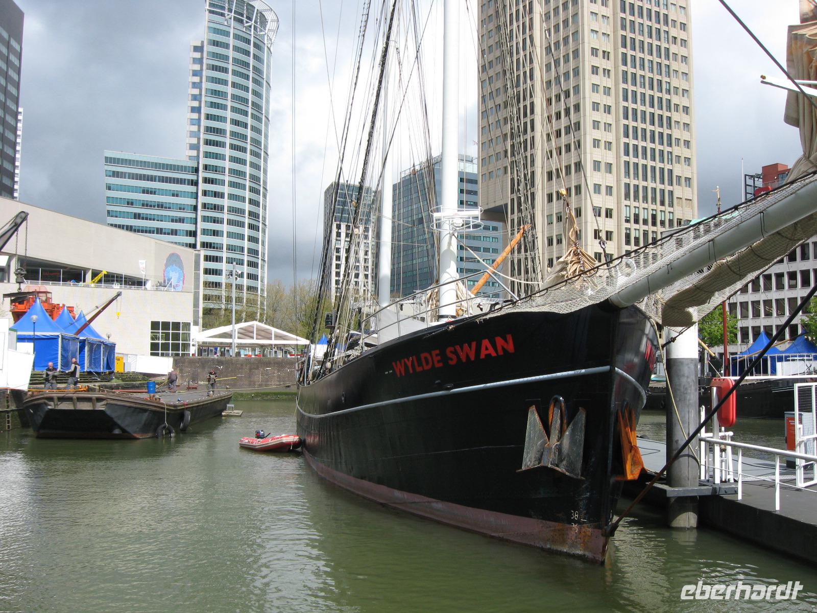 Als nächstes begeisterte uns das Ensemble der Kubischen Häuser. Eine interessante Wohnhausgestaltung mit Überbauung einer Straße bis hin zur Neuen Maas. Glockengeläut der St. Laurens Kerk zog uns magisch an. Ein Rundgang zum gigantischen Kirchenschiff ließen wir uns nicht entgehen. Im Inneren nahmen wir eine interessante Orgel und die schlichte Einrichtung zur Kenntnis. Offensichtlich finden hier auch Musikveranstaltungen und Konzerte statt. Wir vollendeten unseren Rundgang mit einem Besuch des Museumshafens und bestiegen natürlich auch eines der historischen Schiffe. Wir konnten feststellen, dass die holländischen Seeleute vor 150 Jahren kleiner waren als wir heute. Wir hatten einen kühlen, teilweise sonnigen Rundgang. Kurz vor Erreichen unseres schwimmenden Hotels erwischte uns doch noch ein Hagelschauer.