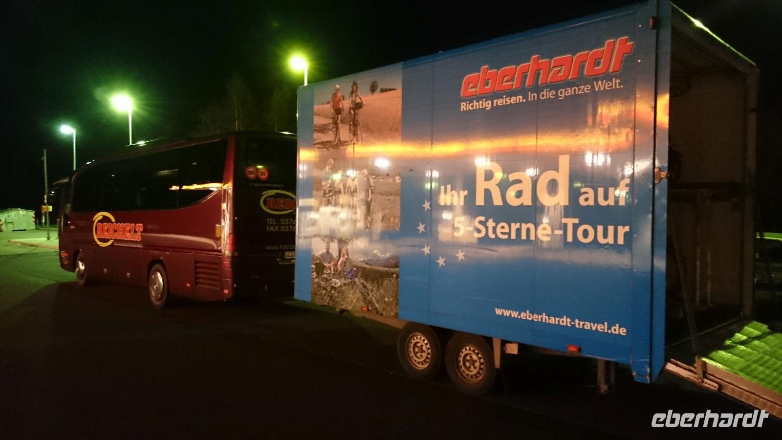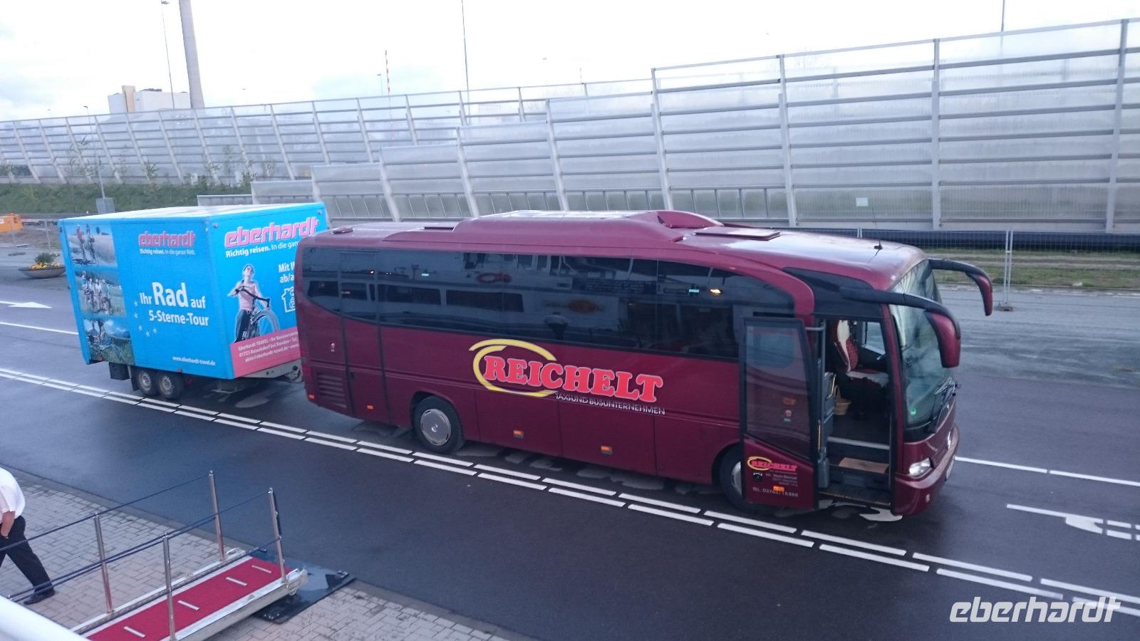 Frühzeitig war unsere kleine Reisegruppe komplett, die Räder fachmännisch im Hänger verstaut, nun konnte die Fahrt gen Westen - vorbei am Ruhrgebiet - beginnen. Unsere Chauffeure Ingo und Frank wechselten sich so ab, dass die vorgeschriebenen Pausenzeiten optimal verliefen. Unser Reiseleiter Tilo versorgte uns mit interessanten und unterhaltsamen Informationen am Wegesrand und mit den kulinarischen Möglichkeiten im Reisebus. So hatten wir eine entspannte Anreise und konnten uns pünktlich einschiffen - ohne nass zu werden.