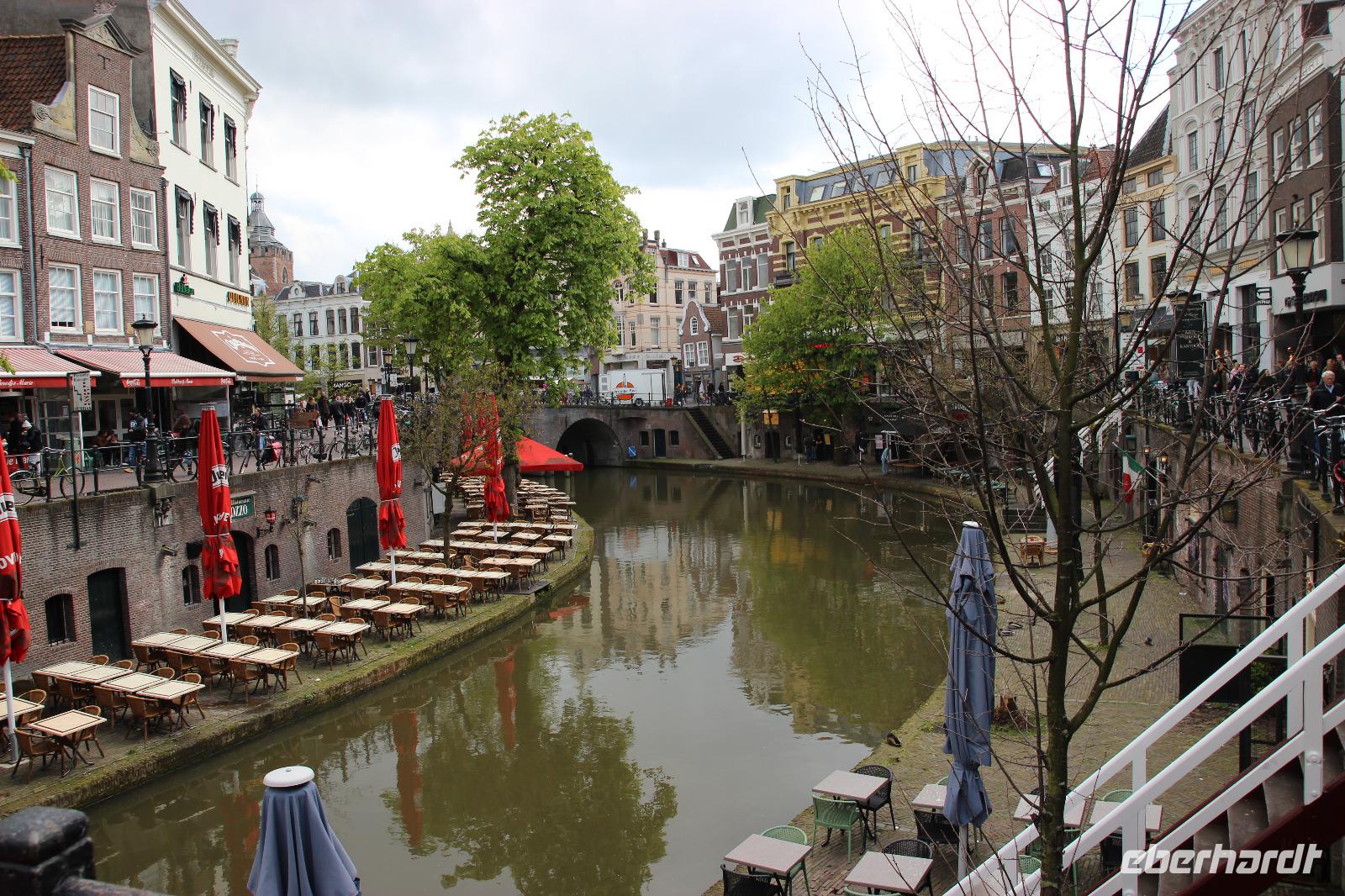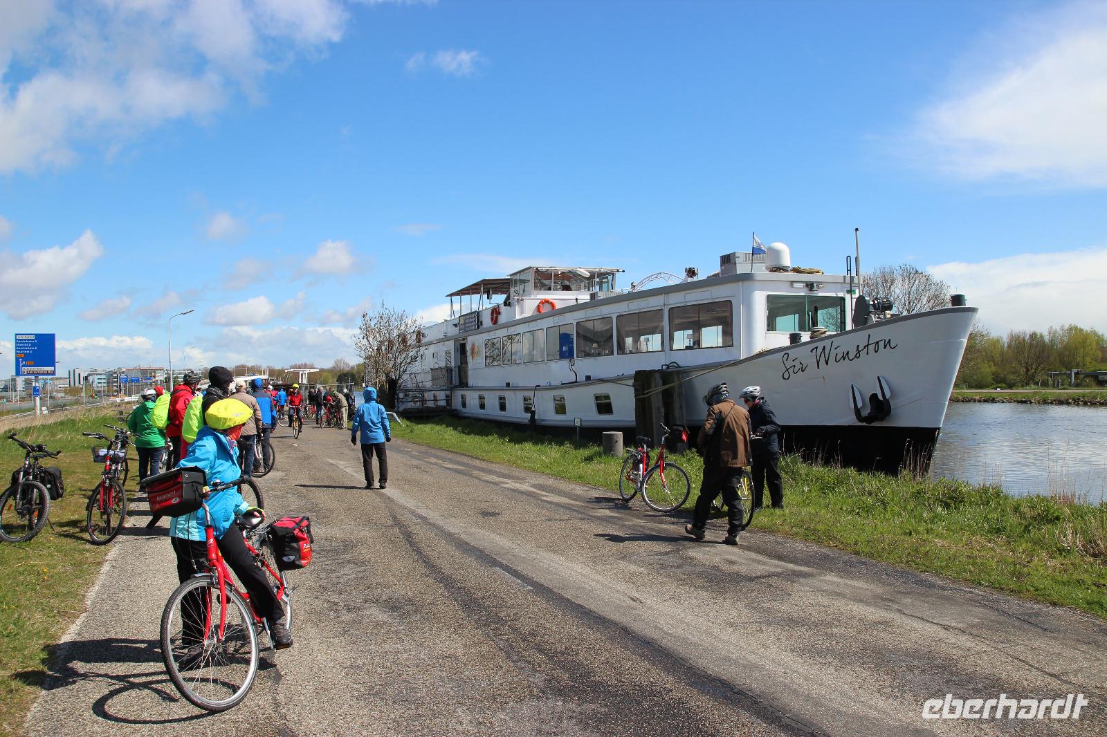 Durch die schöne Natur des Polderlandes entlang unzähliger Bauernhöfe und gepflegter Grundstücke führte uns unsere heutige Etappe in das beschauliche Oudewater. Uns empfing die interessante holländische Backstein-Architektur mit den typischen urbanen Strukturen eines mittelalterlichen Städtchens. Bei Sonnenschein genossen wir auf dem Martplatz unseren Cappuccino und verspeisten den ersten Teil unseres Lunchpaketes. Wir bestaunten gemeinsam die Hexenwaage. Es ist ein Foto mit Ulli überliefert, allerdings vor seinem Eintritt vor das Tribunal. Einige wollen gesehen haben, wie er mit einem Besen herauskam. Spaß hatten wir jedenfalls genug. Im zweiten Teil unserer Tour setzten wir die entspannte Fahrt fort, entlang wunderschöner Natur über Montfoort mit seinem Wasserschloss. Gudrun blieb heute an Bord mit der Aufgabe, als Wetterfee über uns zu wachen. Einschätzung: Weitestgehend gelungen. Als sie sich beim Kaffee verplauderte, erwischte uns doch noch ein Schauer kurz vorm Ziel. Dank der super Planung von Ulli, erwischte uns dieser beim Halt unter einer Brücke. Jetzt kam die Bergwertung. Wir hätten gar nicht erwartet, dass wir heute noch durch drei Serpentinen nach oben krakseln müssen. Nun war unsere MS Sir Winston schon in Sichtweite.