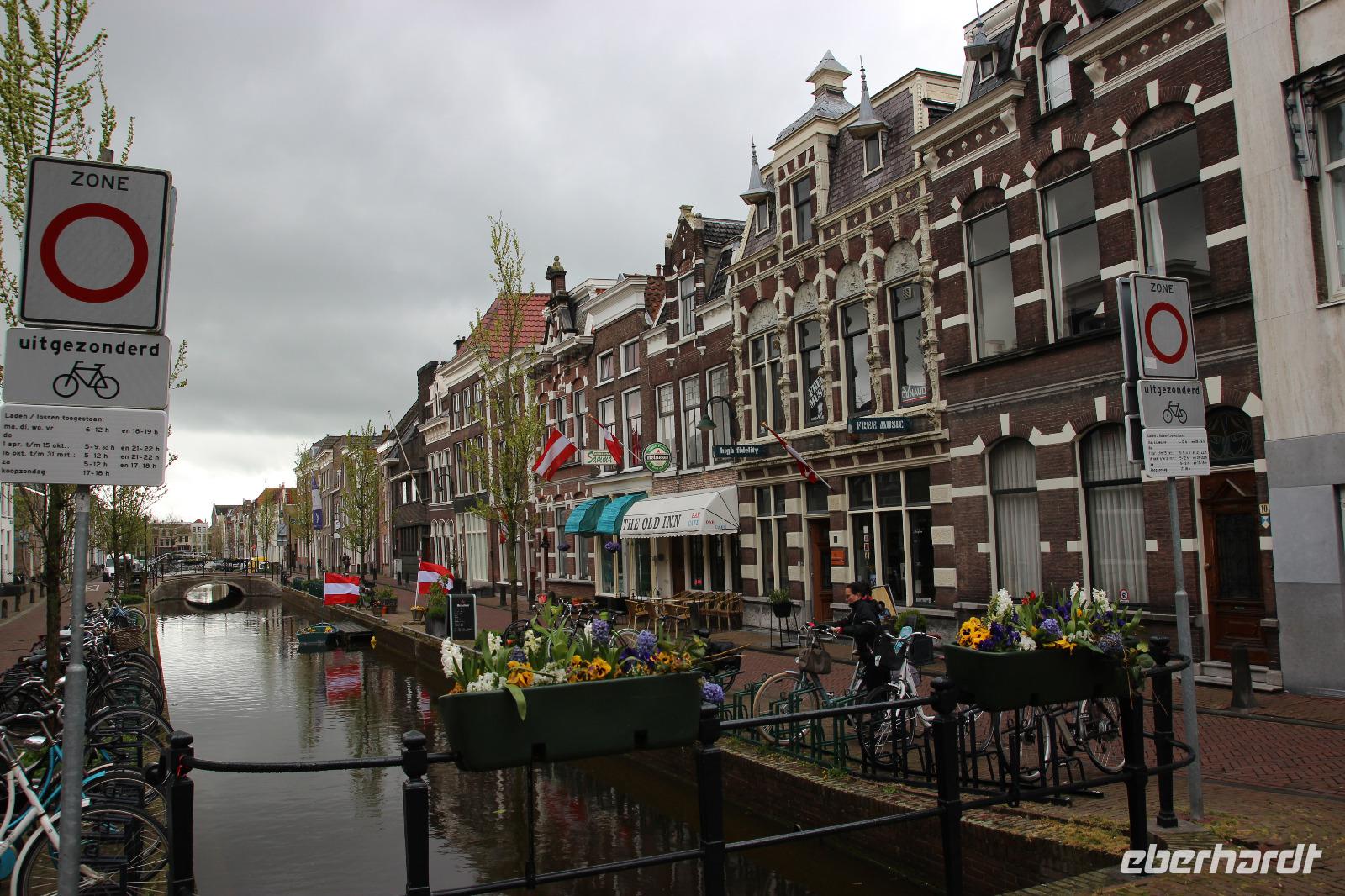 Unsere beiden jungen, dynamischen Radsportler Antje und Heiko nahmen heute die Qualen für alle anderen Gruppenmitglieder auf sich. Die Radtour heute führte von Rotterdam nach Delft und zurück. Entlang der Kanäle durch das Delftland, durch typische Natur war die Hinfahrt durch den ständigen Gegenwind mit durchschnittlicher Windkraft 5 eine echte Herausforderung. Delft ist mit seiner berühmten Porzellanmanufaktur und seinem historischen Marktplatz ein beschauliches Städtchen mit typischer mittelalterlicher Architektur. Nachdem wir uns aufgewärmt und gestärkt hatten, ermunterten uns die Glockenschläge vom Turm zur Rückfahrt, nunmehr ohne Gegenwind, dafür mit Hagelschauern. Als wir uns zum Kaffeetrinken auf unserem Schiff einfanden, empfingen uns die anderen Gäste mit Beifall und Anerkennung.