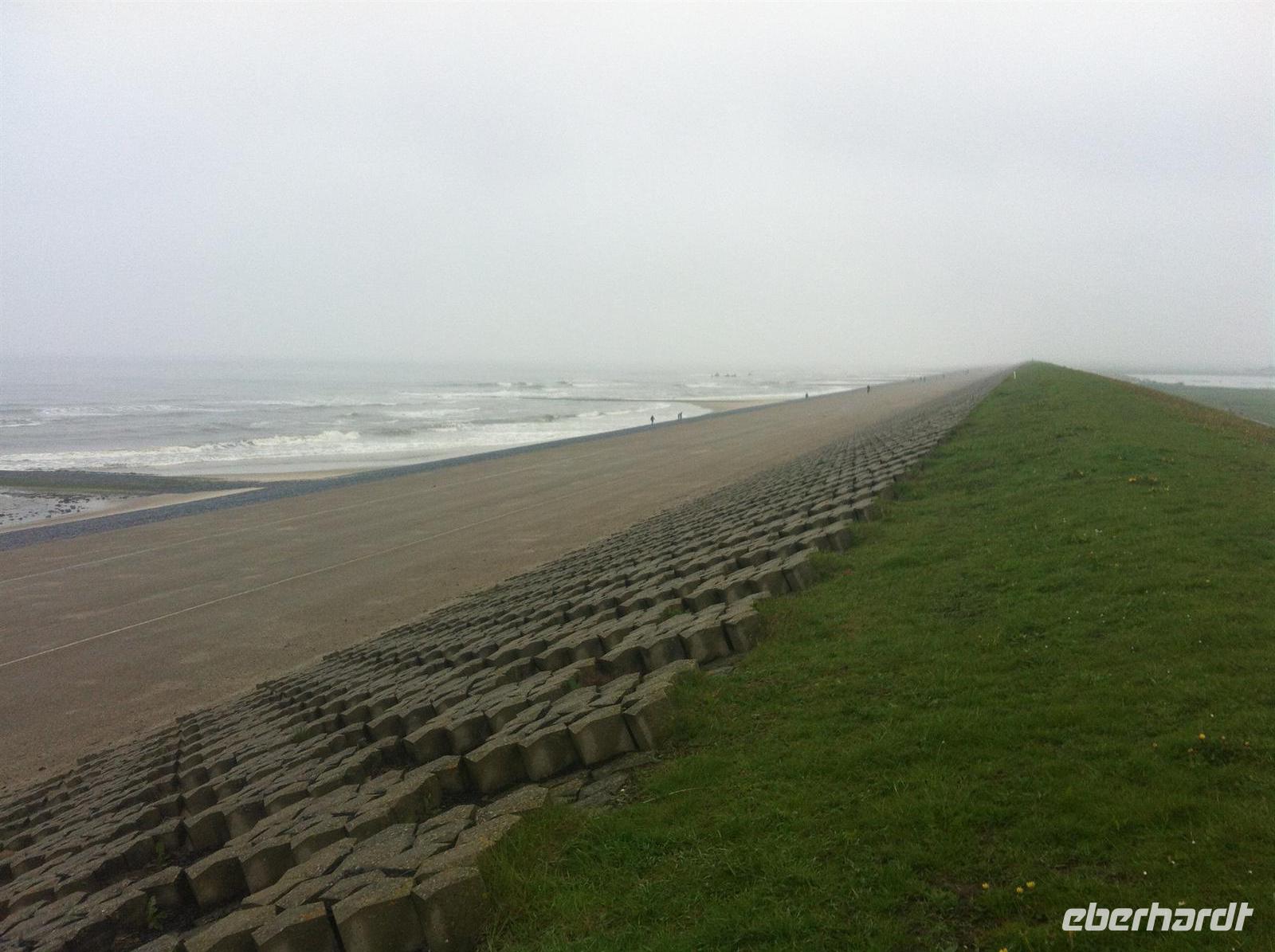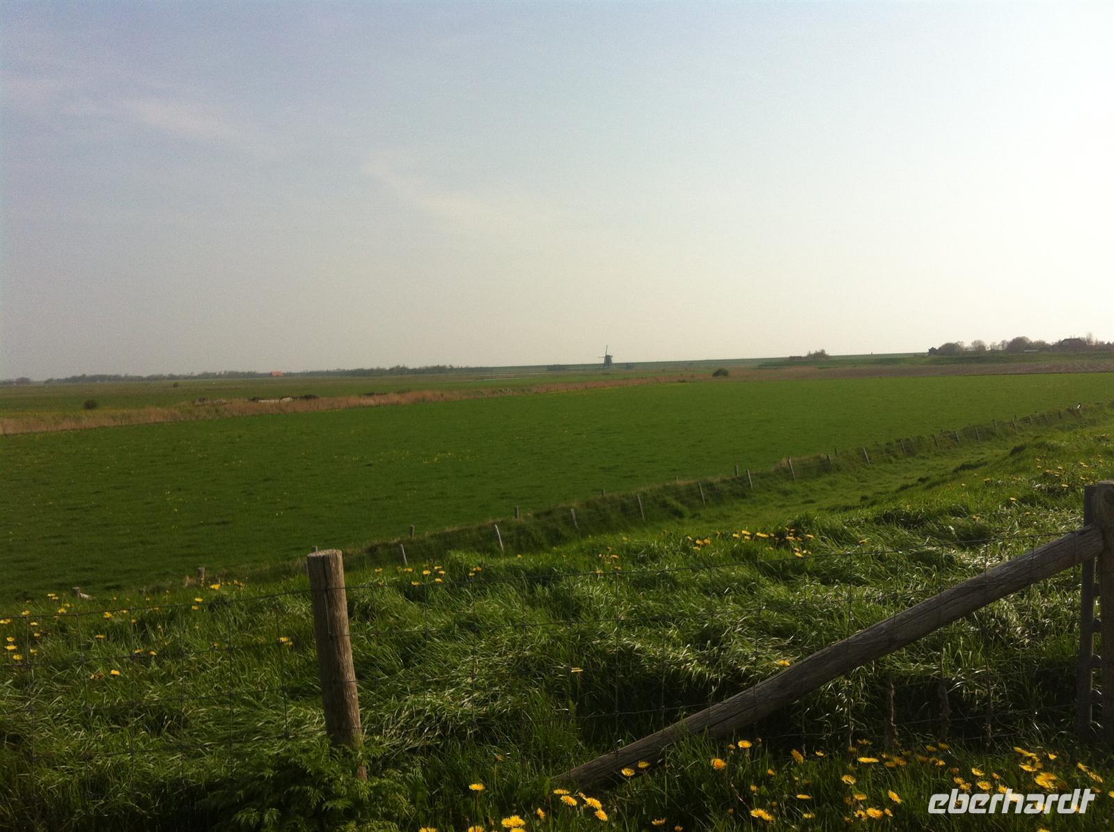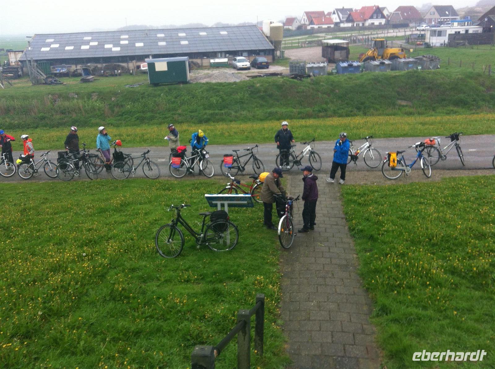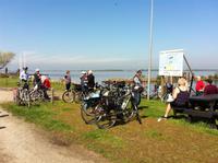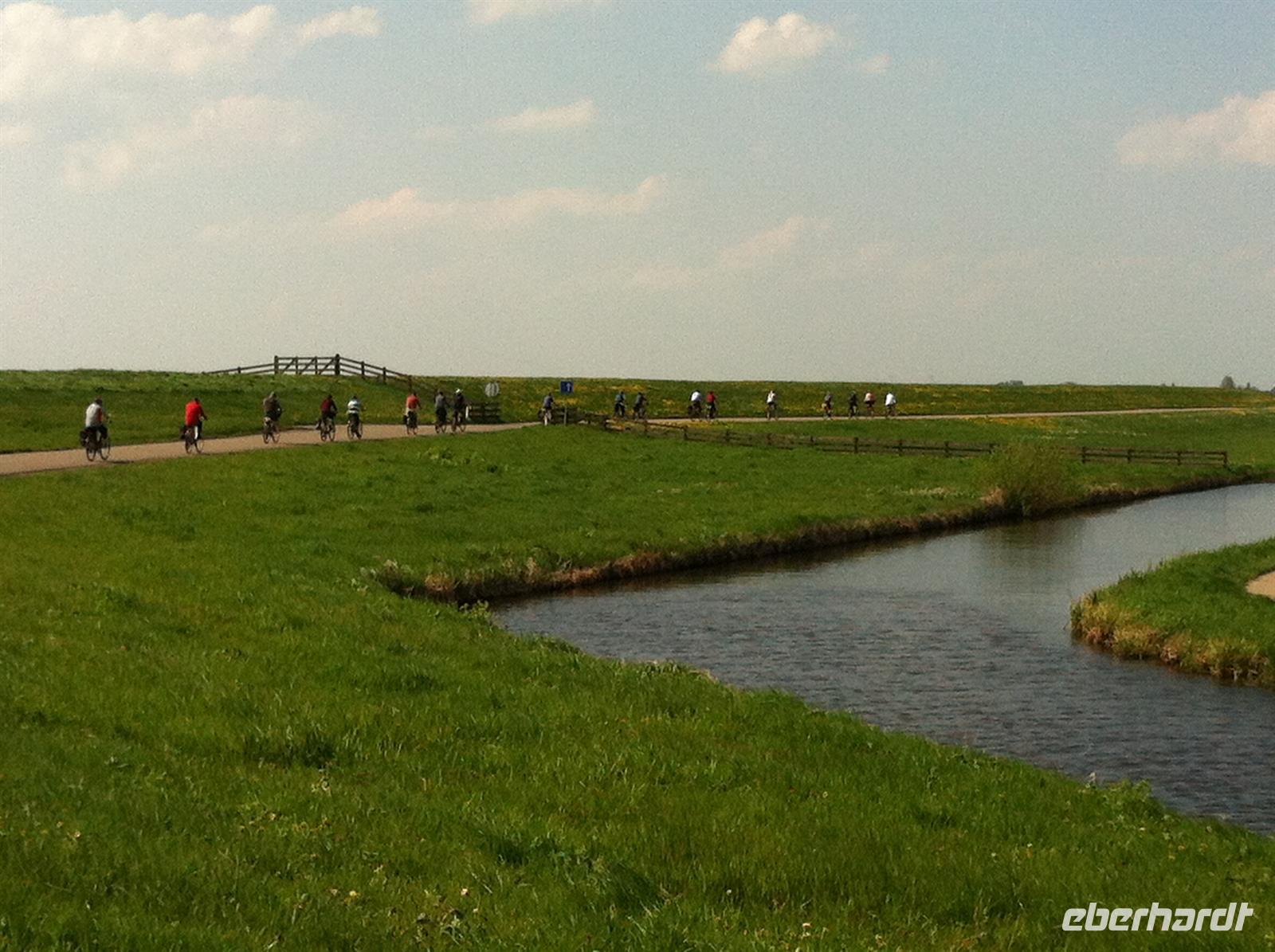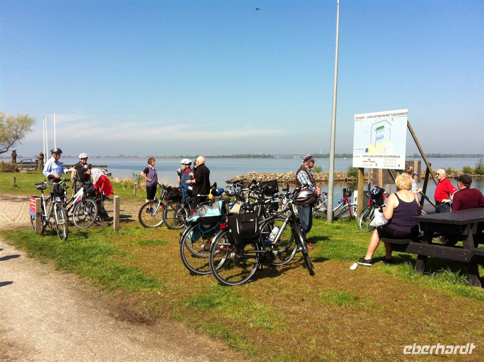 Kaum in Ekhuizen angekommen, wurden die Räder vom Schiff geladen und es konnte los gehen. Gemeinsam führten uns die ersten Kilometer immer entlang des Ijsselmeers bis nach Wervershoof. Wir mussten uns alle erst mal sortieren und unseren Platz in der Gruppe finden, zwischendurch erklärte uns Harald, unser Rad-Reiseleiter während der Woche, das System mit den Wegpunkten in den Niederlanden und wie man nach diesen Fahrrad fährt. Denn hier fährt man nach Zahlen und nicht nach Ortsnamen - ein interessantes System, aber wir haben ja jemanden, der uns vorausfährt und müssen uns so nicht allzu viele Gedanken darüber machen.