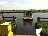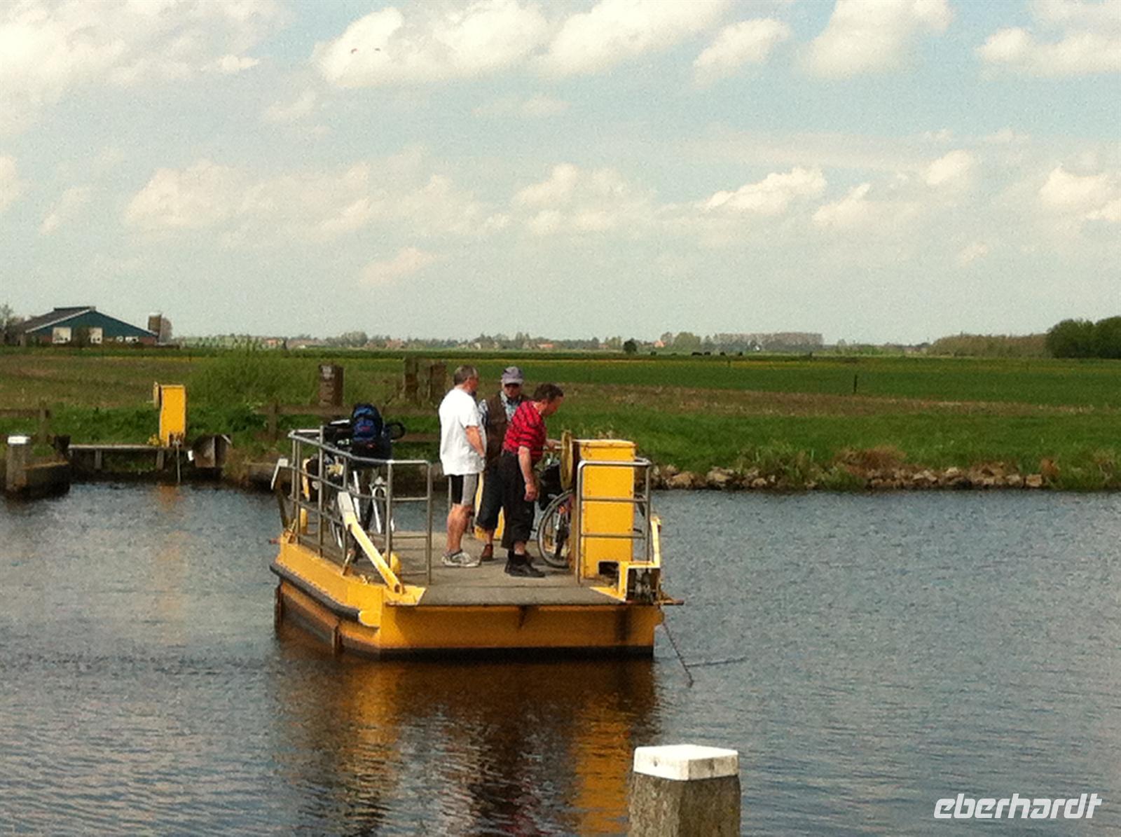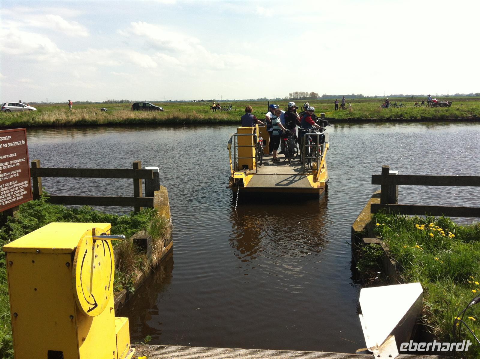 Gut gestärkt ging es nun weiter zu einem ganz speziellen Erlebnis: Die Wasserüberquerung per Fähre. Klingt erstmal wenig interessant, doch die Fähre musste durch Kurbeln im Handbetrieb über das Wasser gezogen werden und das nicht durch einen Fährmann, sondern durch uns selbst. So kurbelten wir uns Grüppchen für Grüppchen über den Kanal und nahmen dieses Überfahrt als kleinen Höhepunkt in unsere Erinnerungen auf, denn wann erlebt man dies schon? Als kleine Belohnung gönnten wir uns nach ein paar weiteren Kilometern auch ein gesundes Getränk, welches wir bei herrlichem Sonnenschein genossen, bevor wir dann auch das letzte Teilstück zurück nach Lemmer zurücklegten.