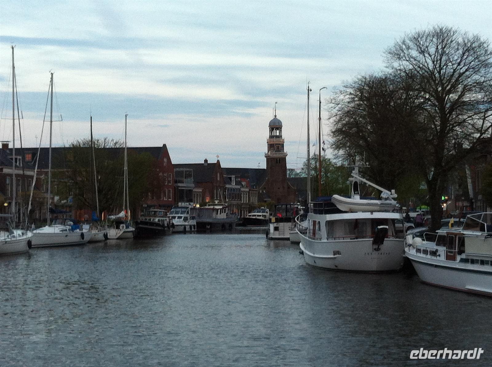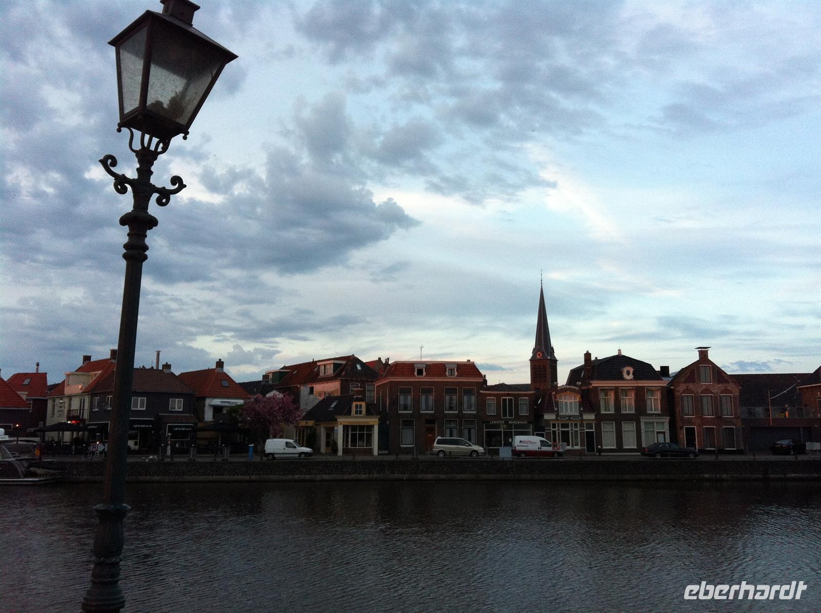 Kurz bevor wir die Küste des Ijsselmeeres wieder erreichte, überrasche uns ein kleiner Regenschauer, dem wir aber unsere angepasste Kleidung entgegensetzen wussten, so dass er sich schnell wieder verzog und wir mit zeitweisen Sonnenschein Stavoren erreichten. Unser Schiff war noch nicht da und nach einem Blick auf die Uhr wussten wir, dass genügend Zeit bleibt, für unsere Mittagsmahlzeit. Also stellten wir unsere Räder ab und genossen unseren Aufenthalt in Stavoren.