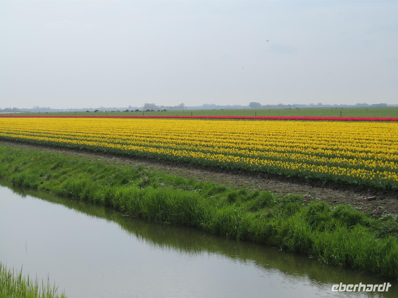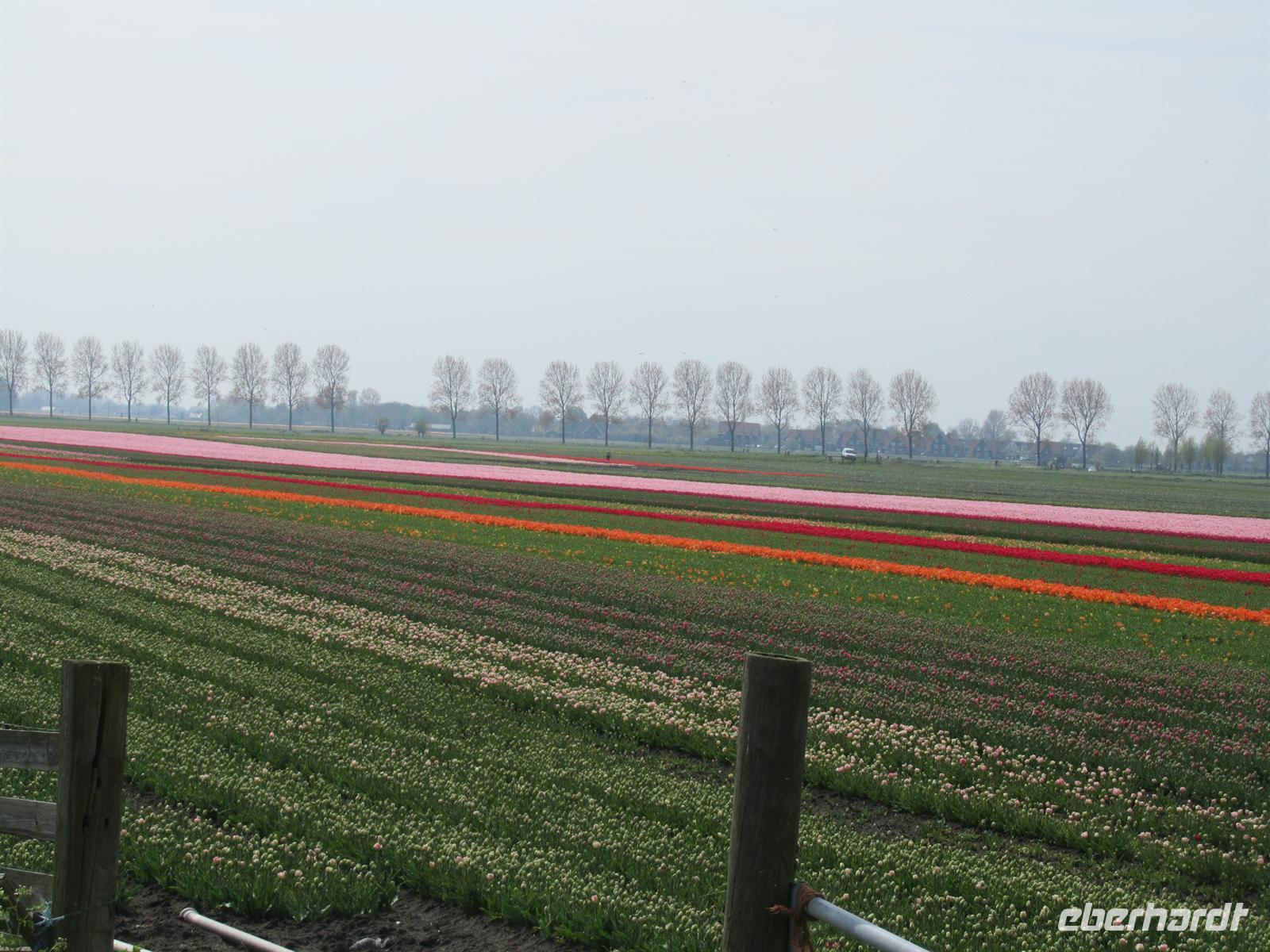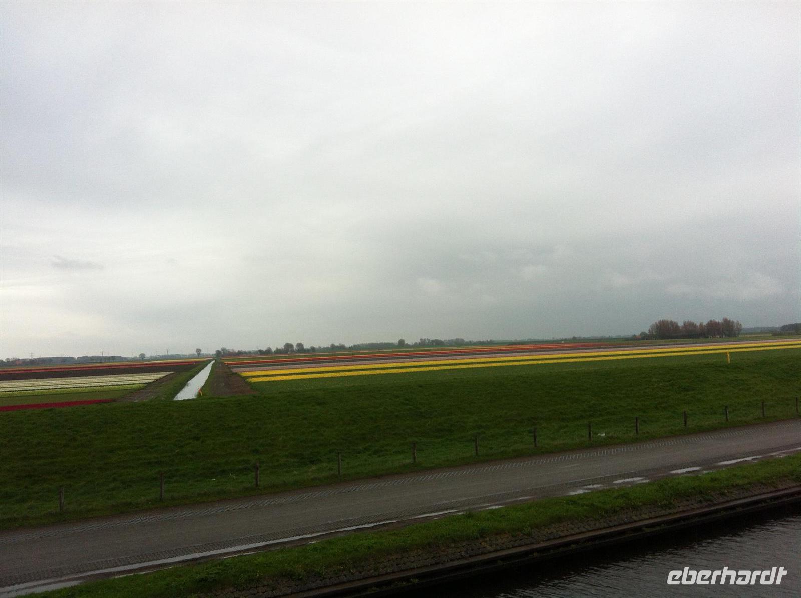 Ein lauter Donnerknall überfiel unsere Ohren am heutigen Tag. Er noch nicht ganz wach war, der war das spätestens jetzt. An Radfahren war zunächst kaum zu denken, denn der Regen ergoss sich in Strömen. Daher legten wir auch heute, wenn auch einer unplanmäßig, ein ganzes Stück mit den Schiff zurück. Entlang der Strecke bot sich ein Blick auf Tulpenfelder in allen Farbvarianten, die sich während der Fahrt auch wunderbar fotografieren ließen, sofern man nicht schon die Tage zuvor entsprechende Aufnahmen gemacht hat.