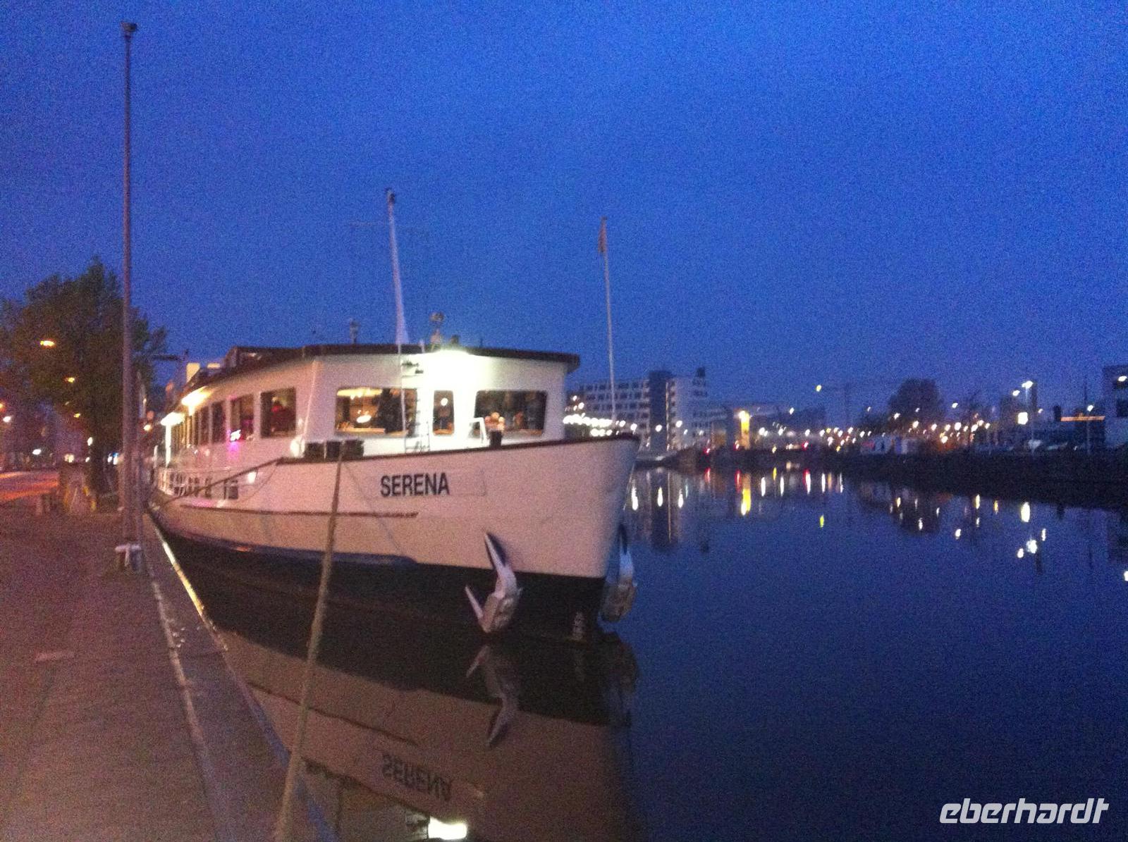 Es ist ein langer Weg nach Amsterdam, den wir mit dem Bus zurücklegen mussten, denn wir wollten auch unsere eigenen Räder mit dabei haben. Um die Abfahrt des Schiffs in Amsterdam nicht zu verpassen, ging es daher schon recht früh los, doch am Nachmittag kamen wir pünktlich in Amsterdam an. Nun schifften wir an Bord der „MS Serena“ ein und sollten nach den Sicherheitsbelehrungen eigentlich auch ablegen, doch machte uns das Wetter einen Strich durch die Rechnung, wir konnten nicht ablegen um nach Hoorn zu fahren, sondern mussten auf besseres Wetter für den kommenden Morgen hoffen. So ganz ungelegen kam uns das aber auch nicht, denn so hatten wir noch Zeit, um nach dem Abendessen Amsterdam zu entdecken und uns die Füße von unserer Busfahrt zu vertreten. Trotz Regen war in der Stadt beeindruckend viel los, das hatten wir alle nicht so richtig erwartet.