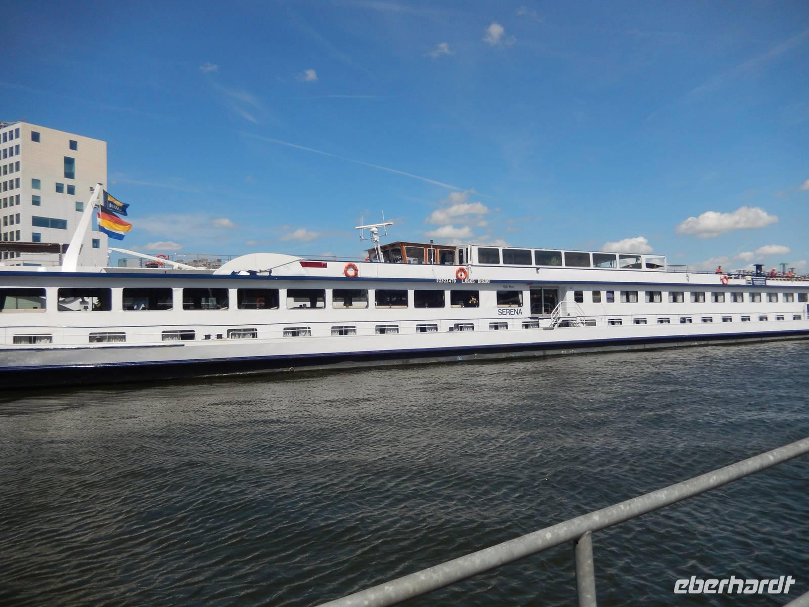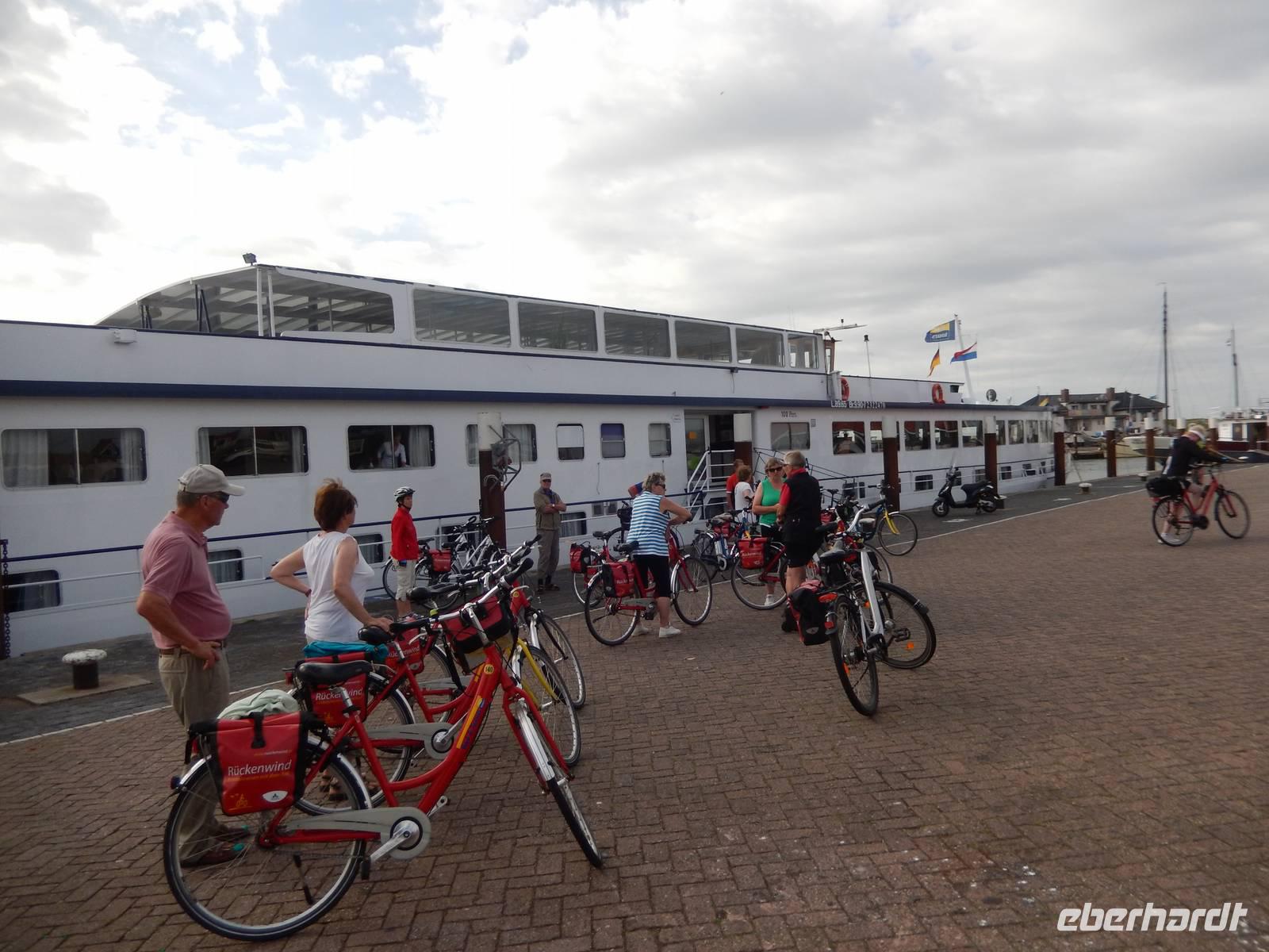 Nach einem kleinen Snack in der Innenstadt geht es wieder zurück zum Hotel, wo uns unser Bus zum Hafen Amsterdams bringt. Dort geht es auf unser schwimmendes Hotel für die nächsten Tage - die MS Serena. Die MS Serena ist ein gemütliches Flussschiff und wurde 1935 gebaut. Sie steht unter niederländischer Flagge und Führung, doch sprechen auch alle deutsch an Board. Nachdem wir unser Gepäck in den Kabinen verstaut haben, beginnt kurz darauf schon die Vorstellung unserer Bordcrew, sowie der Hinweis auf die diversen Sicherheitsbestimmungen am Schiff. Auch lernen wir an diesem Nachmittag unseren dortigen Reiseleiter Karl kennen, der uns für die nächsten Tage auf unseren Radtouren begleitet und uns das Land per Rad etwas näher bringt. Danach legt das Schiff in Richtung Volendam ab. Auf dem Sonnendeck genießen wir die Ausfahrt aus Amsterdam, bevor es zum Abendessen geht. Zum Abendessen erreichen wir auch unser erstes Ziel . Die schöne kleine Hafenstadt Volendam. Bei einem kleinen Stadtspaziergang erkunden einige dieses kleine, belebte Städtchen nördlich von Amsterdam und lassen den Abend in so mancher Bar an der Promenade ausklingen.