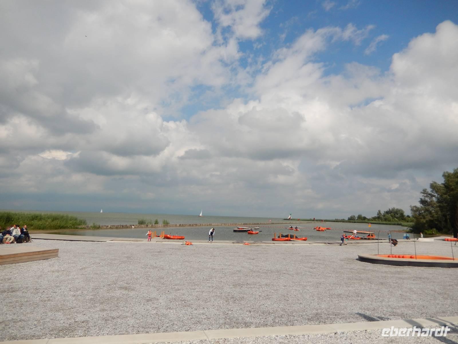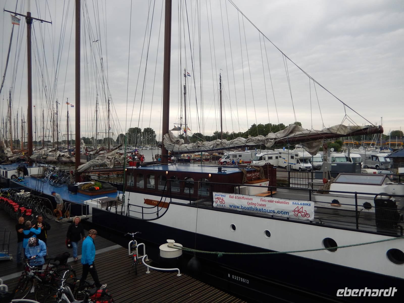 Am frühen Morgen startet das Schiff nach Lemmer. Nach dem Frühstück und Packen unserer Fahrradtaschen beginnen wir heute die große Radtour Richtung Stavoren. Rund 48 km warten darauf von uns beradelt zu werden. Bei schönstem Wetter und mit Rückenwind erreichen wir schnell das kleine Örtchen Wikel. Vorbei an zahlreichen Grachten, Feldern und Deichen erreichen wir unsere erste Raststätte in Balk. Der Tag verspricht vieles, denn die Tour hat es in sich. Nicht, weil die Wege in Holland so flach sind, sondern weil wir einige Zeit gegen den Wind fahren musten. Dies zehrt an unseren Kräften und wir beschließen kurzerhand an einem schönem Fleckchen Rast zu machen und dort unsere Lunchpakete zu verzehren. Das Fleckchen was wir uns aussuchen, heißt Harich und es ist herrlich dort. Hier kann man die vorbeisegelnden Schiffe vom Nahen bestaunen. Nachdem wir uns reichlich gestärkt haben, fahren wir weiter zum Knotenpunkt 34. In Holland sind die Radwege durch Knotenpunkte gezeichnet. Es gibt keine Karten wie bei uns in Deutschland sondern man richtet sich nach den ausgeschriebenen Punkten. Diese werden mit Tafeln und kleinen Schildern erkenntlich gemacht.