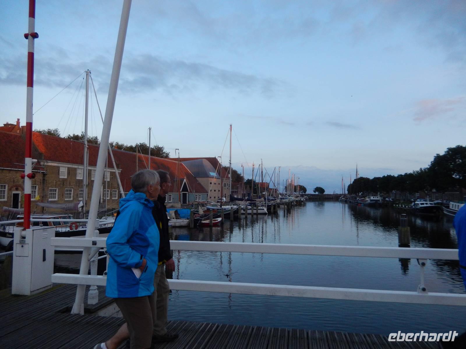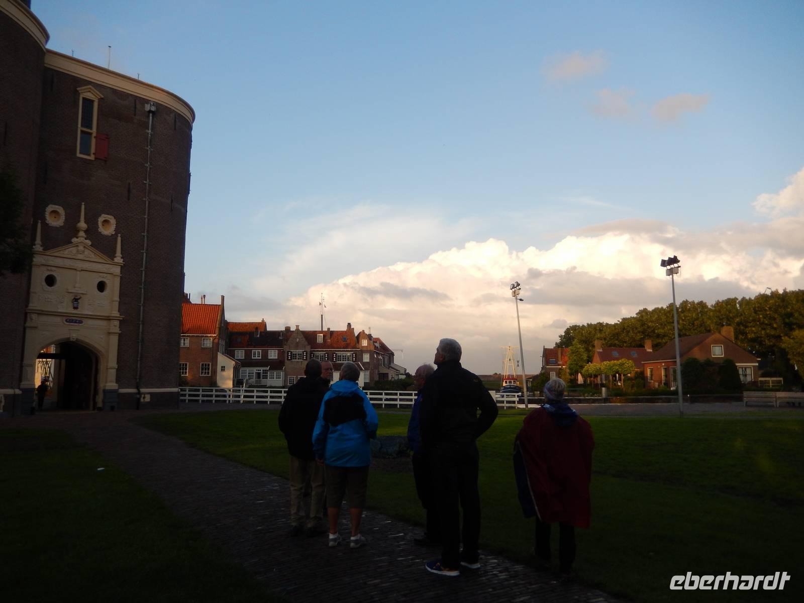Beim leckeren Abendessen lassen wir den ereignisreichen Tag Revue passieren und freuen uns gespannt auf die nächste Tour. Einige von uns machen sich nach dem Essen noch auf zum Stadtrundgang mit Karl. Als wir loslaufen wollten, wurden wir von einem stürmischen Platzregen überrascht, doch dieser nahm uns nicht die Neugierde das wunderschöne Städtchen Enkhuizen zu erkunden. Karl erzählt uns bei dem Rundgang einiges Wissenswertes über diese Stadt. So zum Beispiel vom Admiral der VCO,Snouck Van Loosen, der ein Alterswohnheim für Frauen im Enkhuizen errichten ließ, ebenso vom 540 n. Chr. erbauten Stadttor.