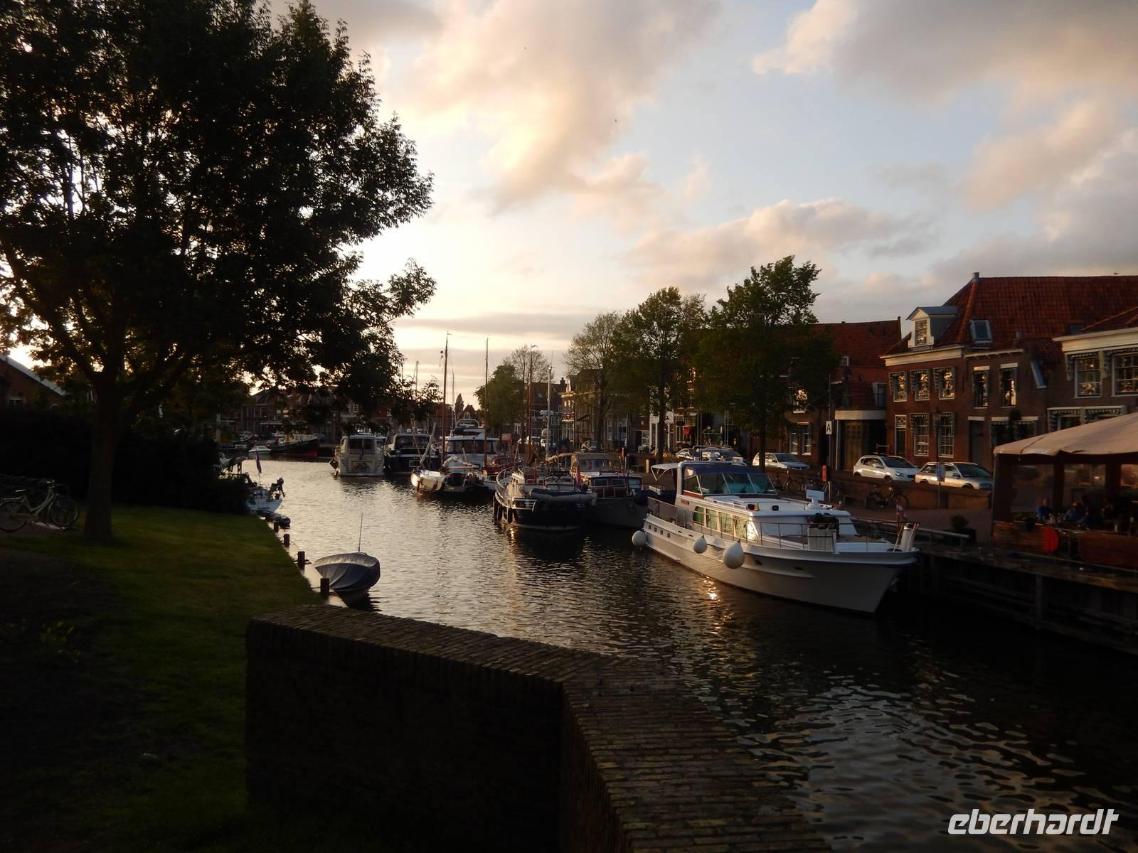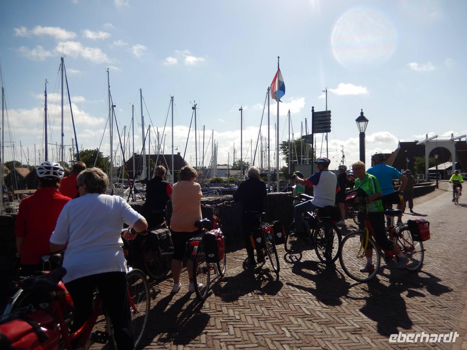 Heute erwartet uns eine schöne Radstrecke durch die herrliche Polderlandschaft Nordhollands. Am frühen Morgen heißt es wieder auf die Sattel und los. Wir genießen alle sichtlich das schöne sonnige Wetter und den Rückenwind. Nach gut 1,5 h Fahrzeit machen wir eine kleine Pause in Hindelopen. Die Friesen nennen es liebevoll Hylpen. Karl erzählt, dass das kleine beschauliche Örtchen eine öffentliche Kirche besitzt, die jedermann besichtigen kann. Dies wäre sehr selten für diese Region. Nach dieser kleinen Pause führen wir unsere Tour Richtung Makkum fort. Am Mittag erreichen wir die kleine Fähre vor De Gaastmar. Die Überfahrt ist für alle sehr lustig, denn der Fährmann singt und lacht für uns. Lakritzfreunde kommen auch hier auf ihre Kosten. In De Gaastmar wartet eine kleine Stärkung in einem kleinen Café auf uns. In der wunderschönen Landschaft geht es vorbei an Blumenwiesen, Grachten und Feldern. Über verschiedene Orte wie Parrega, wo sich eine herrliche Möglichkeit zum Verschnaufen bietet, erreichen wir am Nachmittag Makkum. Makkum bietet Möglichkeiten zum Bummeln und der Hafen lädt zum Verweilen ein. Hier vergisst man die Zeit, wenn man den Segelbooten nachschaut, die dort auslaufen. Am späten Nachmittag läuft auch die Serena nach Harlingen aus. In Harlingen angekommen, begeben sich alle nochmal in die Stadt, um diese zu erkunden. Die Innenstadt Harlingens ist wegen der malerischen alten Häuser mit Treppengiebeln (1600-1800), der Grachten und Häfen sehenswert. Die reformierte Kirche und das Rathaus datieren aus dem 18. Jahrhundert.