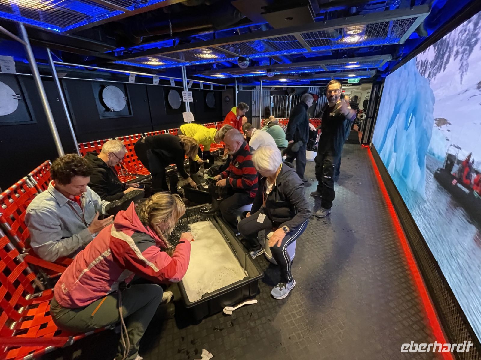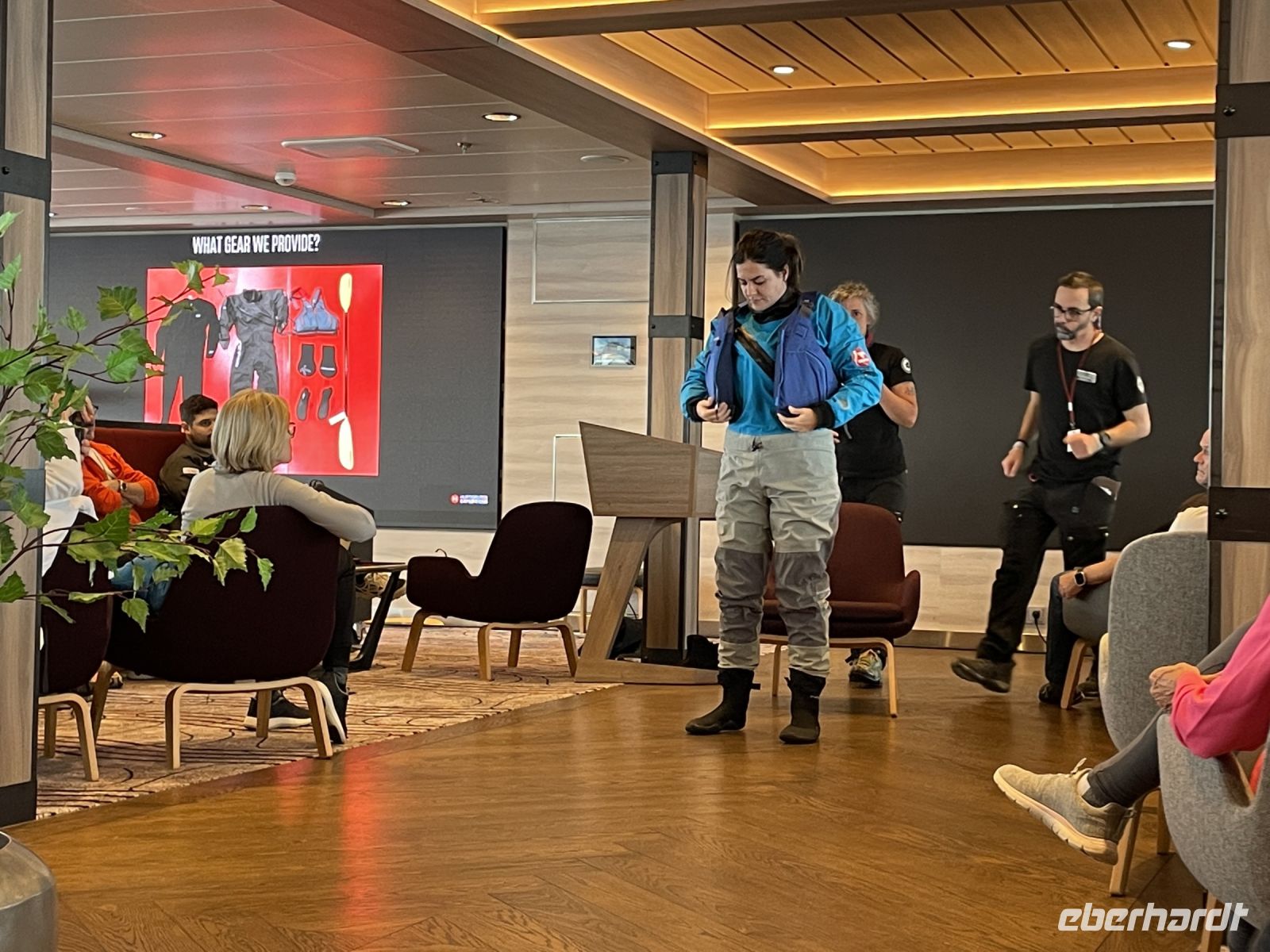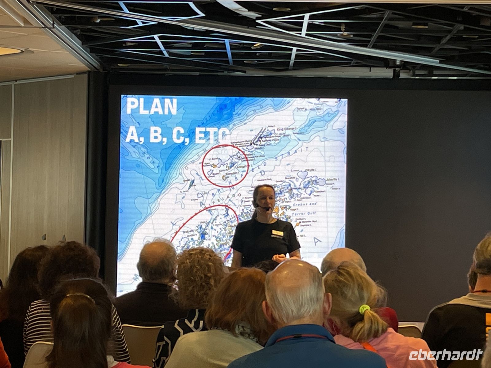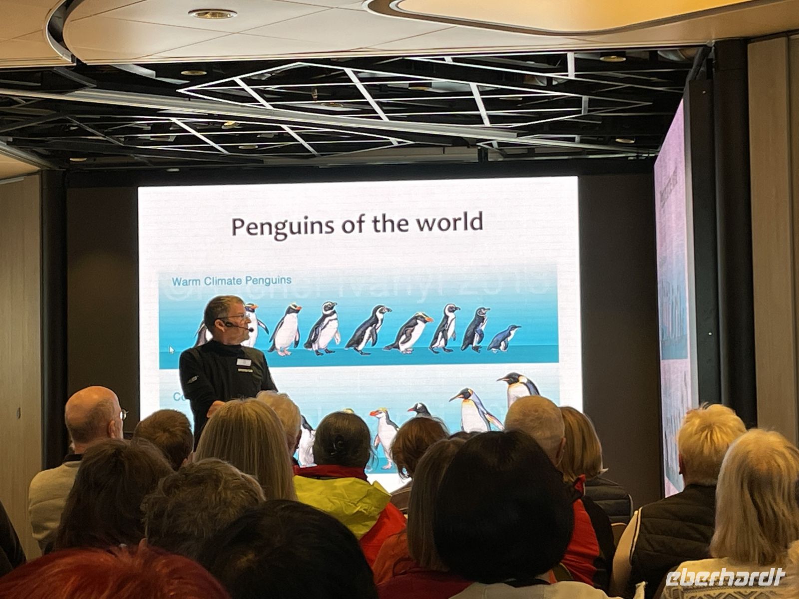 Anschließend werden wir beim verpflichtenden IAATO Briefing auf Deck 6 im Science Center über die Verhaltensregeln bei den Landgängen in der Antarktis aufgeklärt. Die Organisation IAATO, legt die Richtlinien für Reisen in die Antarktis fest. Jeder Reisegast muss sogar dafür unterschreiben, dass er beim Briefing gewesen ist. Danach werden wir bei weiteren Infoveranstaltungen über die Zusatzausflüge und die nächsten Tage in der Antarktis aufgeklärt.