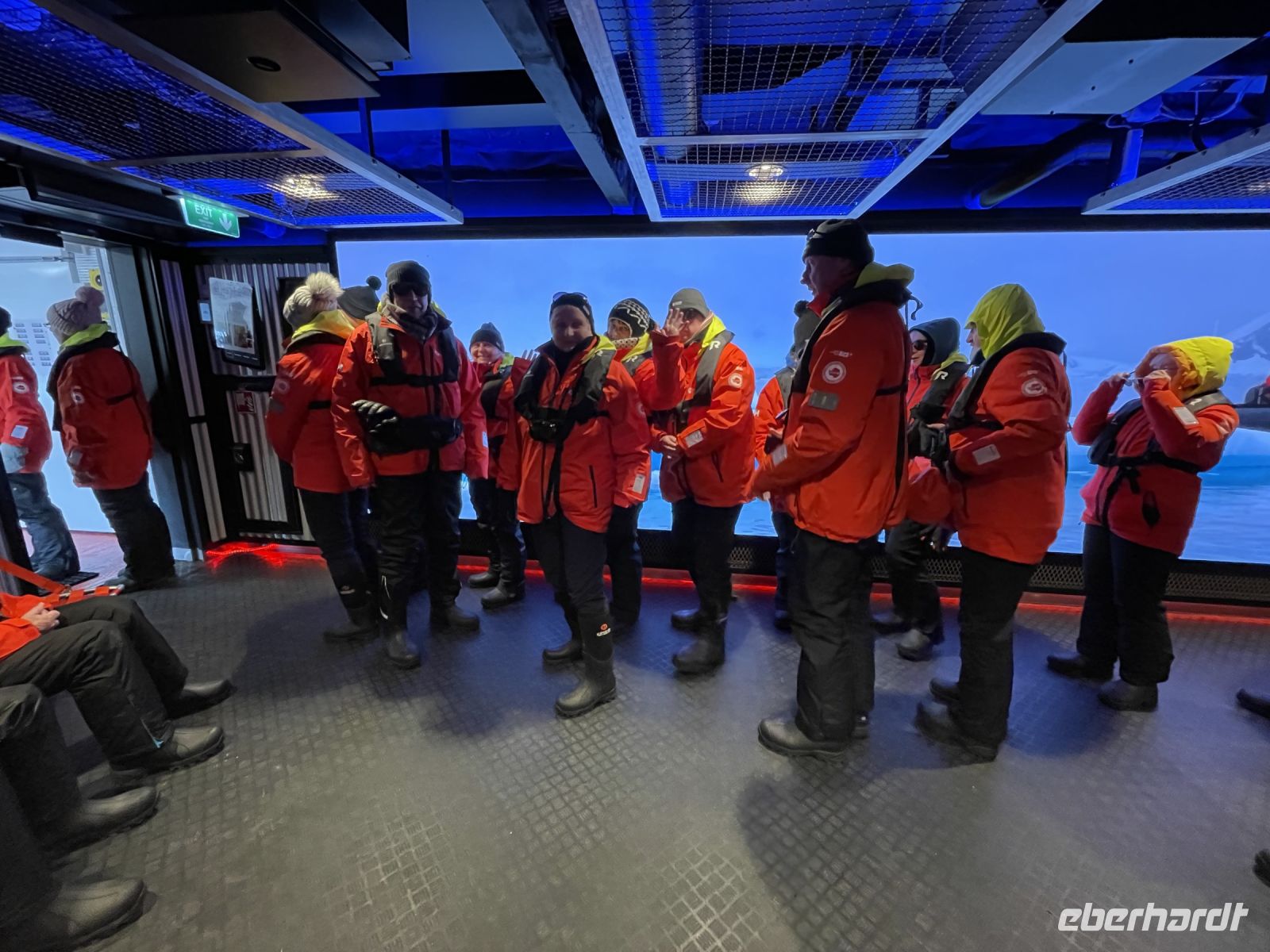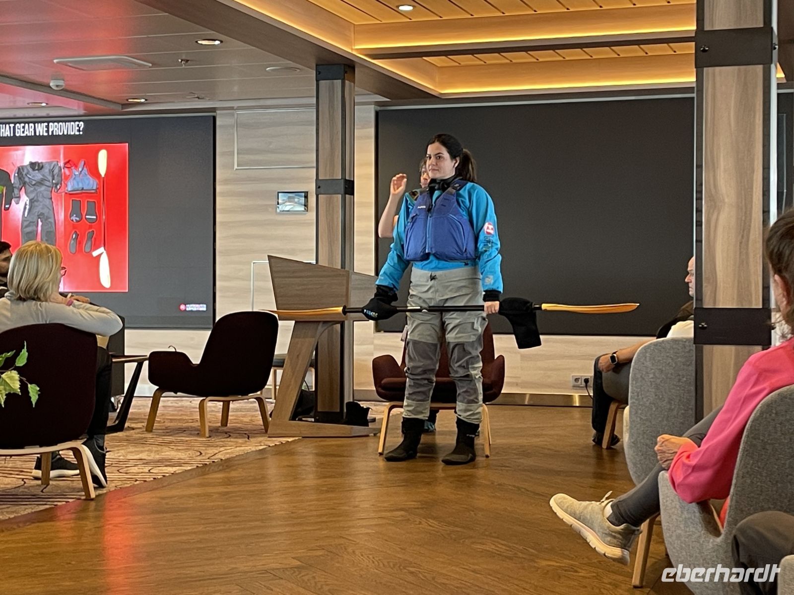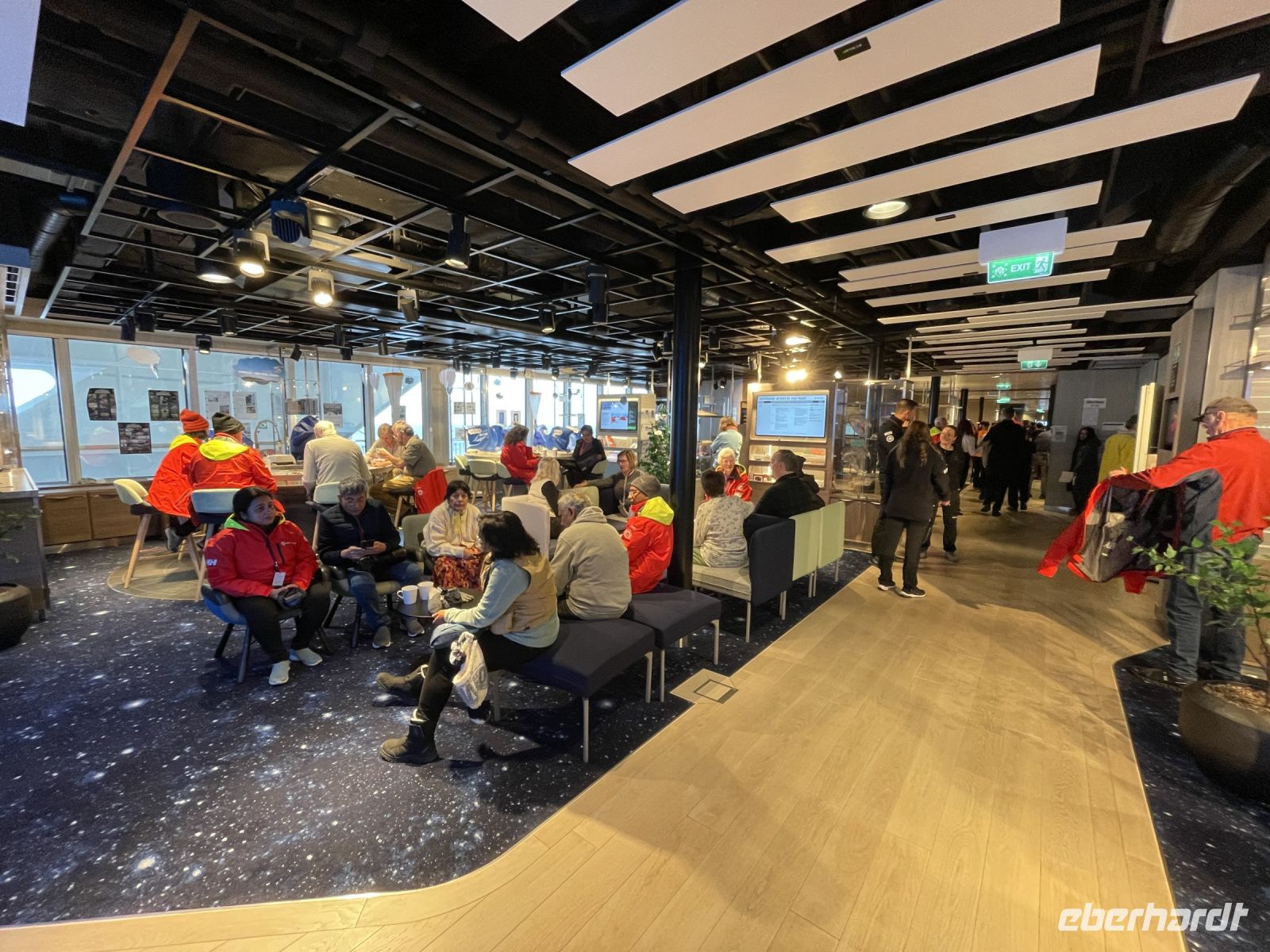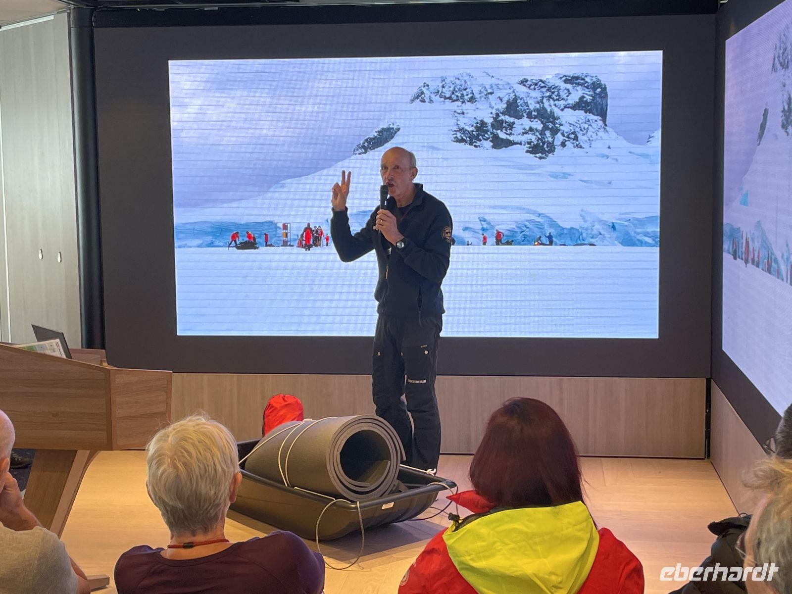 Anschließend werden wir beim verpflichtenden IAATO Briefing auf Deck 6 im Science Center über die Verhaltensregeln bei den Landgängen in der Antarktis aufgeklärt. Die Organisation IAATO, legt die Richtlinien für Reisen in die Antarktis fest. Jeder Reisegast muss sogar dafür unterschreiben, dass er beim Briefing gewesen ist. Danach werden wir bei weiteren Infoveranstaltungen über die Zusatzausflüge und die nächsten Tage in der Antarktis aufgeklärt.