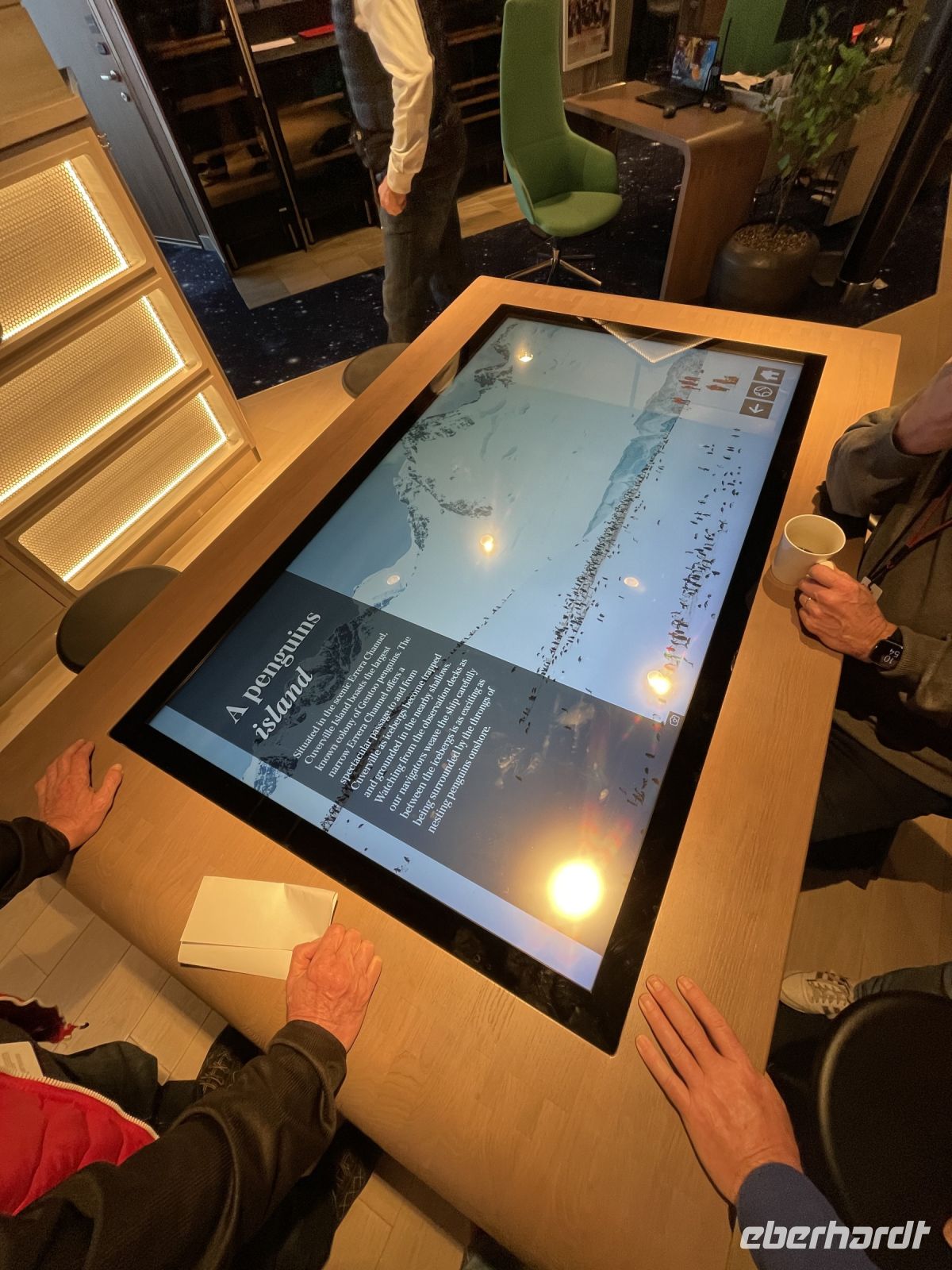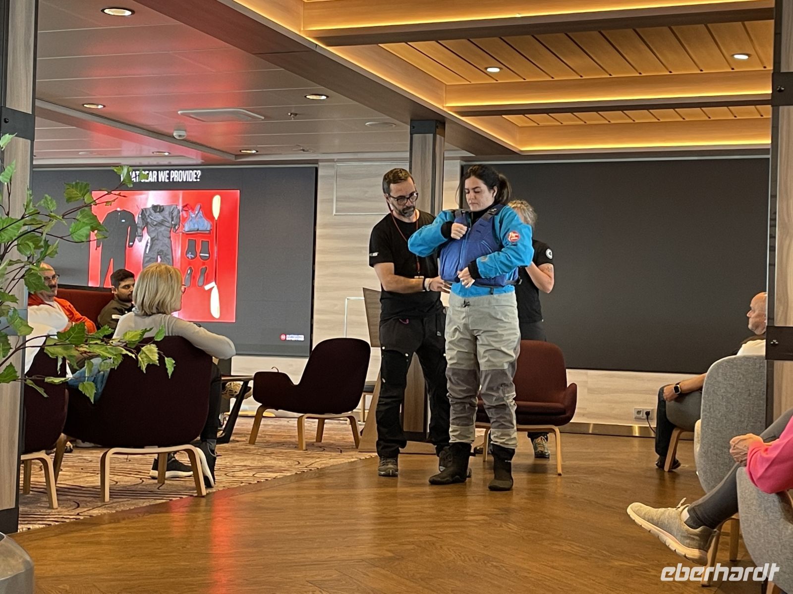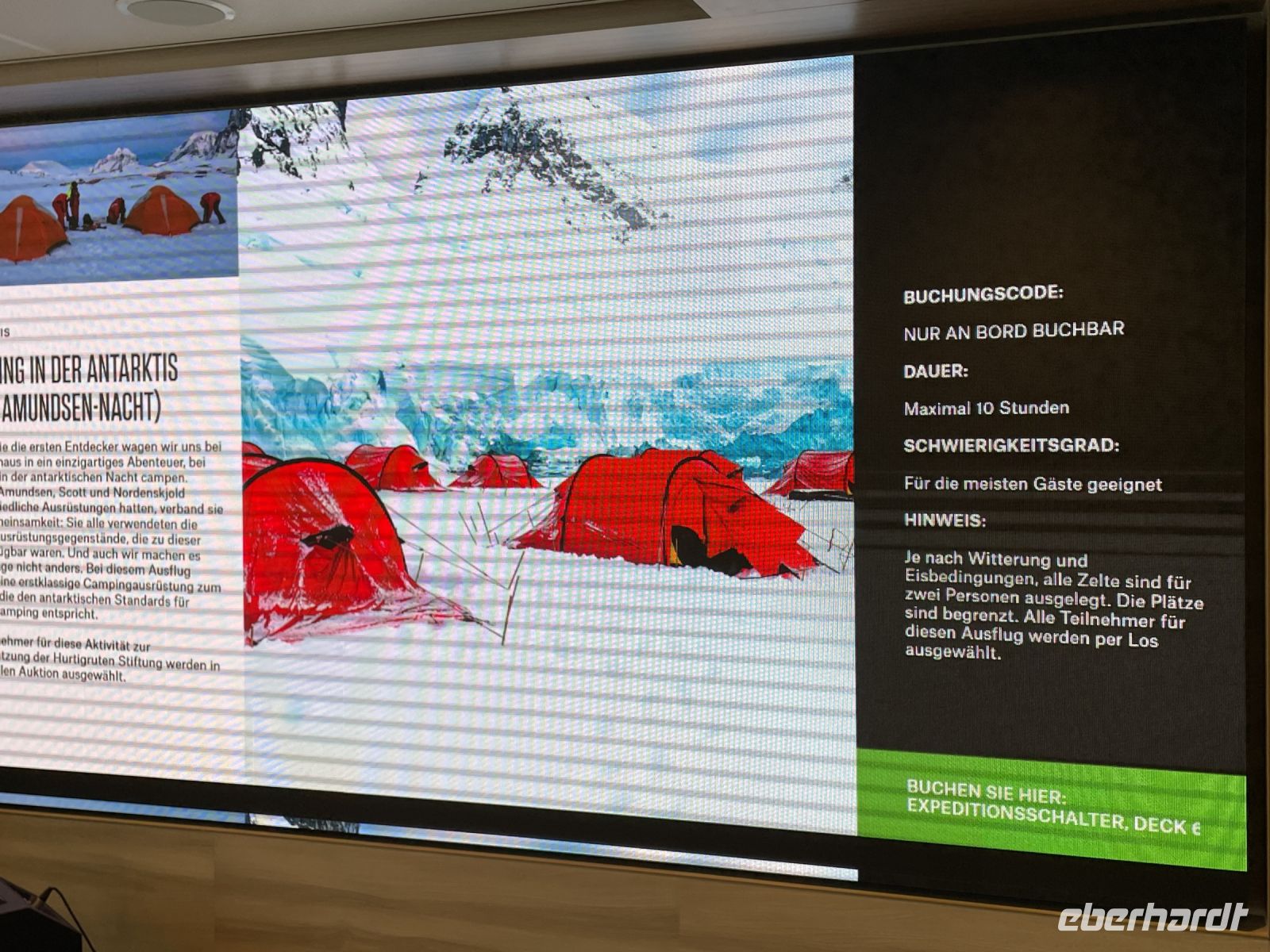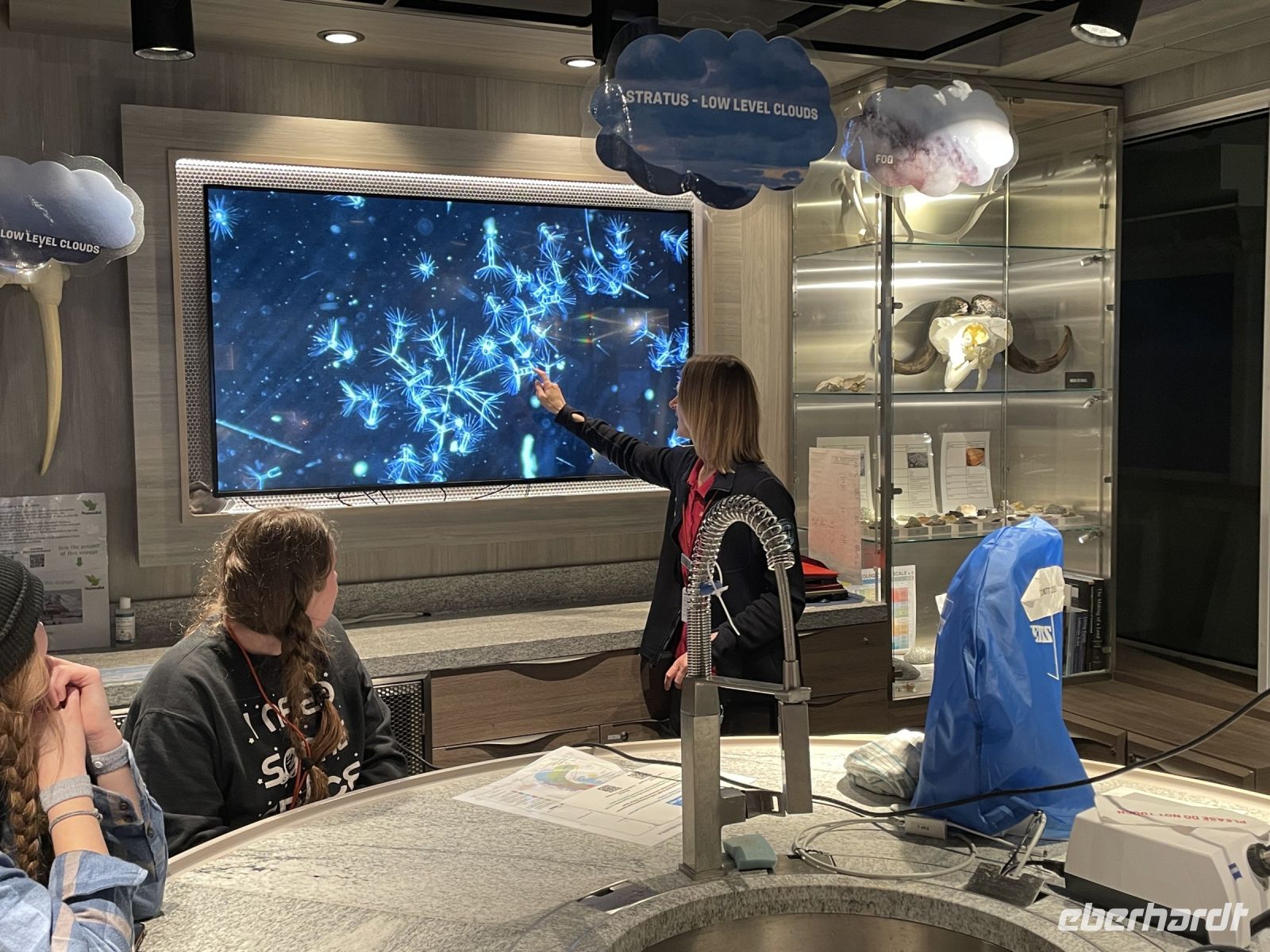 Anschließend werden wir beim verpflichtenden IAATO Briefing auf Deck 6 im Science Center über die Verhaltensregeln bei den Landgängen in der Antarktis aufgeklärt. Die Organisation IAATO, legt die Richtlinien für Reisen in die Antarktis fest. Jeder Reisegast muss sogar dafür unterschreiben, dass er beim Briefing gewesen ist. Danach werden wir bei weiteren Infoveranstaltungen über die Zusatzausflüge und die nächsten Tage in der Antarktis aufgeklärt.