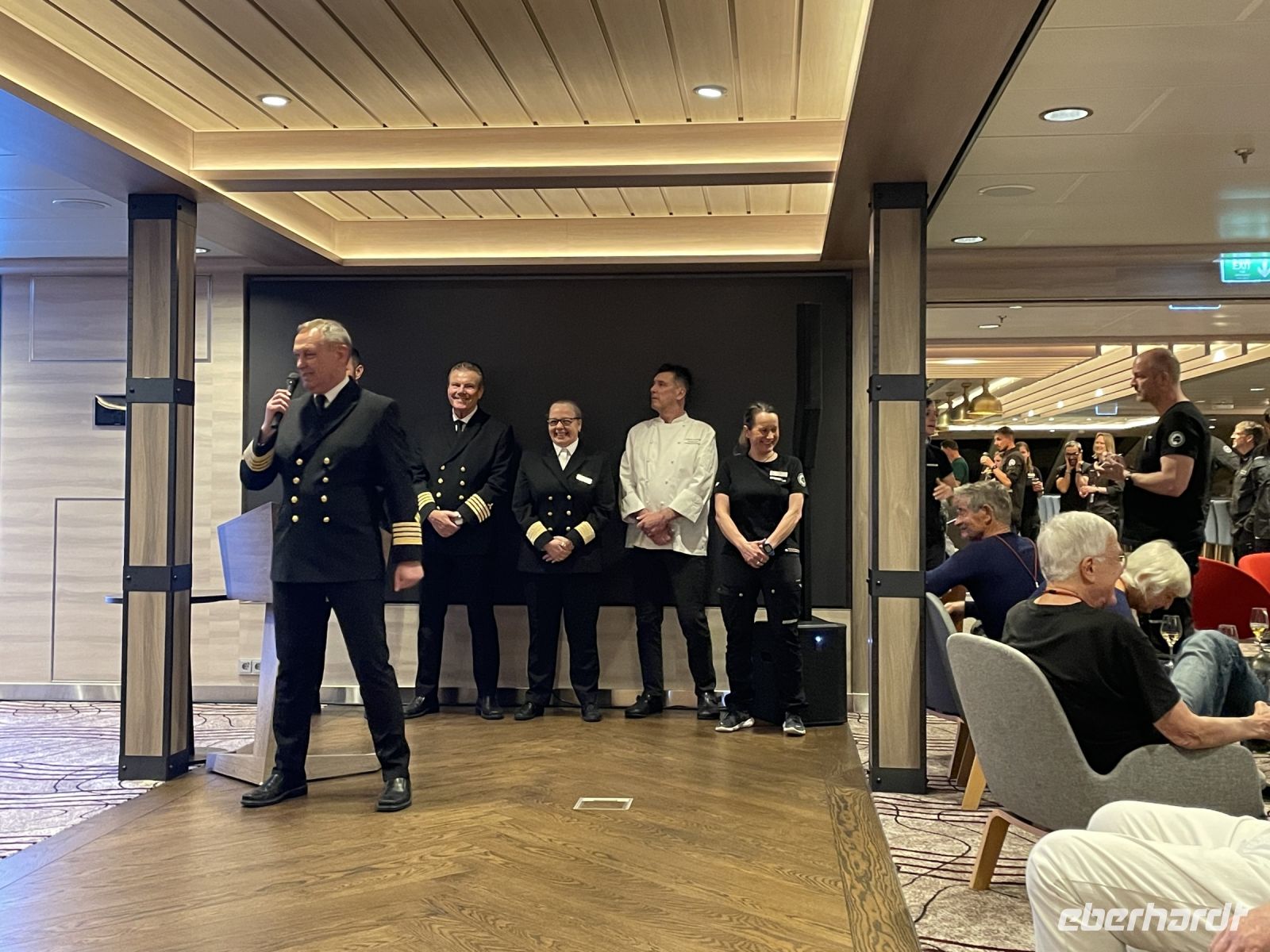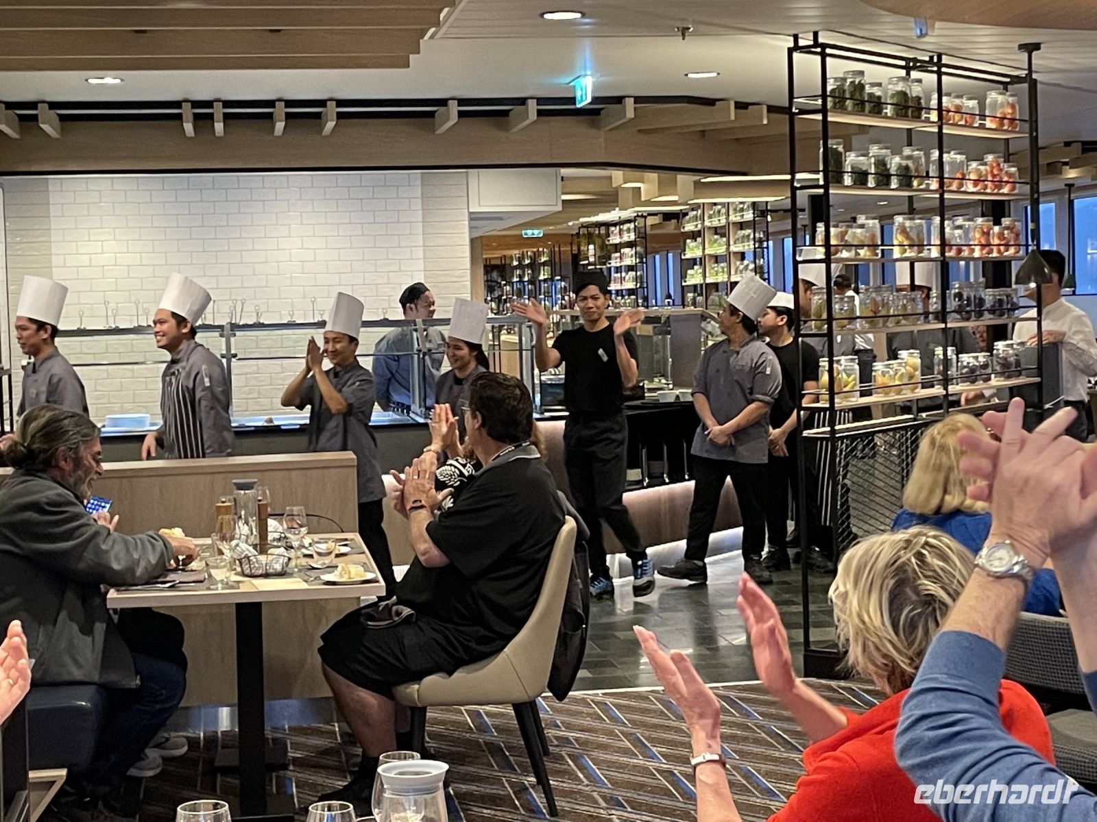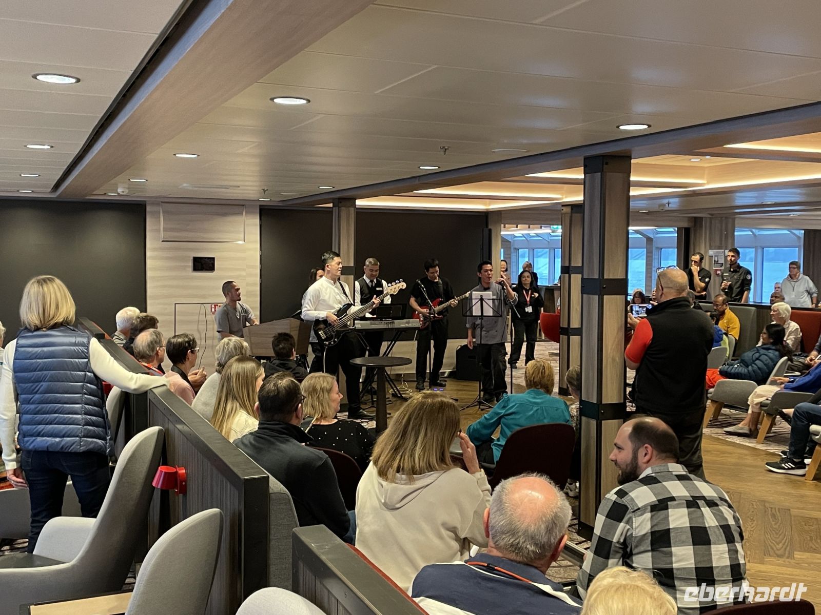 An unserem 13. Reisetag besuchen wir tagsüber noch einige interessante Vorträge. Vor dem Abendessen verabschiedet sich der Kapitän von uns auf Deck 10 und die Schiffsband gibt ein kleines Abschieds-Konzert. Auch unser Lieblings Kellner Marc ist Teil der Band. Alle sind begeistert.