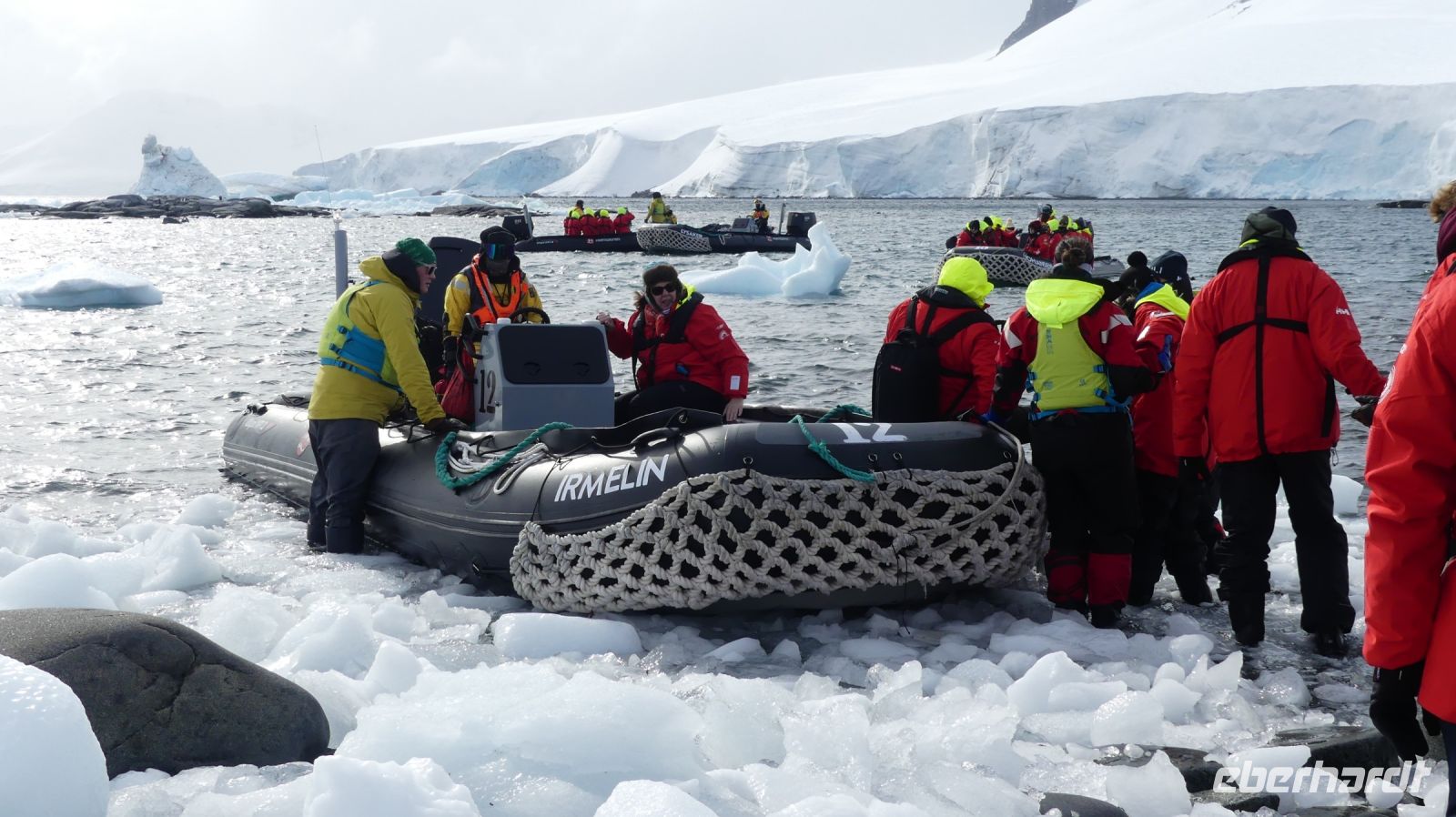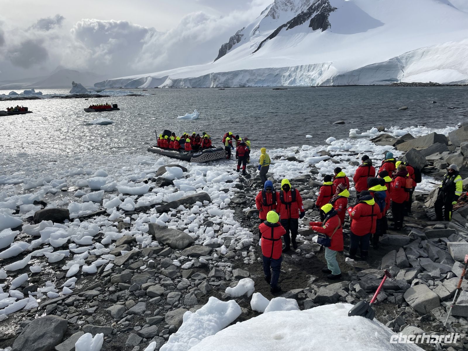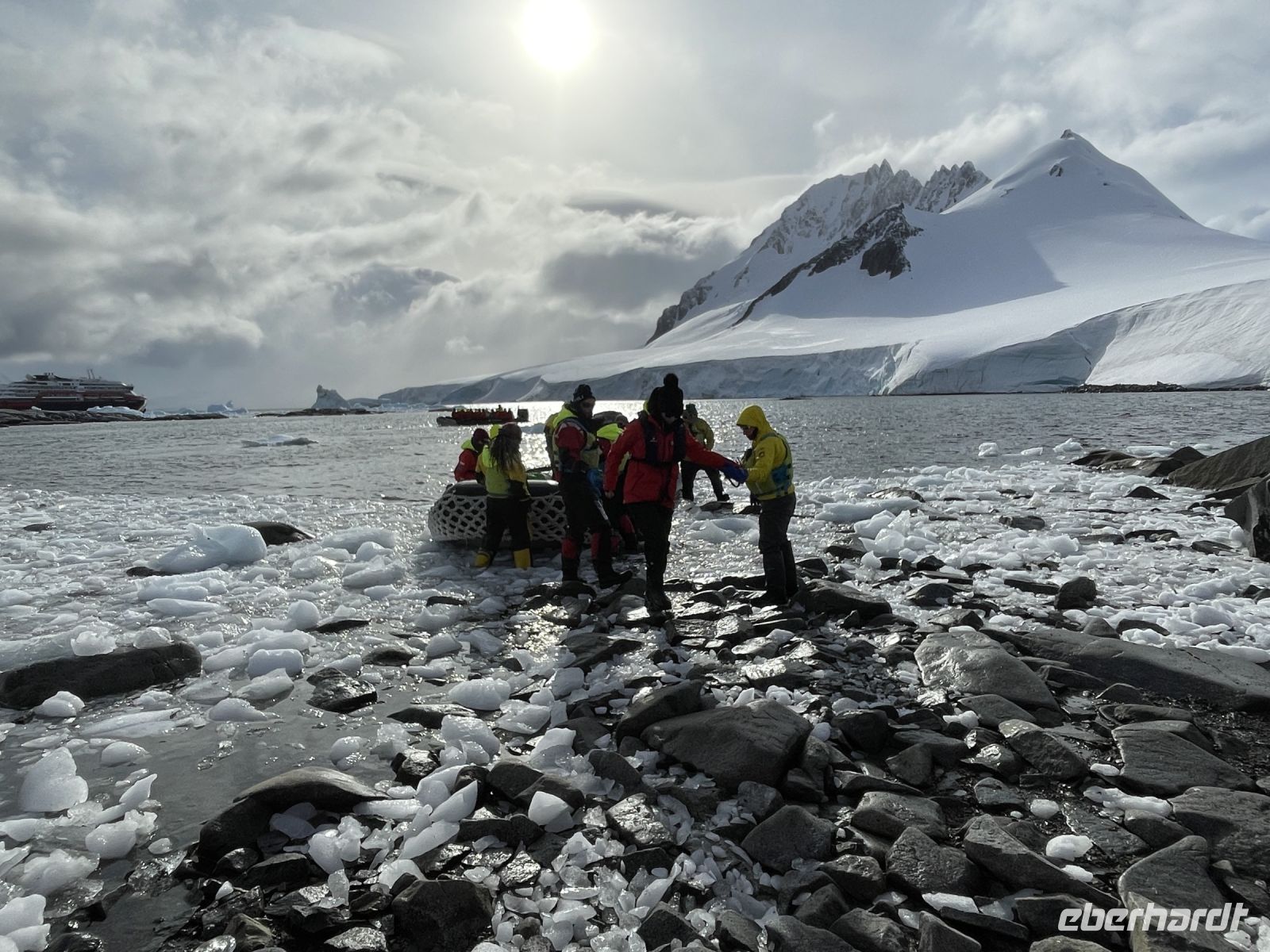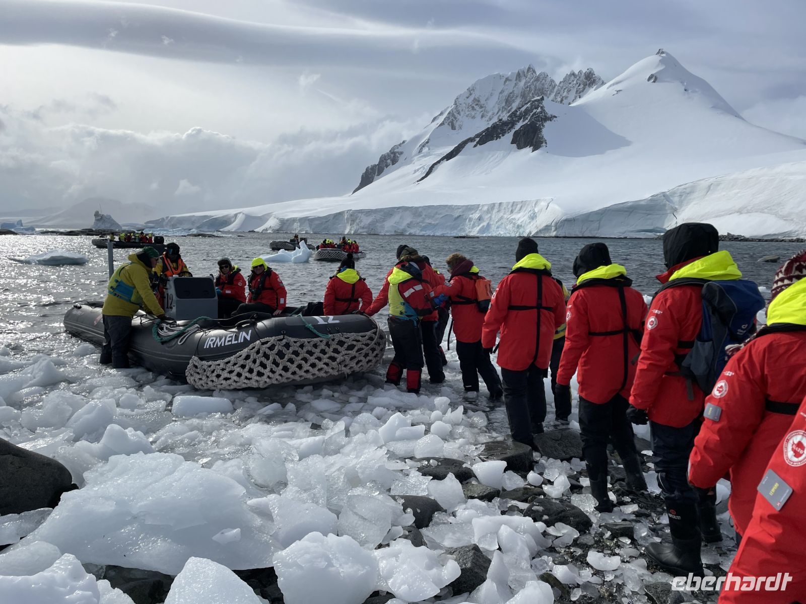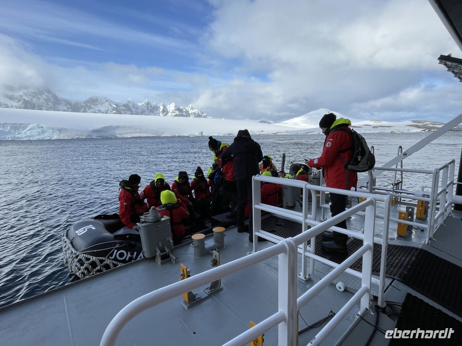 Gesagt getan… über die Bordlautsprecher erfahren wir, dass wir zuerst in die Wilhelmina Bay fahren, um dort Eisberge und Gletscher zu bestaunen und dann am Nachmittag in Danco Island an Land gehen. Nach dem Mittagessen geht es endlich los. Wir treffen uns alle dick angezogen und schwitzend auf Deck 3, um von der Expeditionslounge (neben der Schlauchbootgarage) aus in ein Zodiac-Schlauchboot zu steigen. Beim Verlassen und Betreten des Schiffs passieren wir immer die Stiefelreinigungsstation. Dann steigen wir ein und fahren ca. 5min. zur Anlandungsstelle. Alle sind sehr aufgeregt und die Vorfreude ist bei allen deutlich spürbar. Bei der Anlandung und beim Aussteigen ist das Expeditionsteam stets behilflich. Ein kleiner Schritt und dann haben wir es geschafft… unsere ersten Meter auf dem 7. Kontinent. Für viel Reisegäste ein ganz besonderer Moment, denn für die meisten ist die Antarktis der noch fehlende Kontinent in der Reisehistorie.