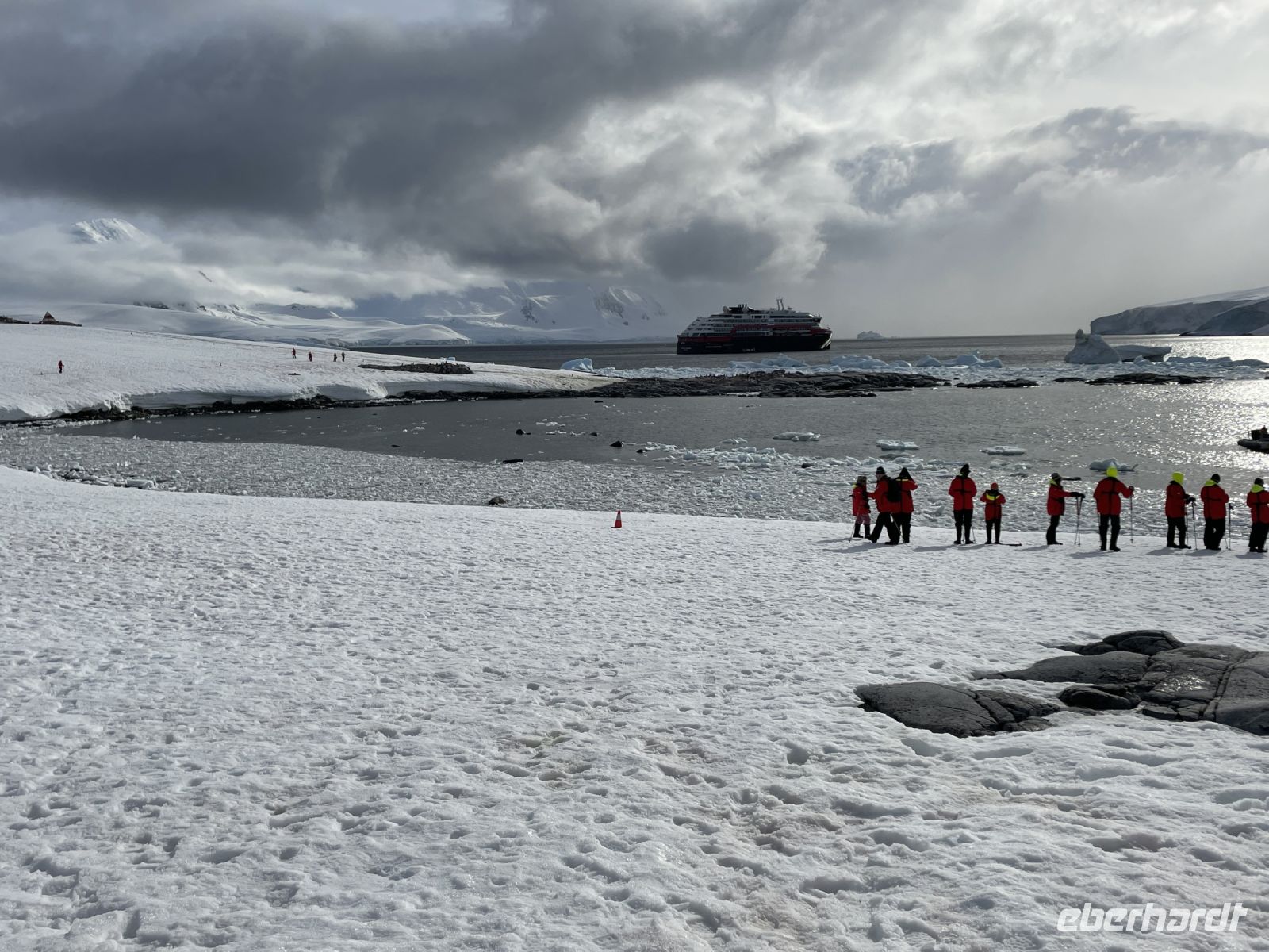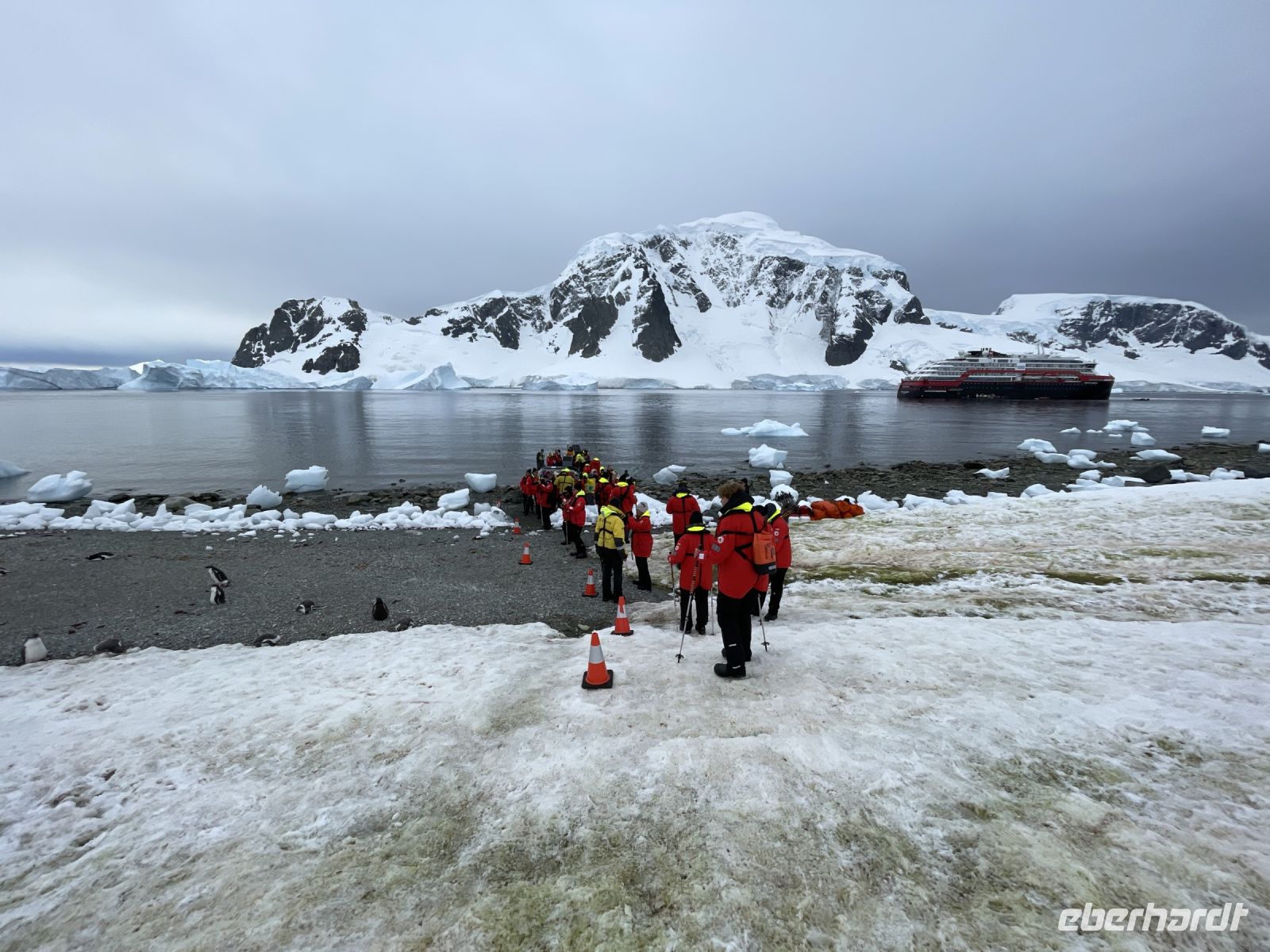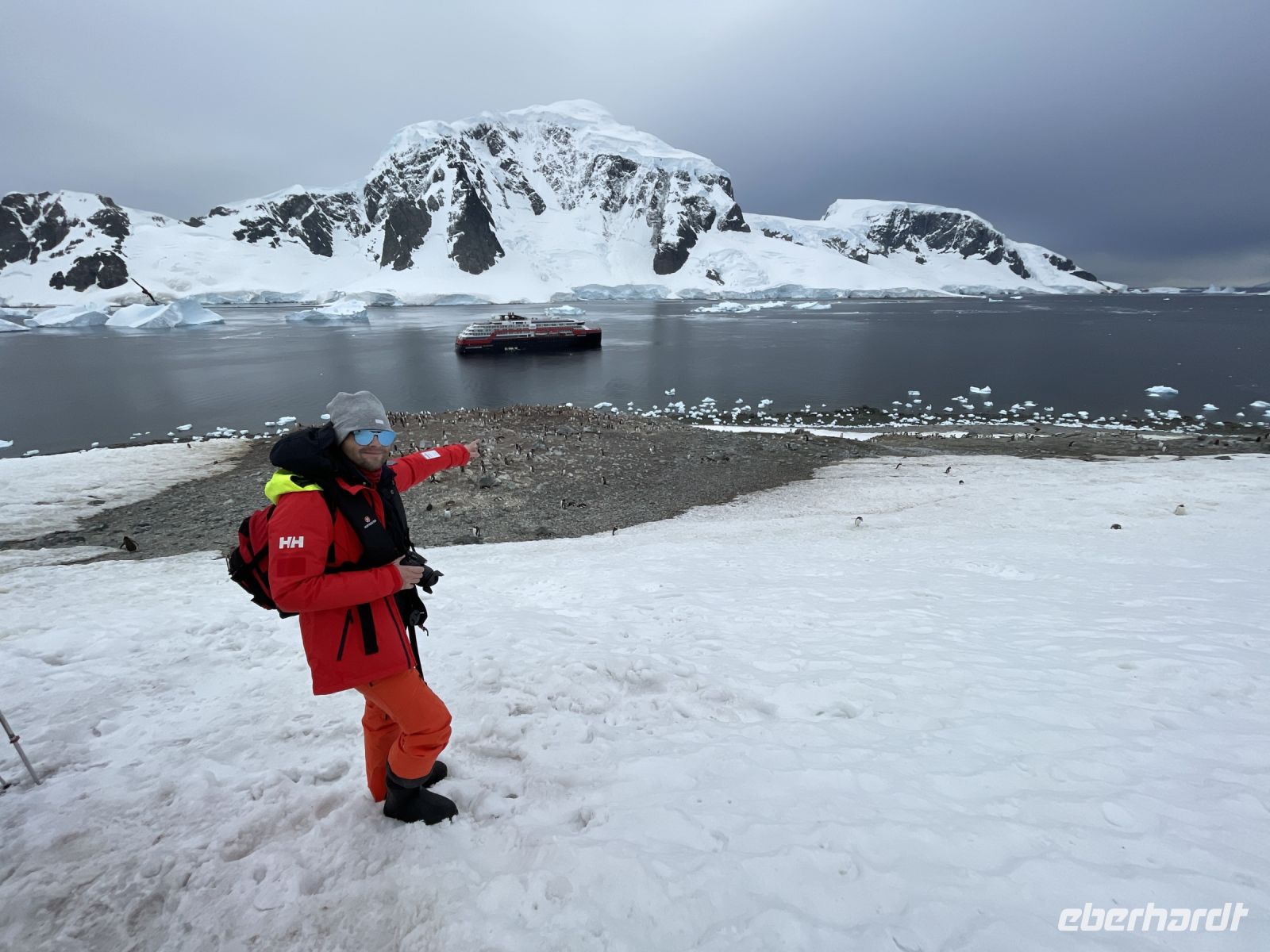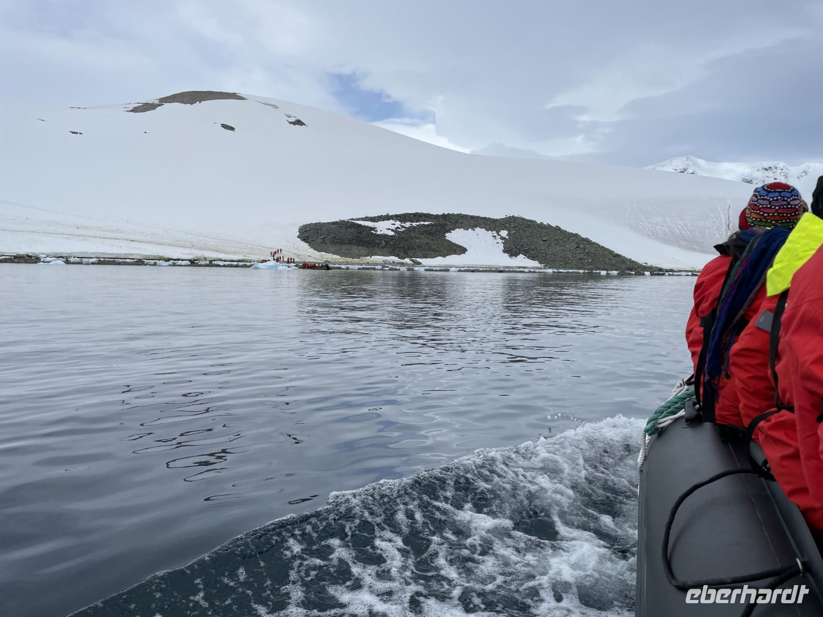 Gesagt getan… über die Bordlautsprecher erfahren wir, dass wir zuerst in die Wilhelmina Bay fahren, um dort Eisberge und Gletscher zu bestaunen und dann am Nachmittag in Danco Island an Land gehen. Nach dem Mittagessen geht es endlich los. Wir treffen uns alle dick angezogen und schwitzend auf Deck 3, um von der Expeditionslounge (neben der Schlauchbootgarage) aus in ein Zodiac-Schlauchboot zu steigen. Beim Verlassen und Betreten des Schiffs passieren wir immer die Stiefelreinigungsstation. Dann steigen wir ein und fahren ca. 5min. zur Anlandungsstelle. Alle sind sehr aufgeregt und die Vorfreude ist bei allen deutlich spürbar. Bei der Anlandung und beim Aussteigen ist das Expeditionsteam stets behilflich. Ein kleiner Schritt und dann haben wir es geschafft… unsere ersten Meter auf dem 7. Kontinent. Für viel Reisegäste ein ganz besonderer Moment, denn für die meisten ist die Antarktis der noch fehlende Kontinent in der Reisehistorie.