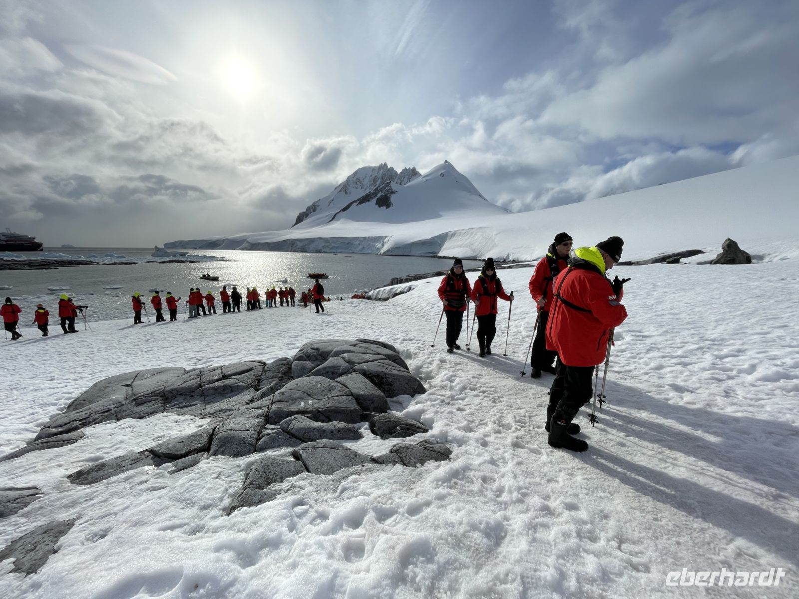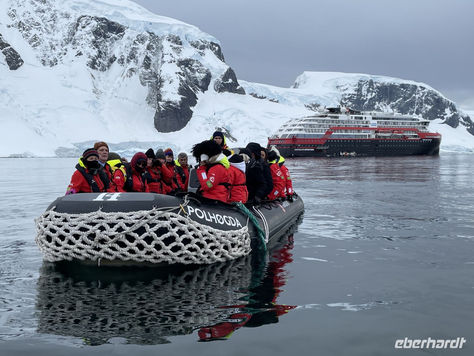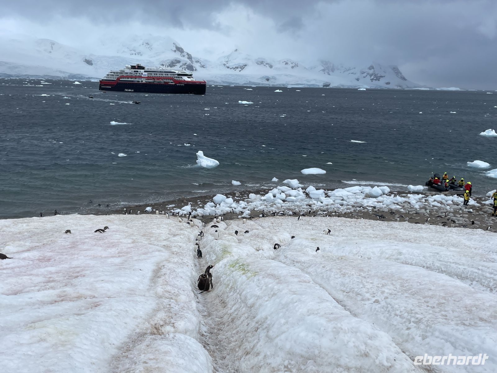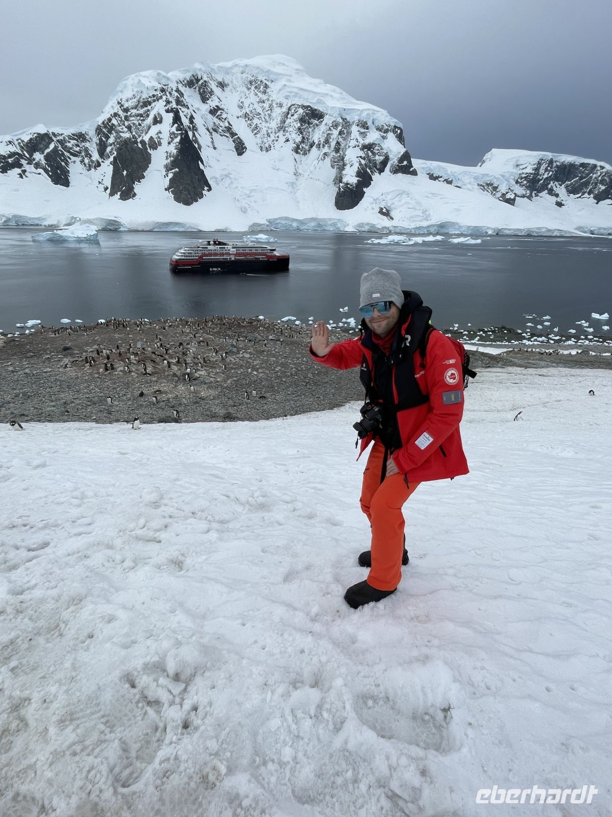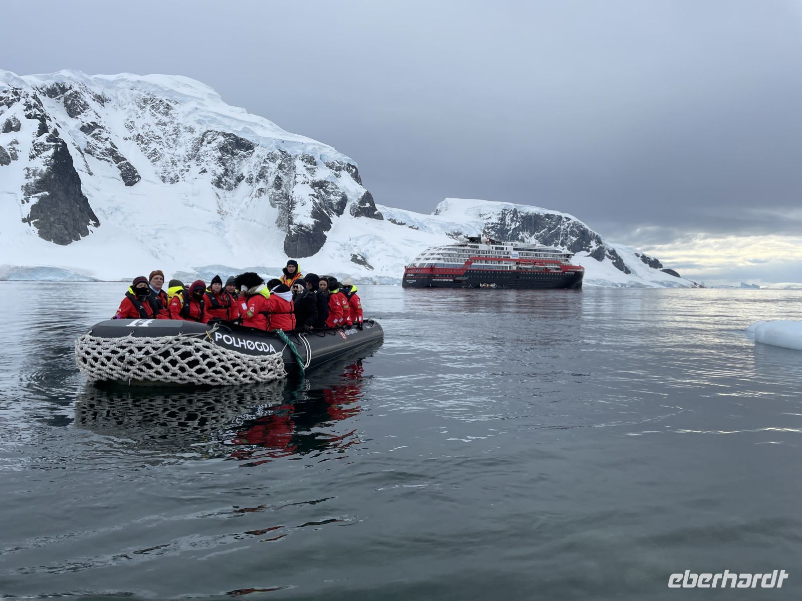 Gesagt getan… über die Bordlautsprecher erfahren wir, dass wir zuerst in die Wilhelmina Bay fahren, um dort Eisberge und Gletscher zu bestaunen und dann am Nachmittag in Danco Island an Land gehen. Nach dem Mittagessen geht es endlich los. Wir treffen uns alle dick angezogen und schwitzend auf Deck 3, um von der Expeditionslounge (neben der Schlauchbootgarage) aus in ein Zodiac-Schlauchboot zu steigen. Beim Verlassen und Betreten des Schiffs passieren wir immer die Stiefelreinigungsstation. Dann steigen wir ein und fahren ca. 5min. zur Anlandungsstelle. Alle sind sehr aufgeregt und die Vorfreude ist bei allen deutlich spürbar. Bei der Anlandung und beim Aussteigen ist das Expeditionsteam stets behilflich. Ein kleiner Schritt und dann haben wir es geschafft… unsere ersten Meter auf dem 7. Kontinent. Für viel Reisegäste ein ganz besonderer Moment, denn für die meisten ist die Antarktis der noch fehlende Kontinent in der Reisehistorie.