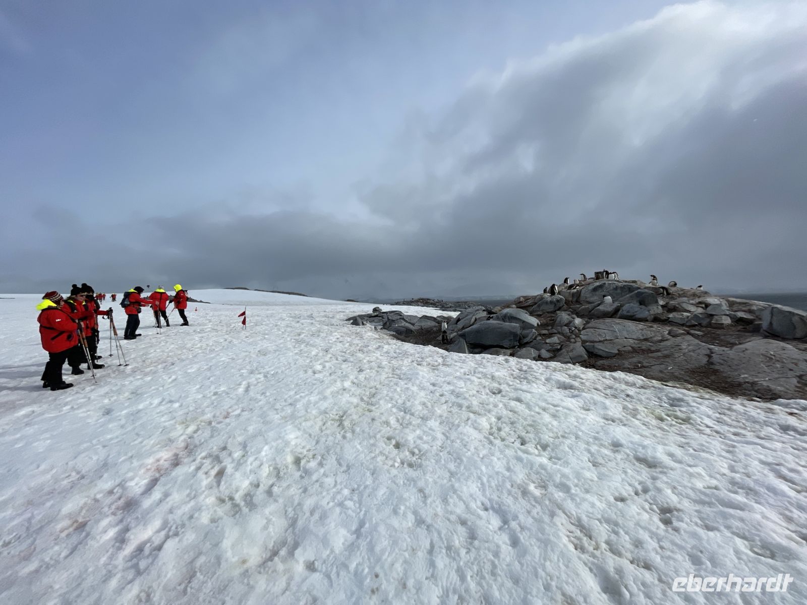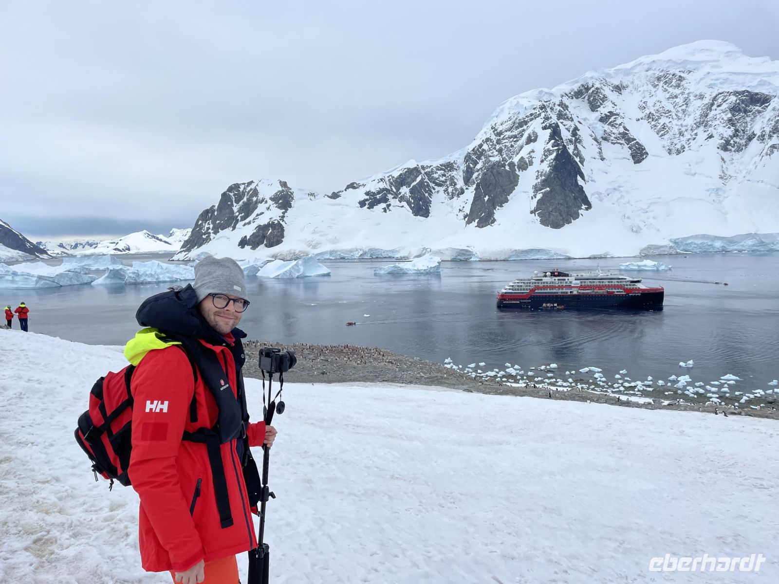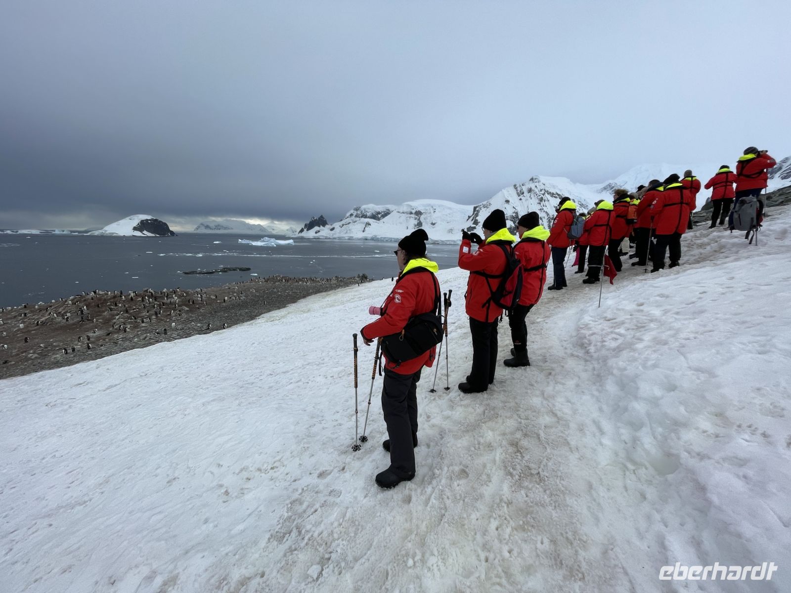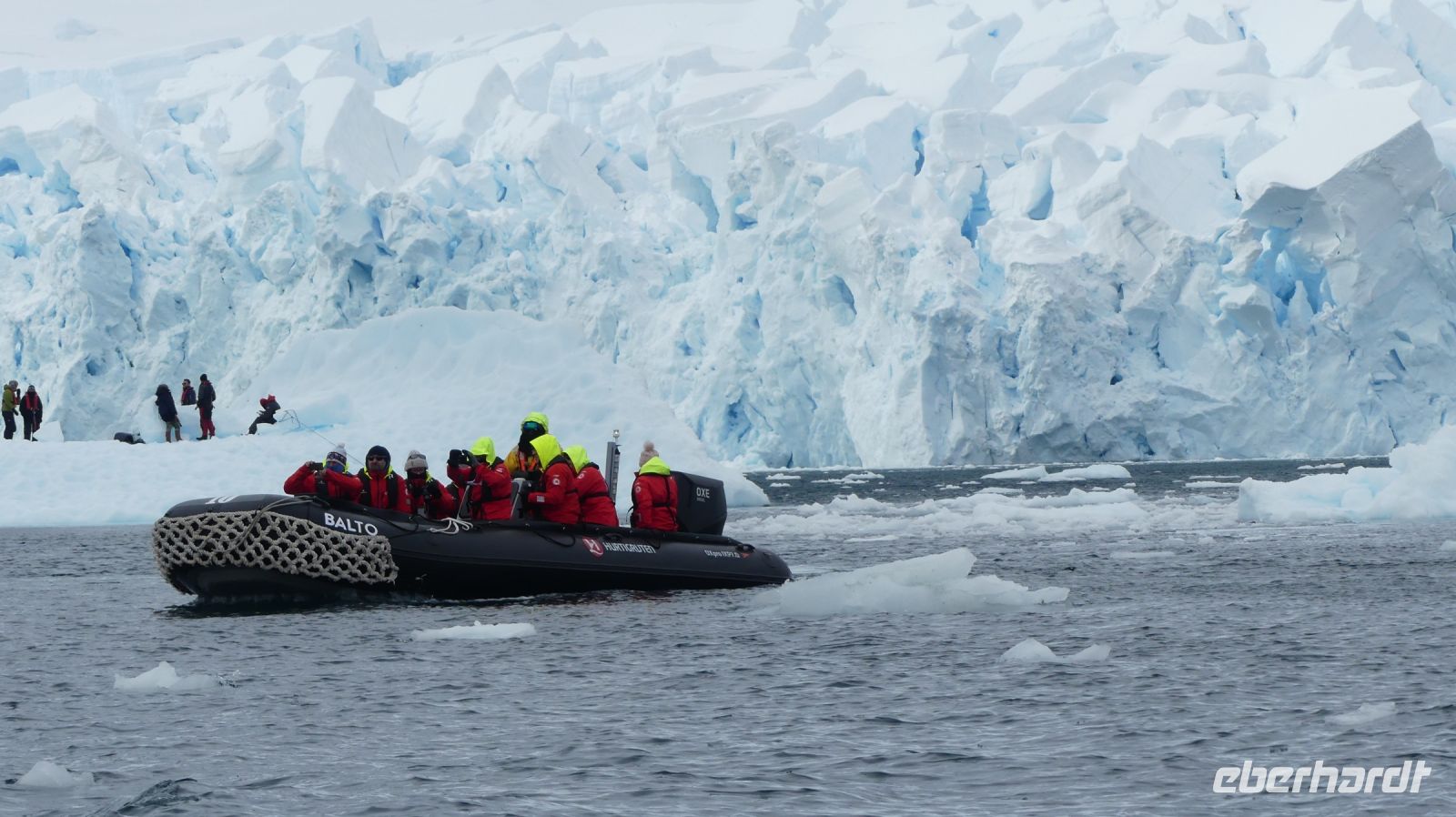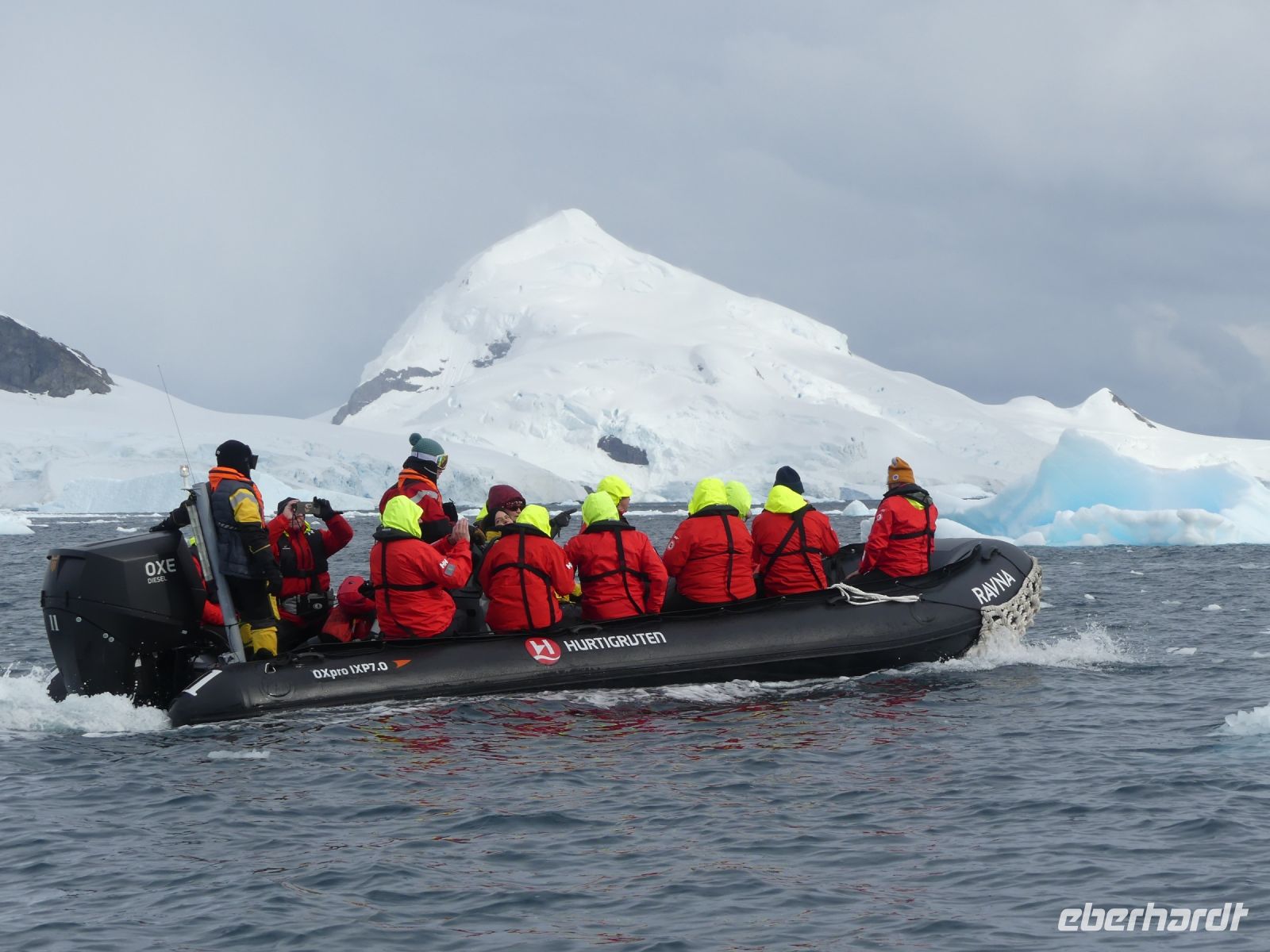 Gesagt getan… über die Bordlautsprecher erfahren wir, dass wir zuerst in die Wilhelmina Bay fahren, um dort Eisberge und Gletscher zu bestaunen und dann am Nachmittag in Danco Island an Land gehen. Nach dem Mittagessen geht es endlich los. Wir treffen uns alle dick angezogen und schwitzend auf Deck 3, um von der Expeditionslounge (neben der Schlauchbootgarage) aus in ein Zodiac-Schlauchboot zu steigen. Beim Verlassen und Betreten des Schiffs passieren wir immer die Stiefelreinigungsstation. Dann steigen wir ein und fahren ca. 5min. zur Anlandungsstelle. Alle sind sehr aufgeregt und die Vorfreude ist bei allen deutlich spürbar. Bei der Anlandung und beim Aussteigen ist das Expeditionsteam stets behilflich. Ein kleiner Schritt und dann haben wir es geschafft… unsere ersten Meter auf dem 7. Kontinent. Für viel Reisegäste ein ganz besonderer Moment, denn für die meisten ist die Antarktis der noch fehlende Kontinent in der Reisehistorie.