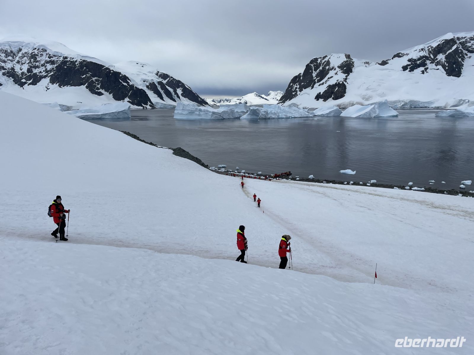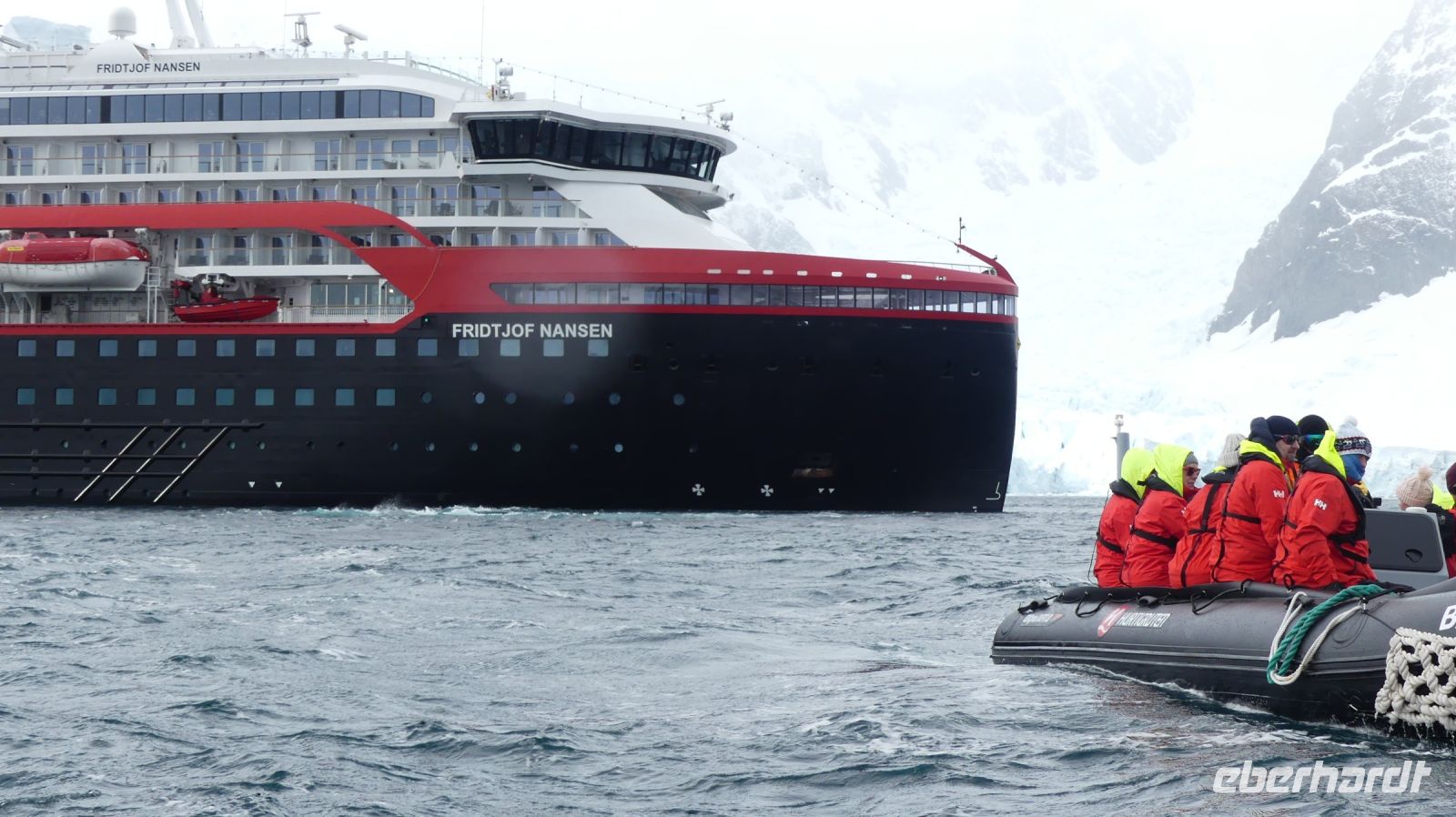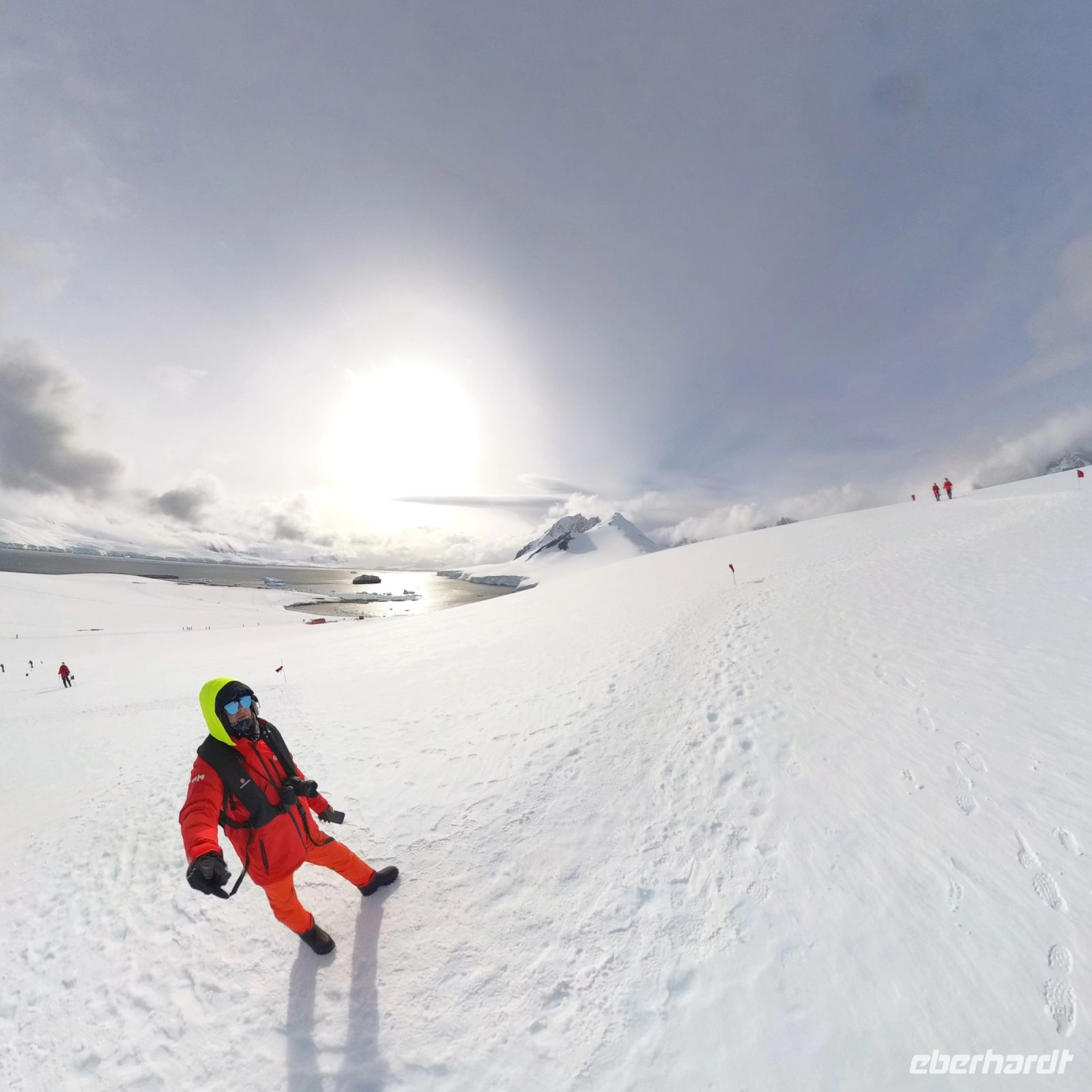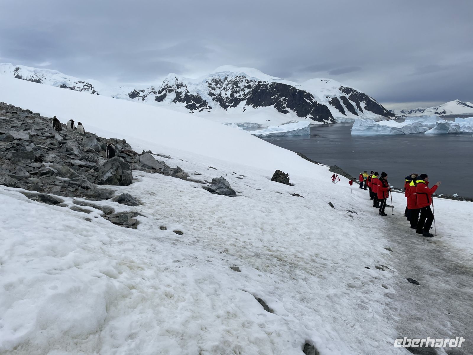 Gesagt getan… über die Bordlautsprecher erfahren wir, dass wir zuerst in die Wilhelmina Bay fahren, um dort Eisberge und Gletscher zu bestaunen und dann am Nachmittag in Danco Island an Land gehen. Nach dem Mittagessen geht es endlich los. Wir treffen uns alle dick angezogen und schwitzend auf Deck 3, um von der Expeditionslounge (neben der Schlauchbootgarage) aus in ein Zodiac-Schlauchboot zu steigen. Beim Verlassen und Betreten des Schiffs passieren wir immer die Stiefelreinigungsstation. Dann steigen wir ein und fahren ca. 5min. zur Anlandungsstelle. Alle sind sehr aufgeregt und die Vorfreude ist bei allen deutlich spürbar. Bei der Anlandung und beim Aussteigen ist das Expeditionsteam stets behilflich. Ein kleiner Schritt und dann haben wir es geschafft… unsere ersten Meter auf dem 7. Kontinent. Für viel Reisegäste ein ganz besonderer Moment, denn für die meisten ist die Antarktis der noch fehlende Kontinent in der Reisehistorie.