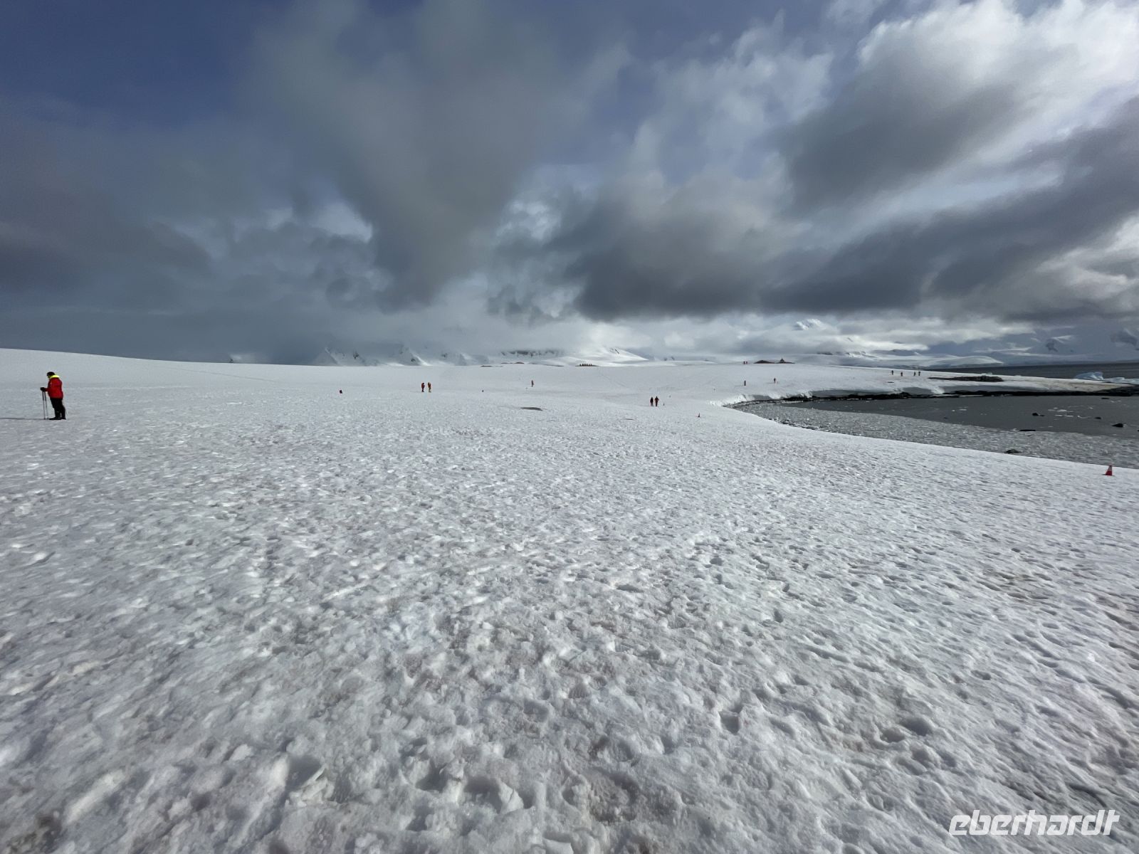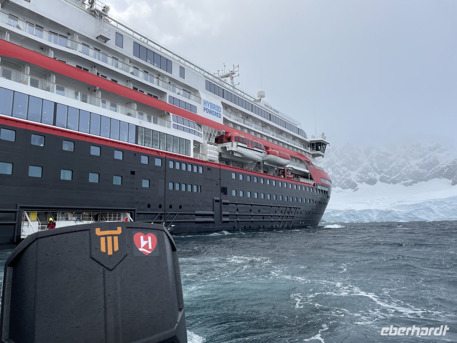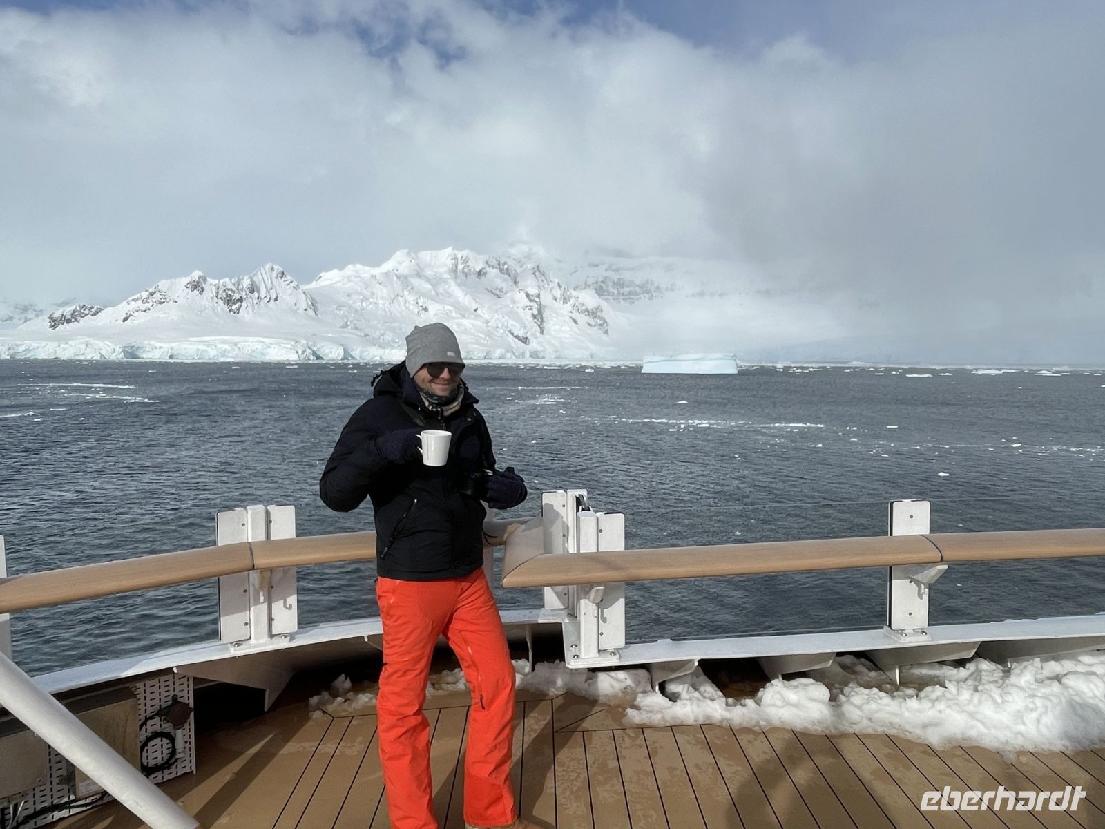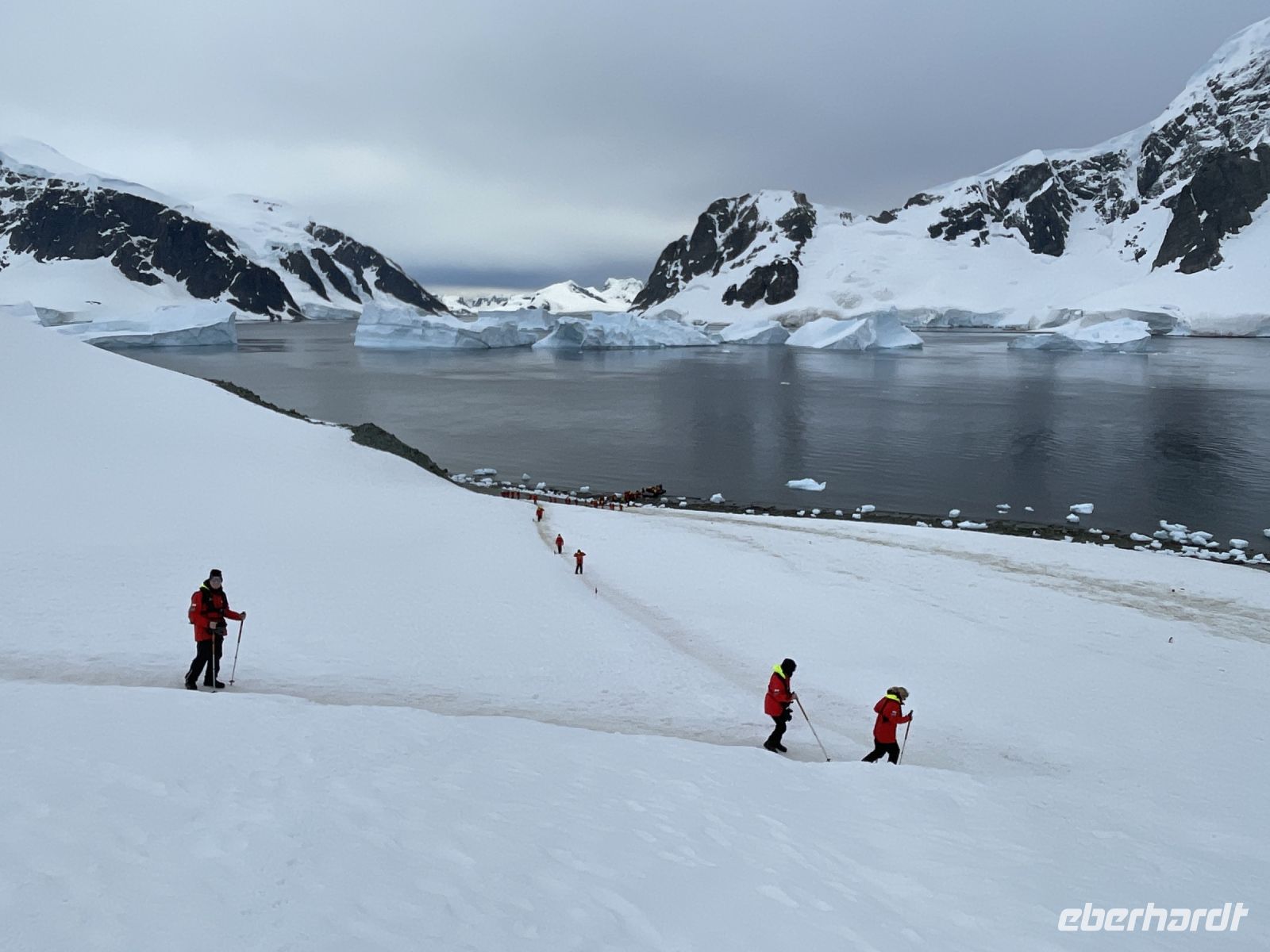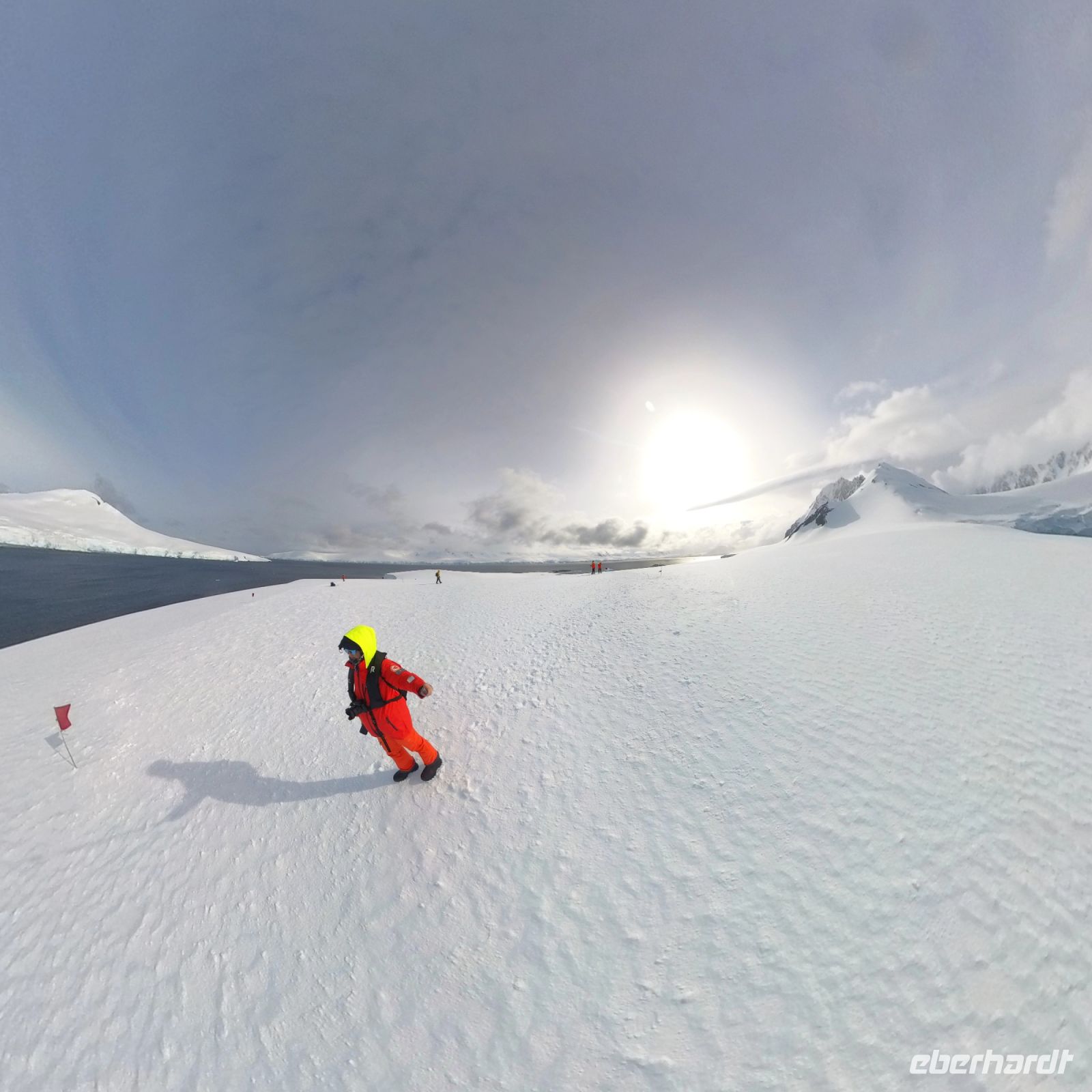 Gesagt getan… über die Bordlautsprecher erfahren wir, dass wir zuerst in die Wilhelmina Bay fahren, um dort Eisberge und Gletscher zu bestaunen und dann am Nachmittag in Danco Island an Land gehen. Nach dem Mittagessen geht es endlich los. Wir treffen uns alle dick angezogen und schwitzend auf Deck 3, um von der Expeditionslounge (neben der Schlauchbootgarage) aus in ein Zodiac-Schlauchboot zu steigen. Beim Verlassen und Betreten des Schiffs passieren wir immer die Stiefelreinigungsstation. Dann steigen wir ein und fahren ca. 5min. zur Anlandungsstelle. Alle sind sehr aufgeregt und die Vorfreude ist bei allen deutlich spürbar. Bei der Anlandung und beim Aussteigen ist das Expeditionsteam stets behilflich. Ein kleiner Schritt und dann haben wir es geschafft… unsere ersten Meter auf dem 7. Kontinent. Für viel Reisegäste ein ganz besonderer Moment, denn für die meisten ist die Antarktis der noch fehlende Kontinent in der Reisehistorie.